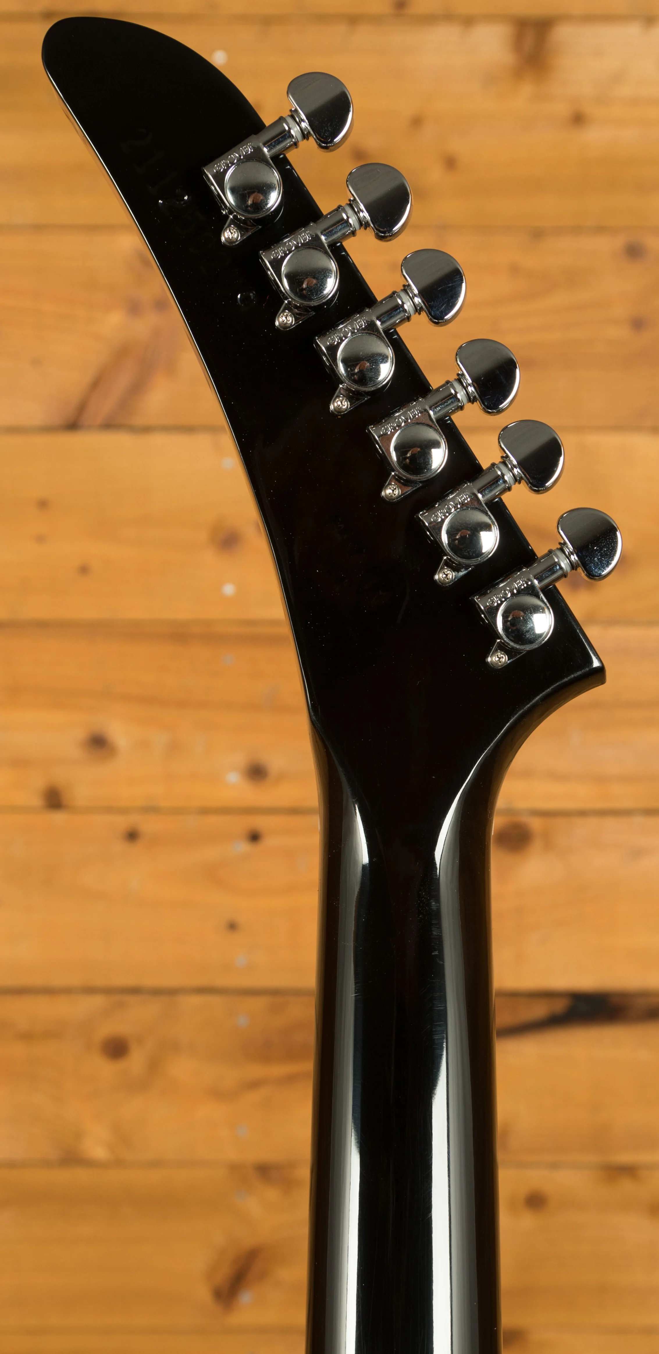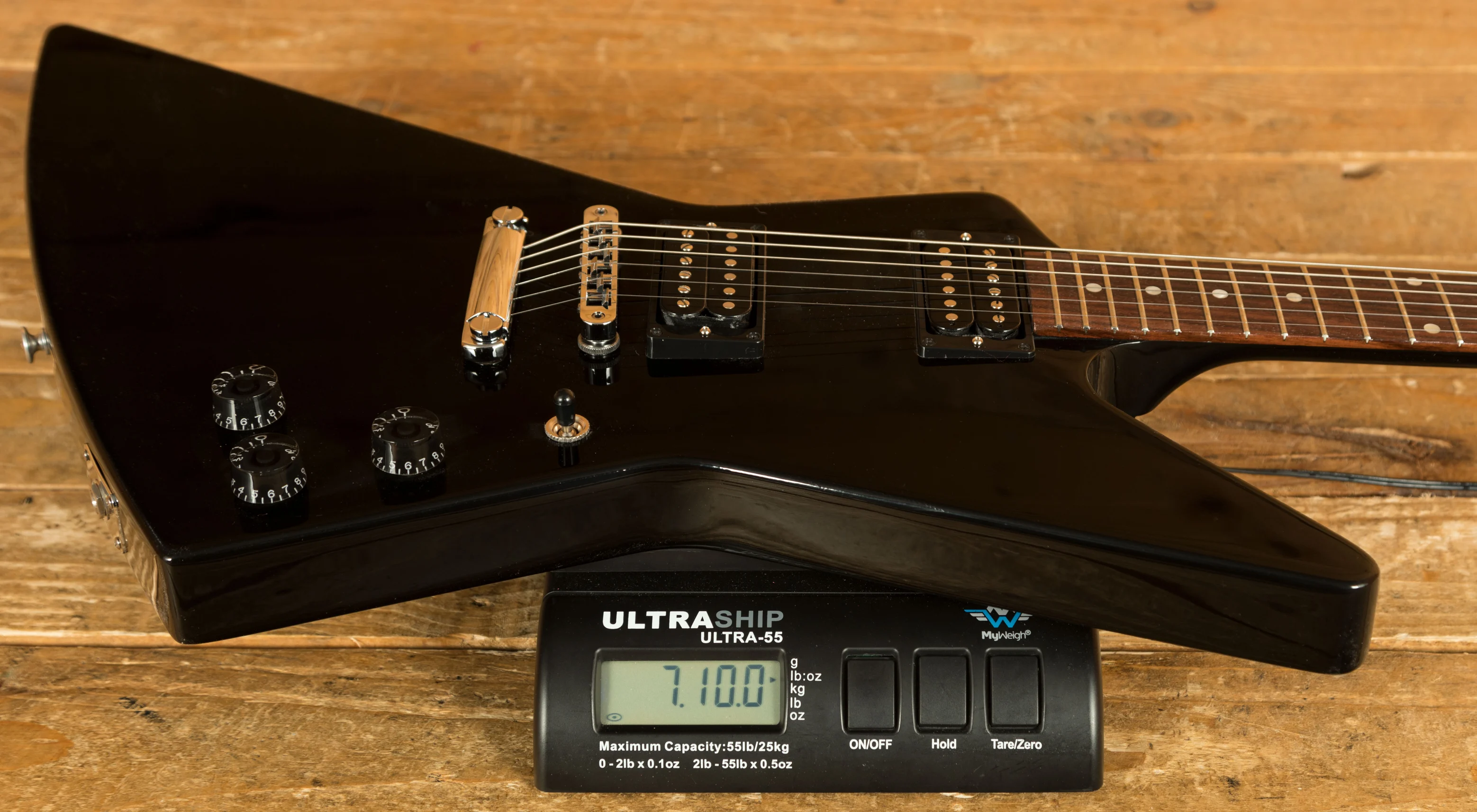 The trail-blazing Explorer body is crafted from solid Mahogany for a deep, resonant tone, perfect for embracing the heavier side of life, the body is really nicely weighted and balanced. It’s finished in a stunning Ebony Nitro lacquer, it looks super slick.
