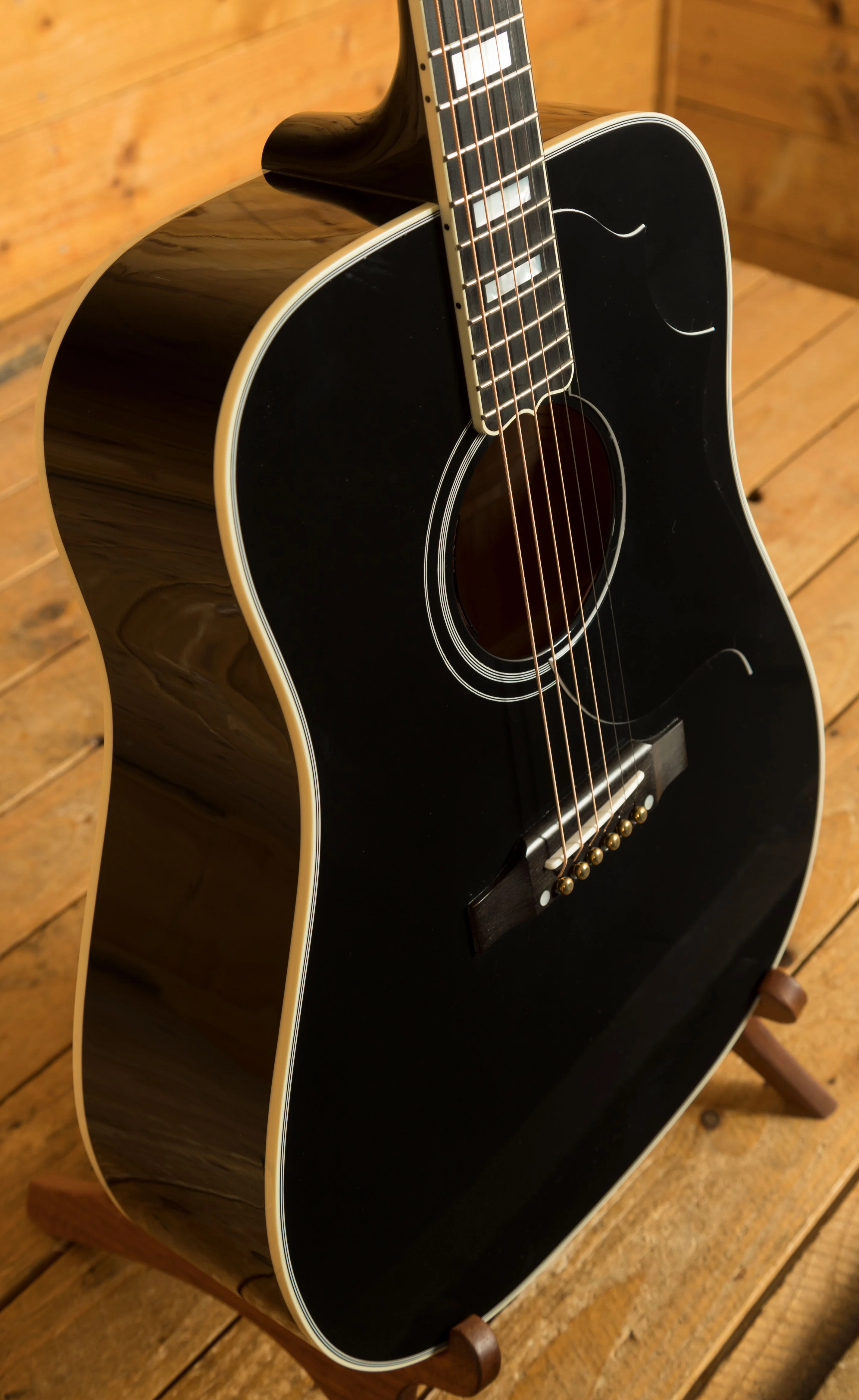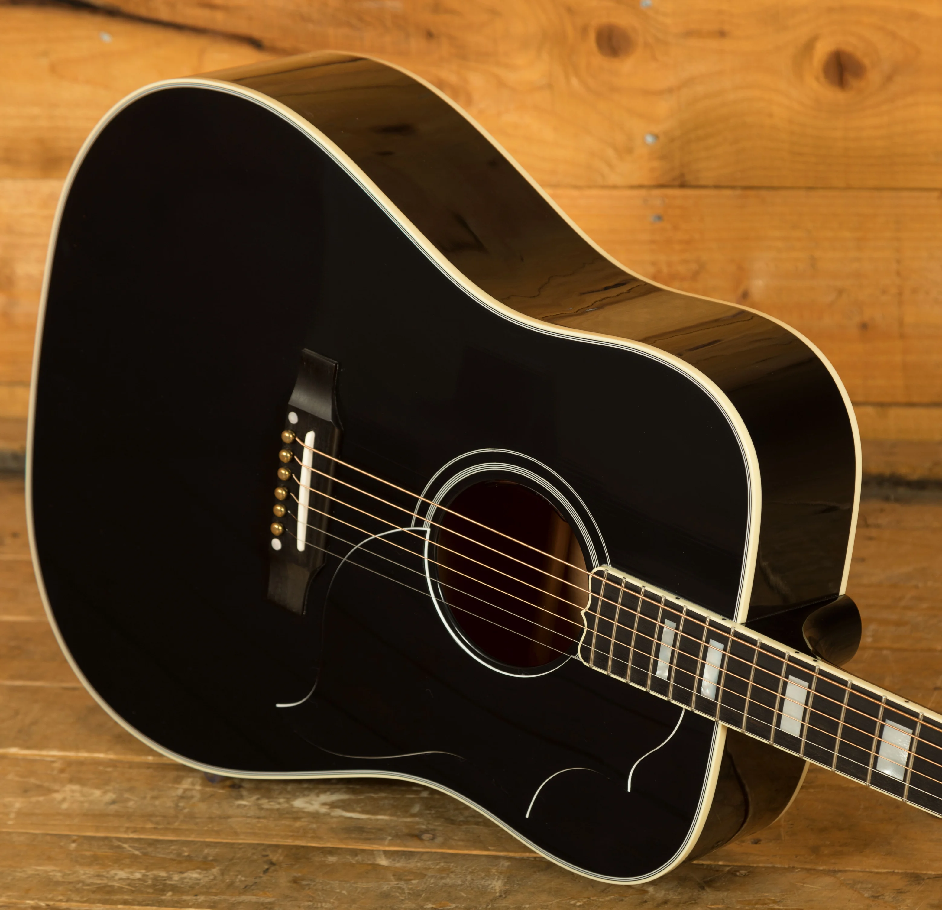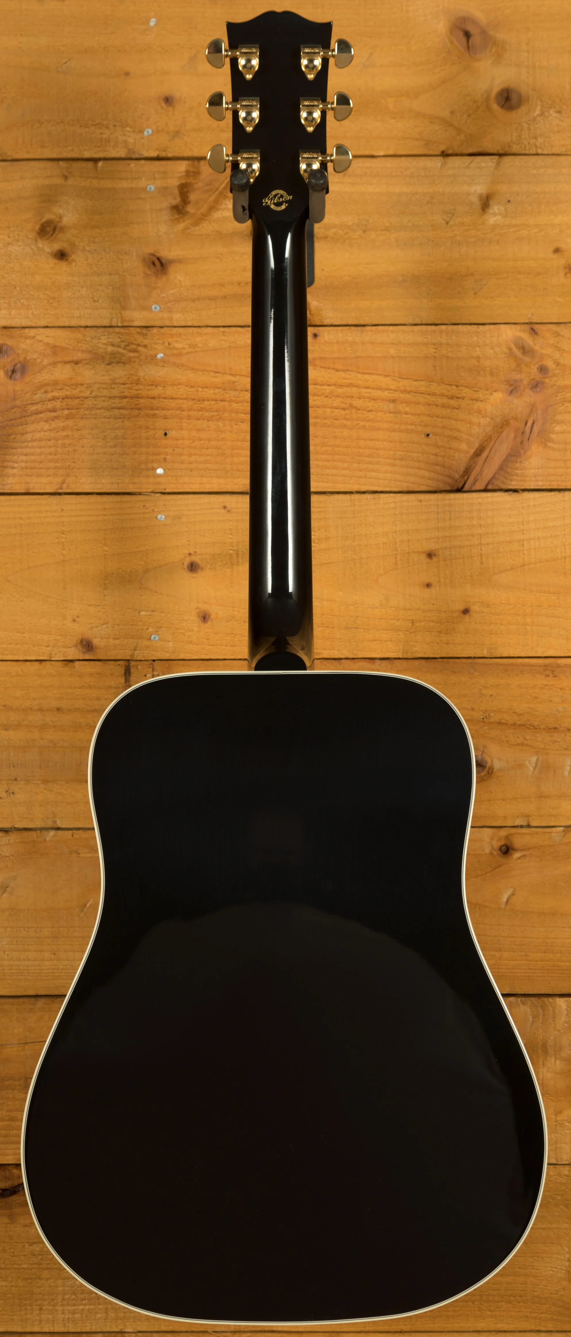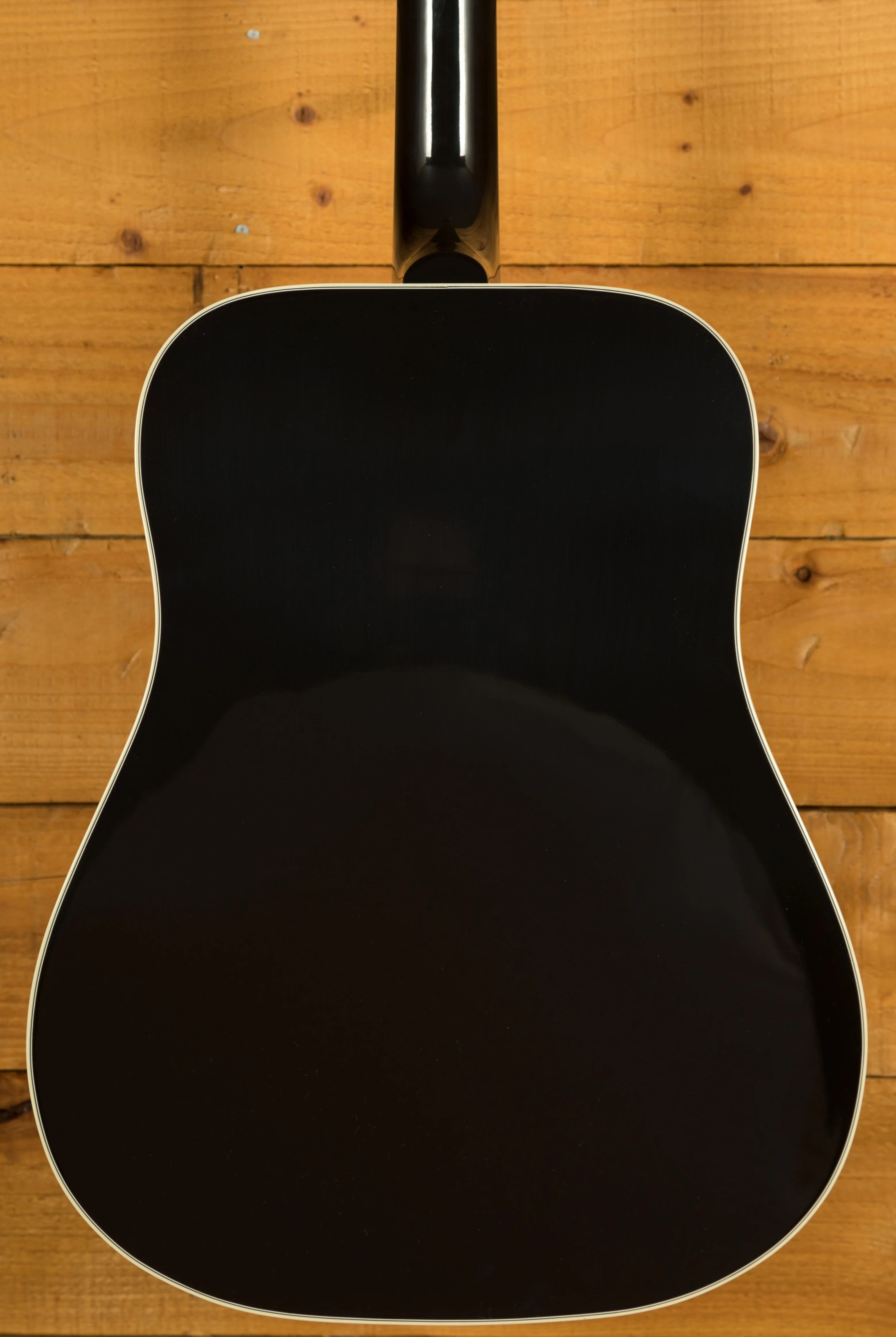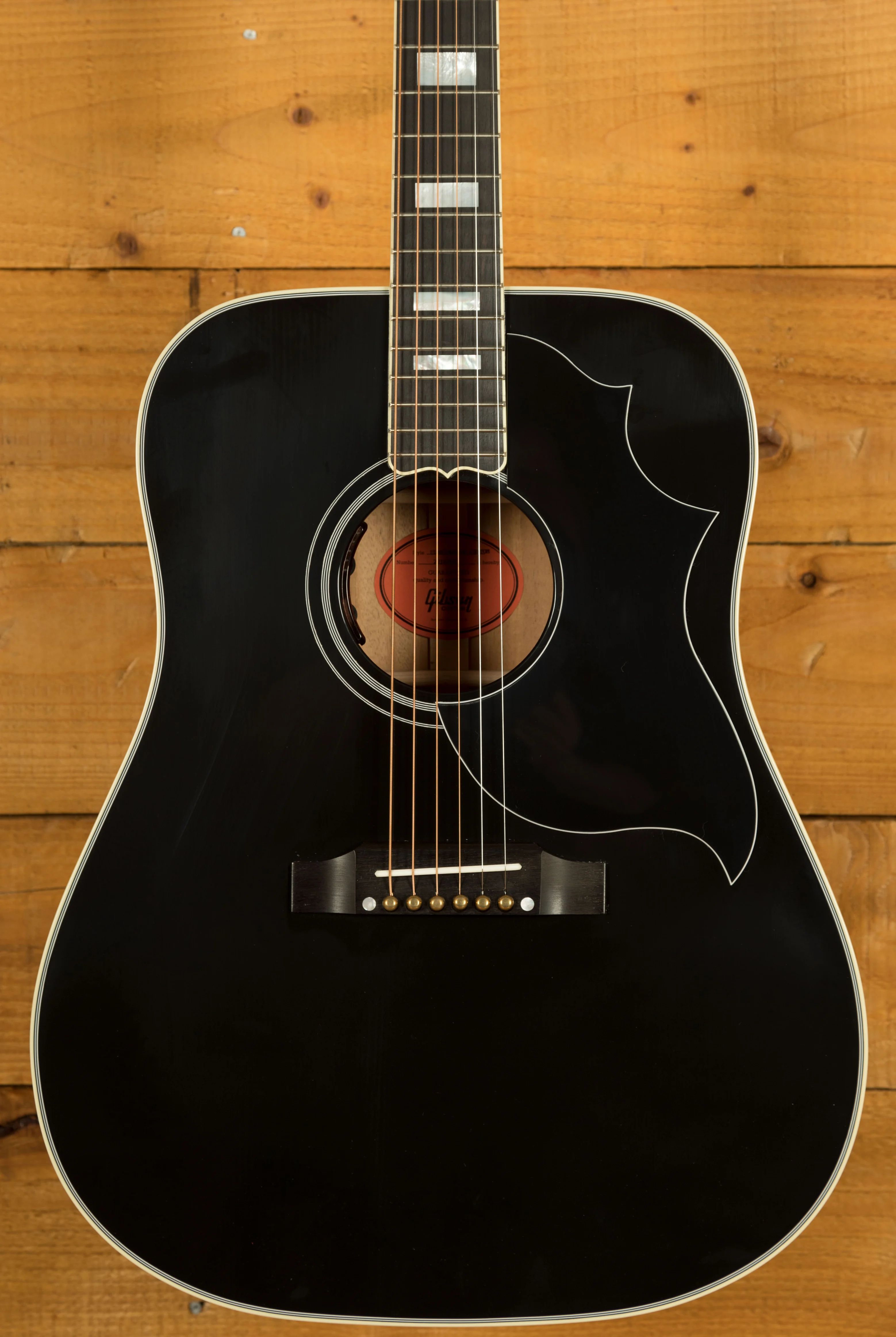 Aesthetically, the Hummingbird Custom Ebony distinguishes itself with a striking ebony nitrocellulose lacquer finish. Multi-ply binding on the top, back, and headstock adds an elegant touch, while the bound ebony fretboard further enhances the guitar's refined look. The headstock showcases a Les Paul-style design with a Custom split diamond inlay in mother of pearl, setting it apart from the standard Hummingbird. Gold Grover Rotomatic tuners provide precise and stable tuning.