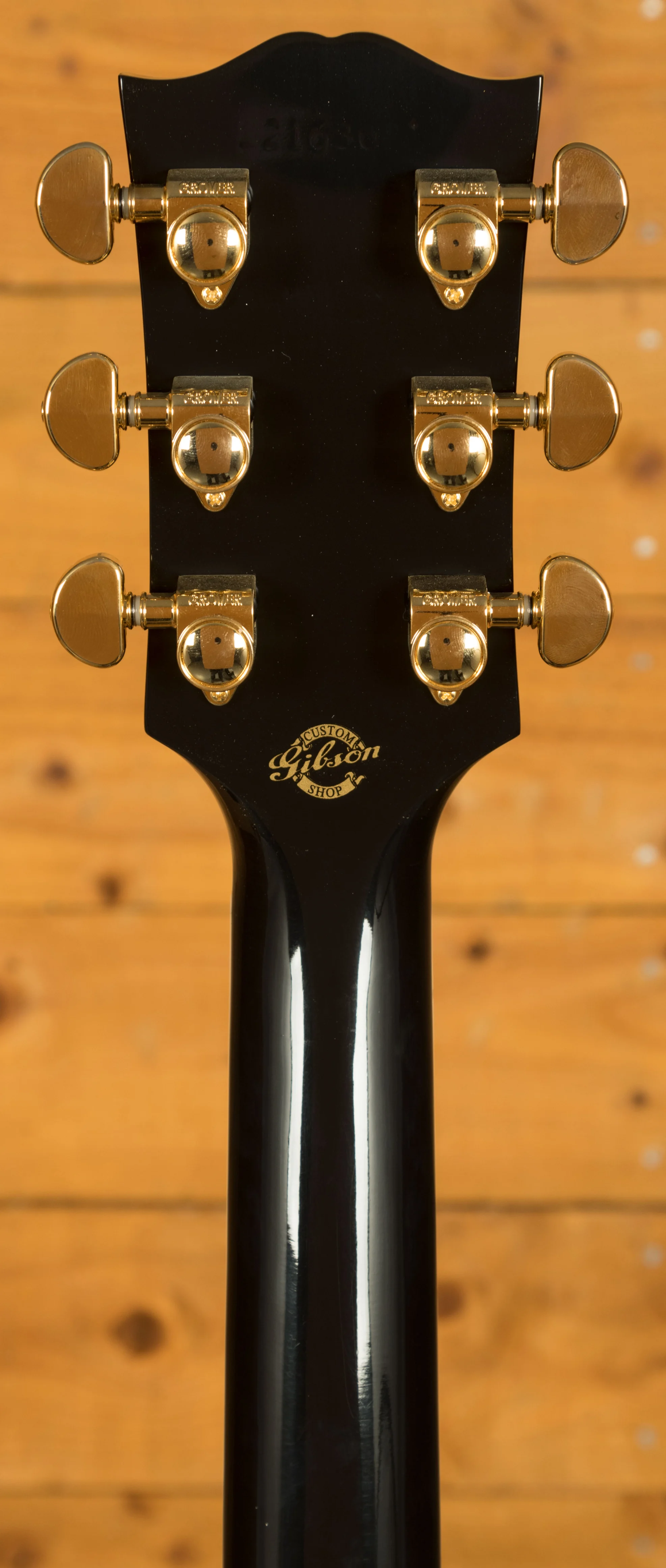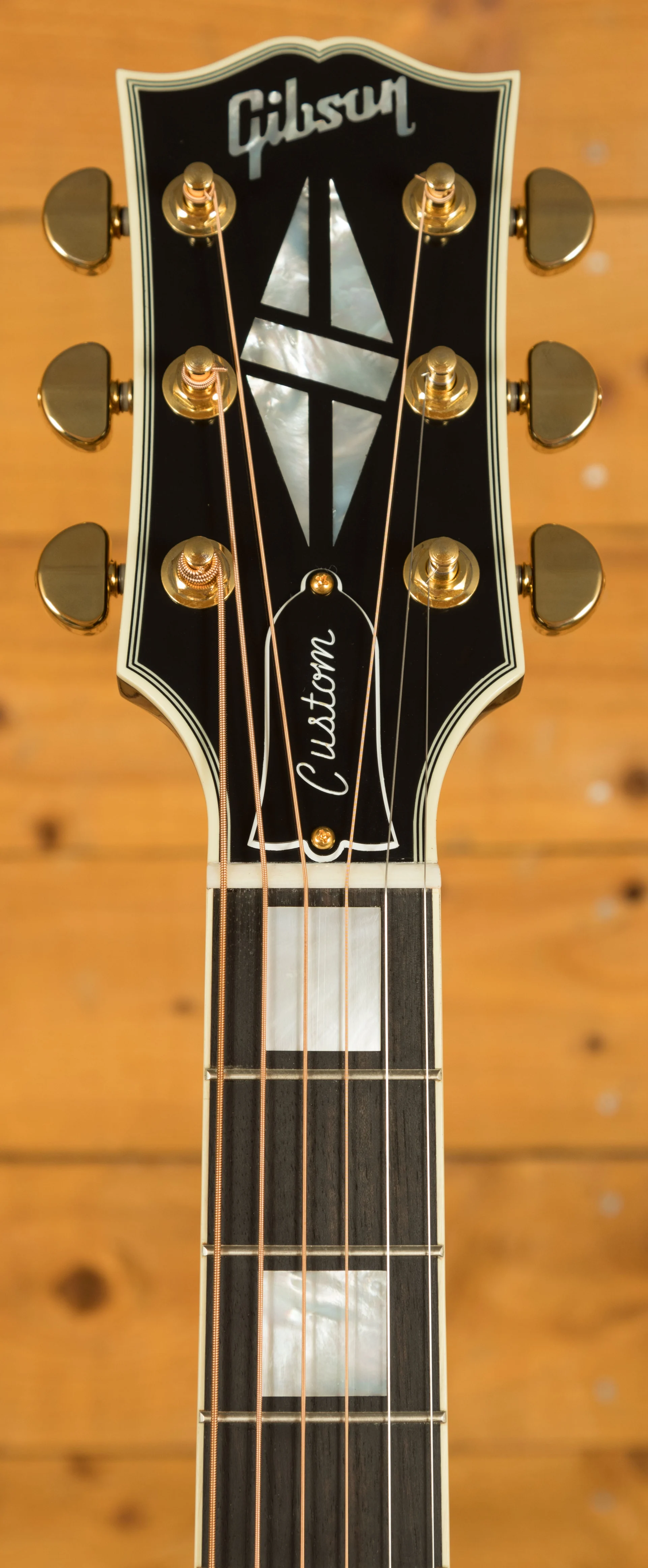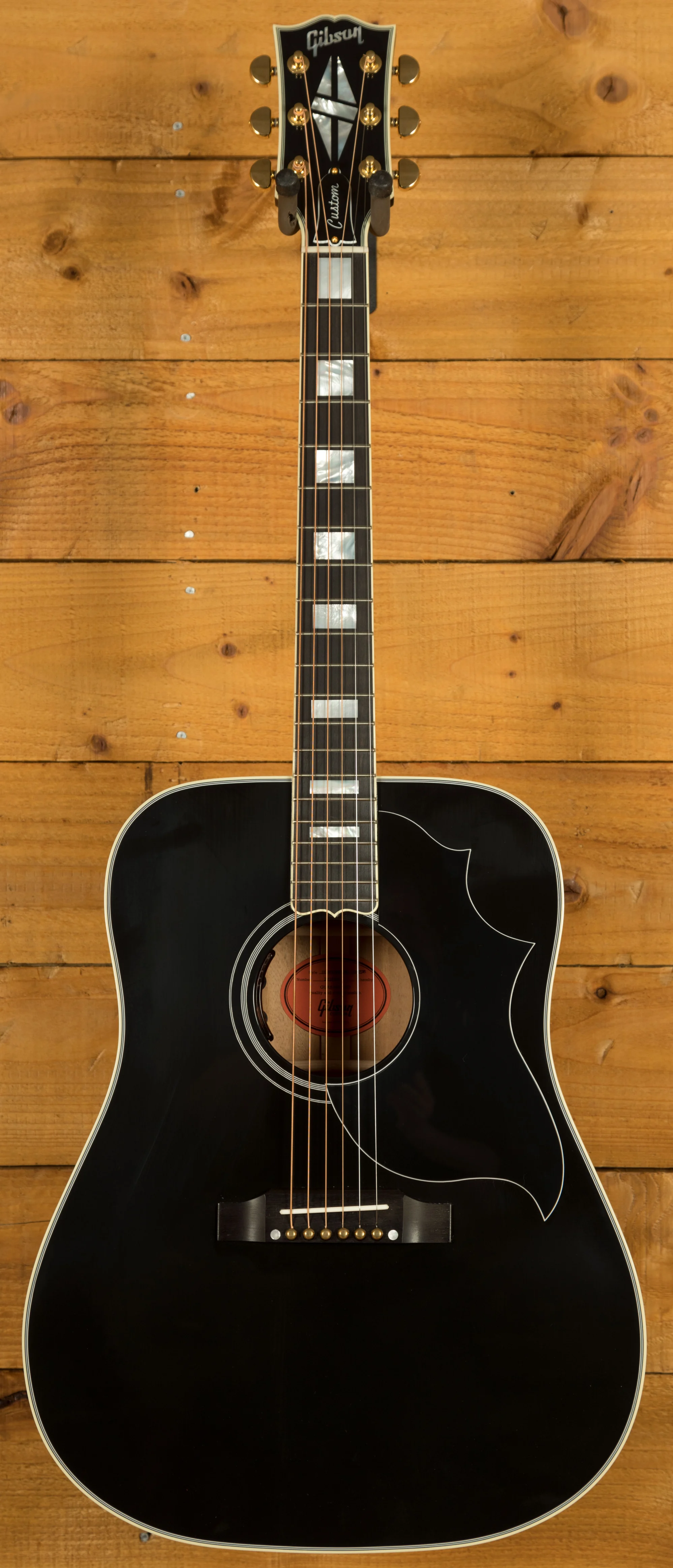 The Gibson Hummingbird Custom Ebony takes the classic Hummingbird design and incorporates features inspired by the Les Paul Custom. This guitar starts with the established Hummingbird foundation: a solid Sitka spruce top for balanced tone and projection, and mahogany back and sides for warmth and richness. The 24.75" scale mahogany neck features a comfortable, rounded profile, making it suitable for a variety of playing styles. The ebony fingerboard, known for its smooth feel and clear tone, is bound and adorned with mother-of-pearl Custom Block inlays.