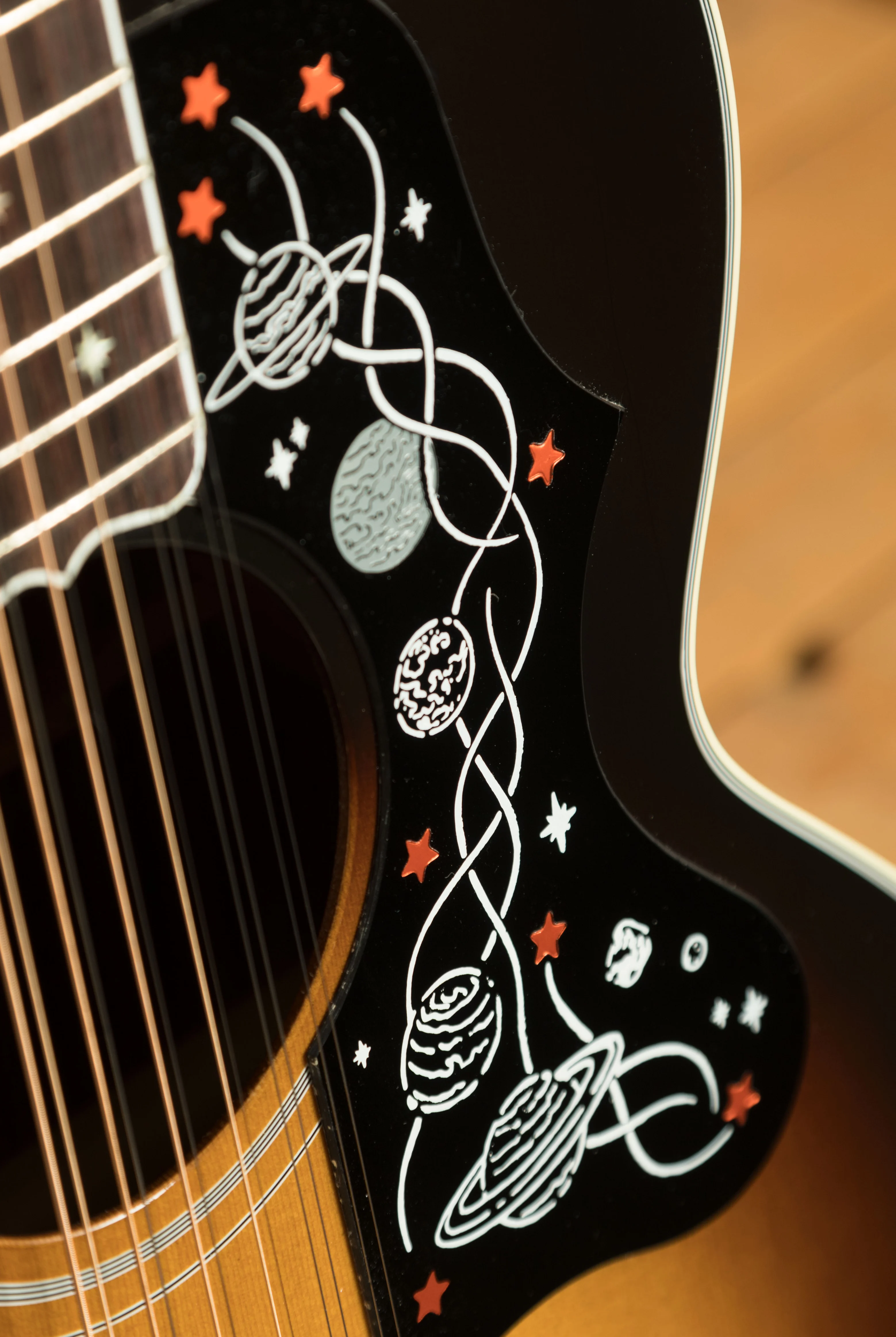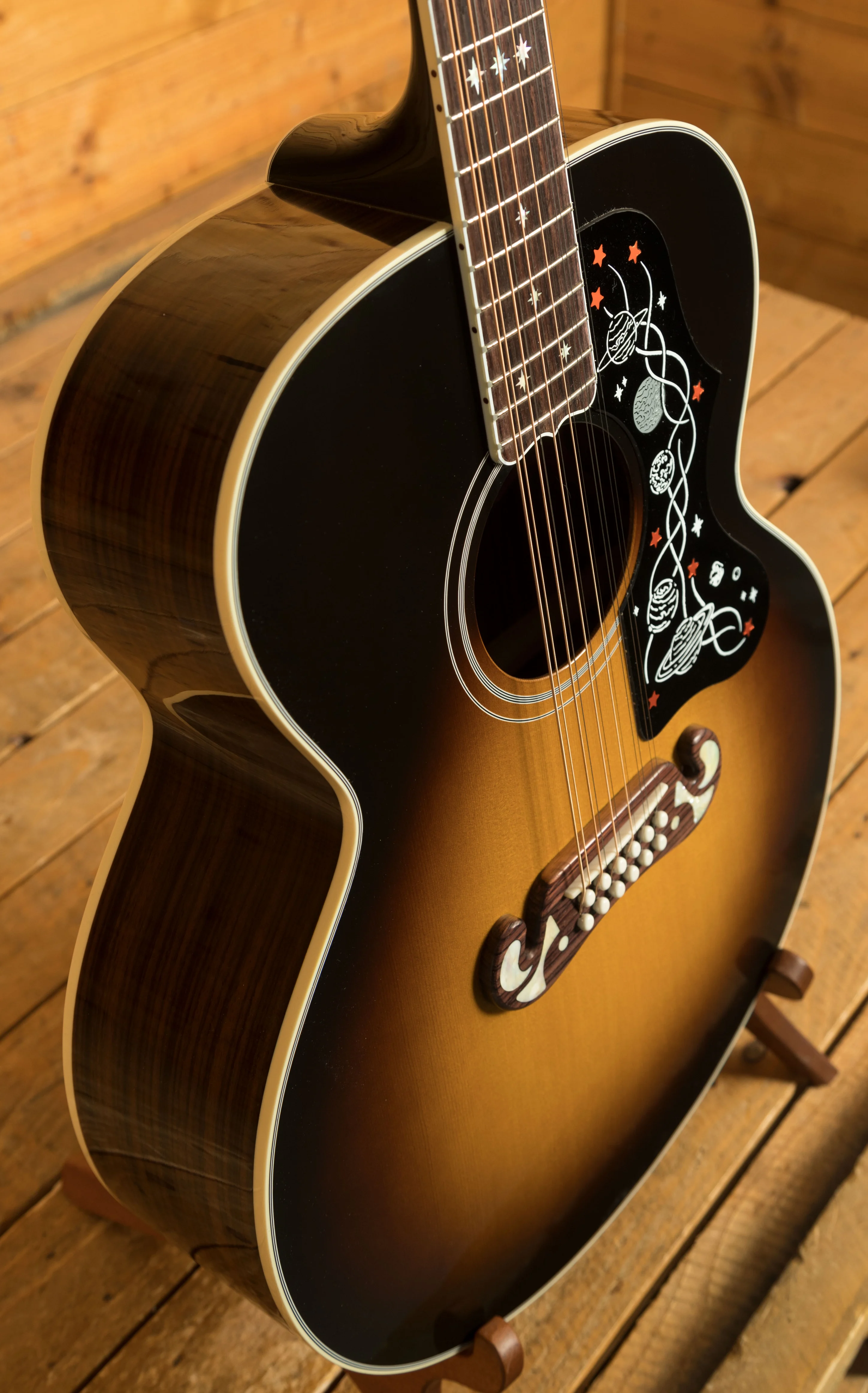 With a solid 3A Sitka Spruce top, paired up with solid 3A Indian Rosewood back & sides, this acoustic features a unique voicing with loads of clarity and warmth. It’s super clear, and extremely dynamic to your every touch. If you back off and play gently, the guitar will support you and work with you. The traditional Gibson Vintage Sunburst nitrocellulose finish looks super slick, if you’re a fan of classic Gibson design, then you’re sure to love it. One of the most interest facts about Brian is that he has a doctorate degree in astrophysics, something we achieved a few years back in 2007. Brian’s love for astronomy is reflected in the guitar, it features a unique planetary-themed pickguard, which is a really nice touch.
