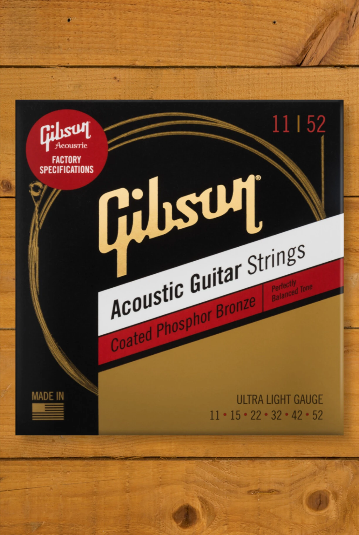 The Gibson Coated Phosphor Bronze Ultra-Light Strings (11-52) are the same strings used on Gibson acoustics straight from the factory in Bozeman, Montana. Developed and approved by Gibson's master luthiers, these strings are built for clarity, warmth and durability, making them a perfect match for any high-quality acoustic guitar.