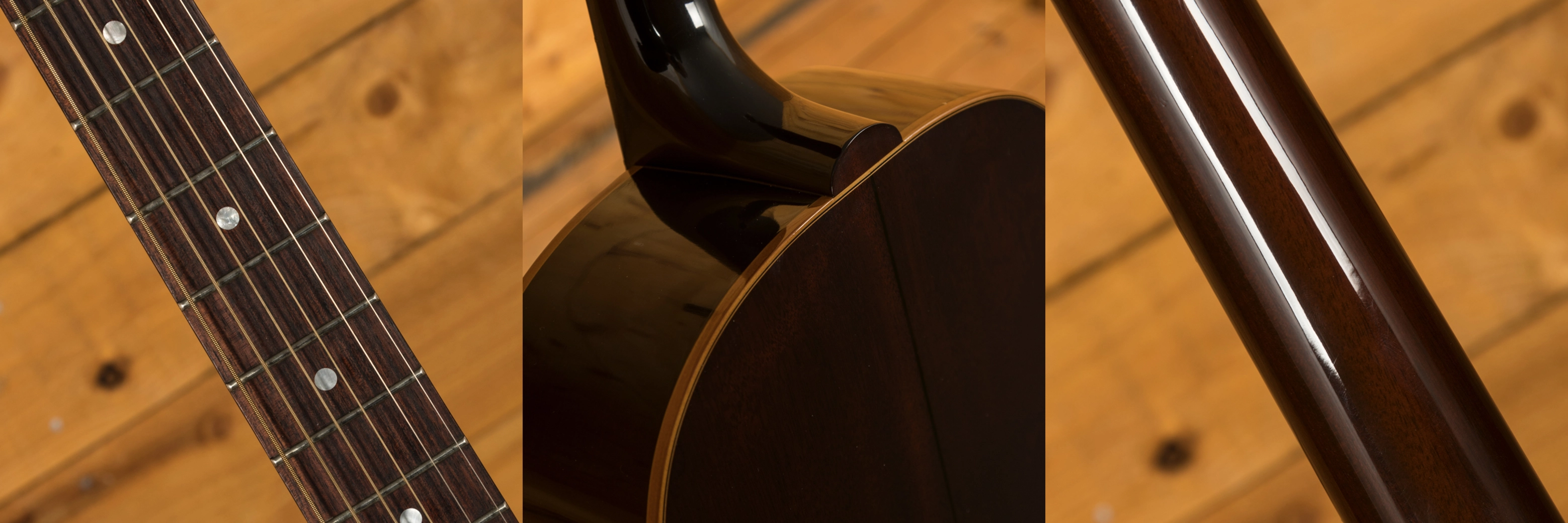 The Mahogany neck is super comfortable and great for both bold chordal work and subtle fingerstyle playing. The Madagascar Rosewood fingerboard is smooth and feels great underhand.