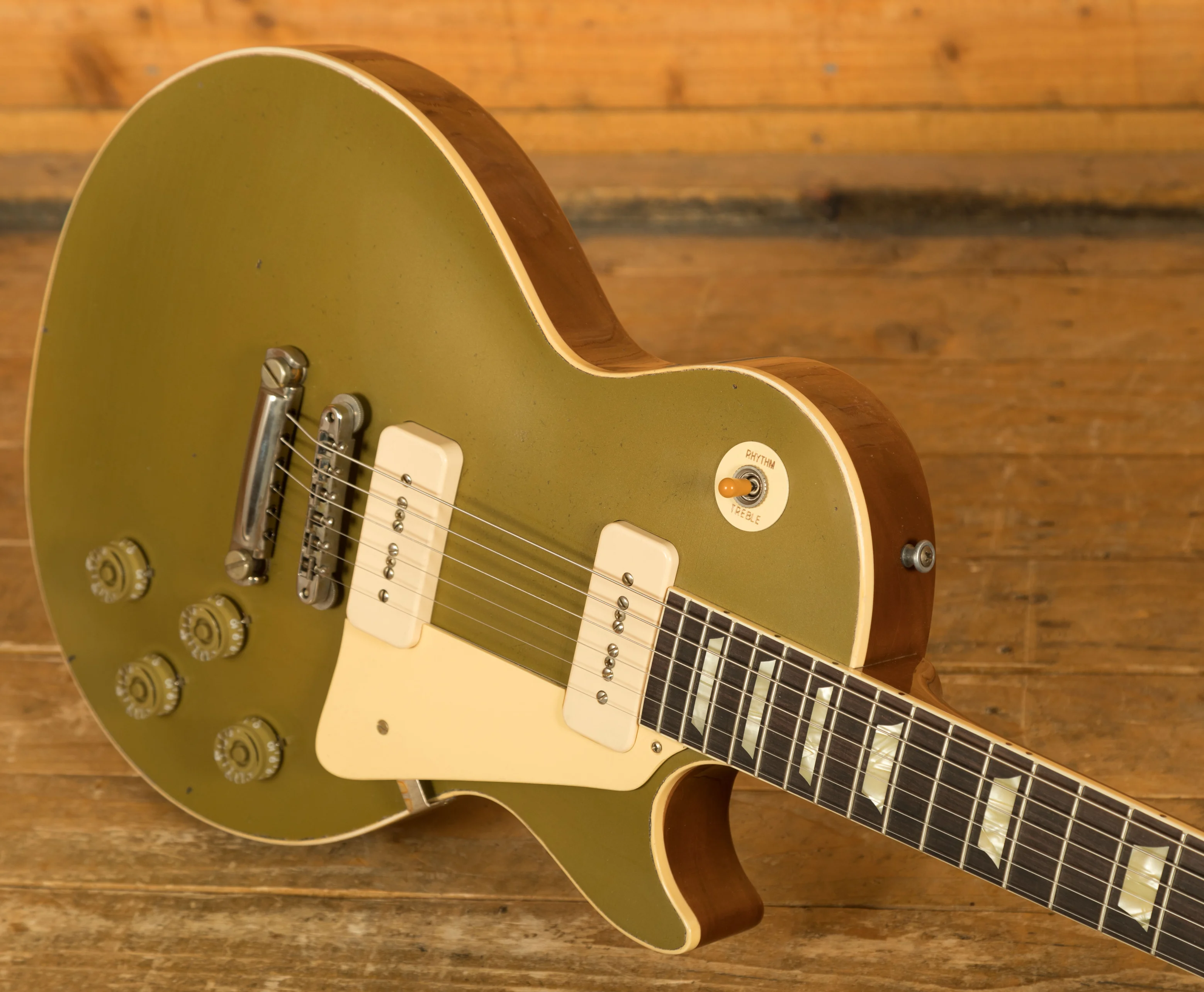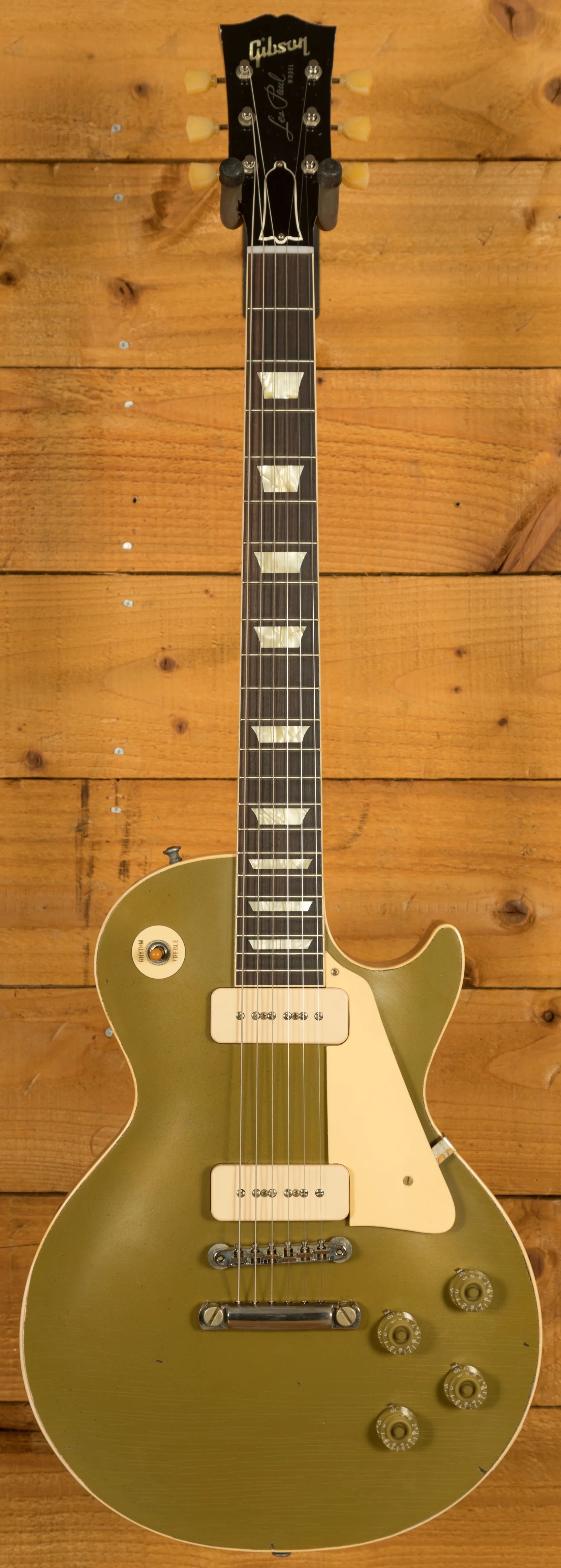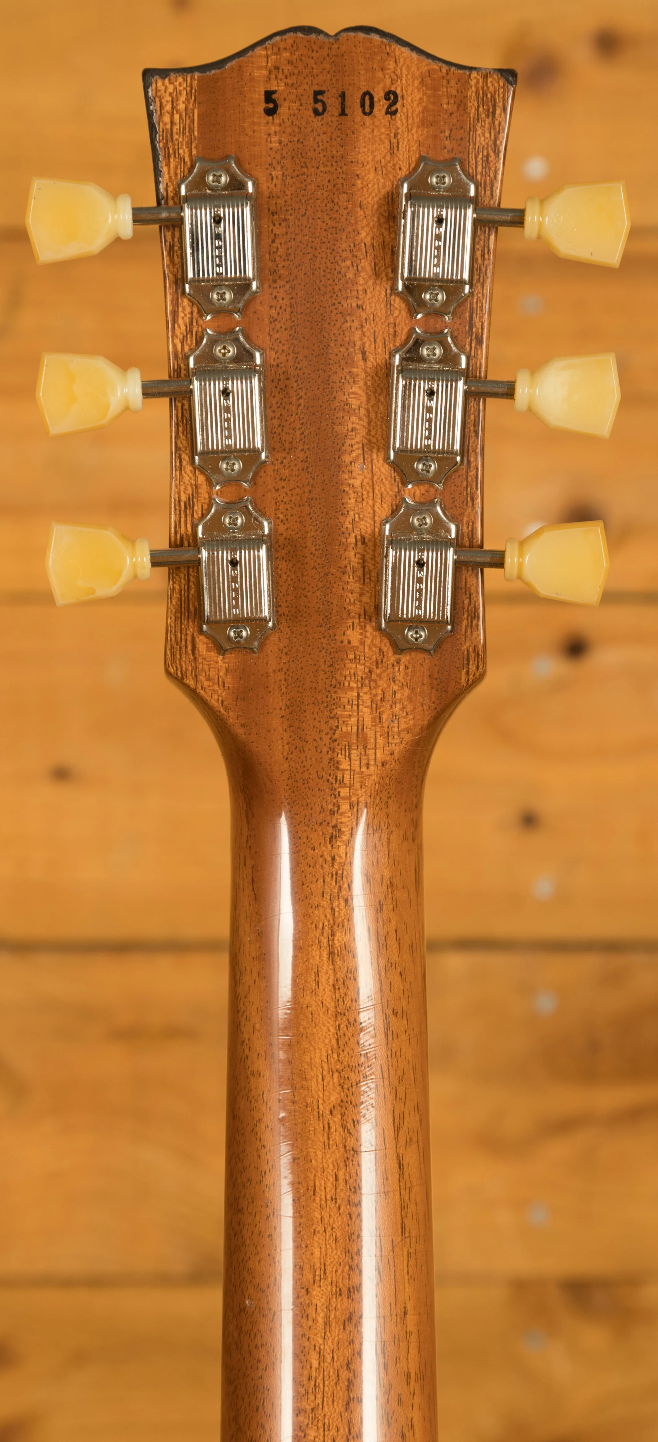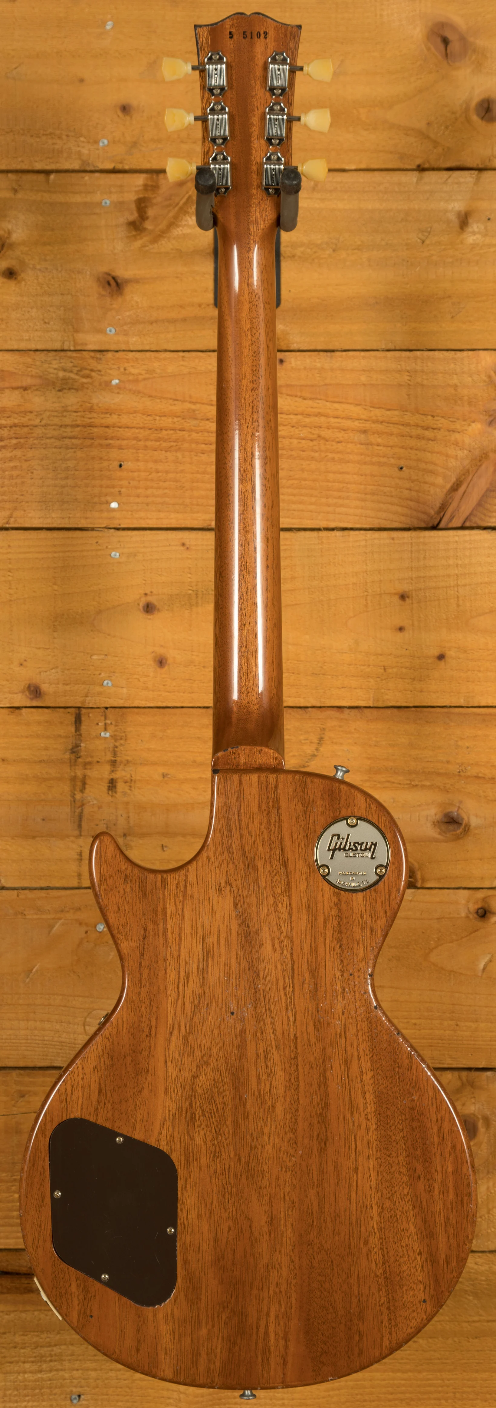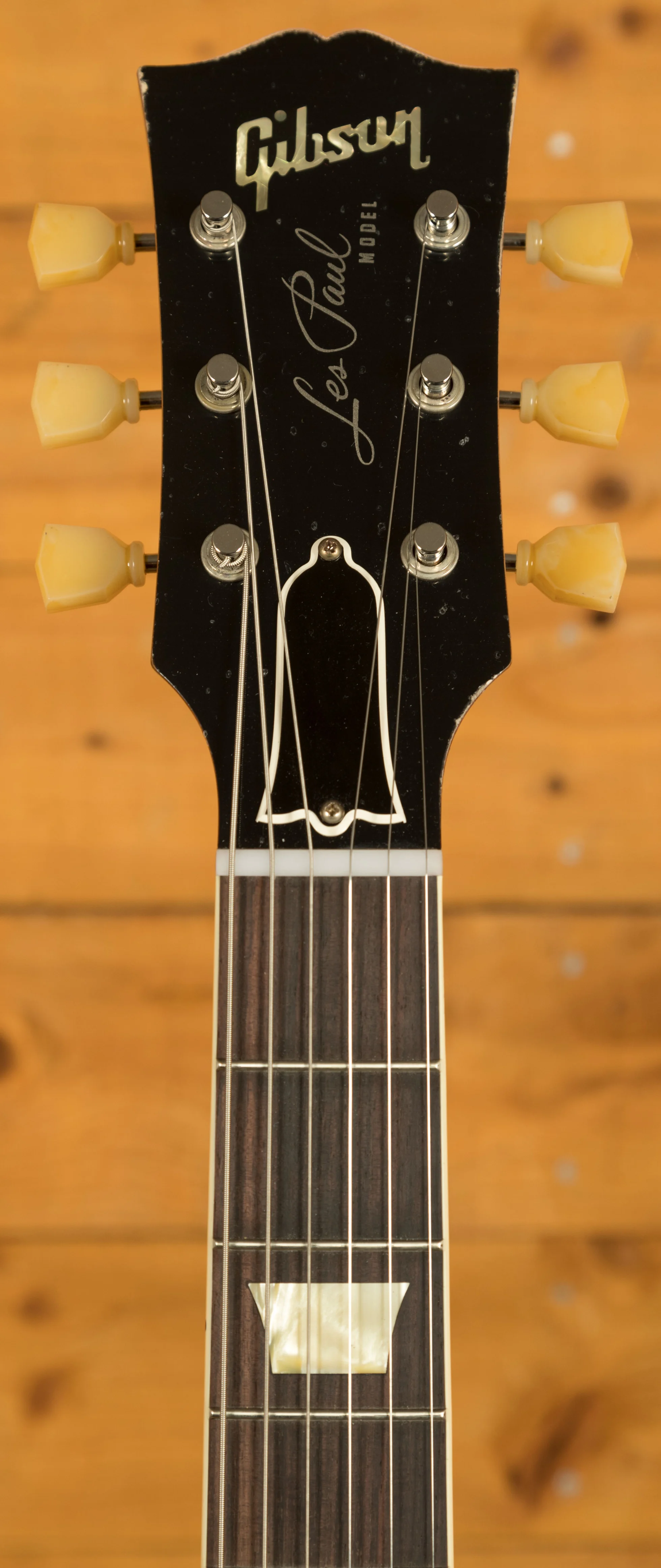 On this guitar, youll find premium hardware across the board. It features Kluson single line tuners, alongside a No-Wire ABR-1 bridge and Stop Bar tailpiece. These bridges were first introduced on the Gibson Super 400 in 1953 and were used on the 1954 Les Paul Custom, but they made their first appearance on a standard Les Paul model with the five guitars that were displayed at the 1955 NAMM Show.