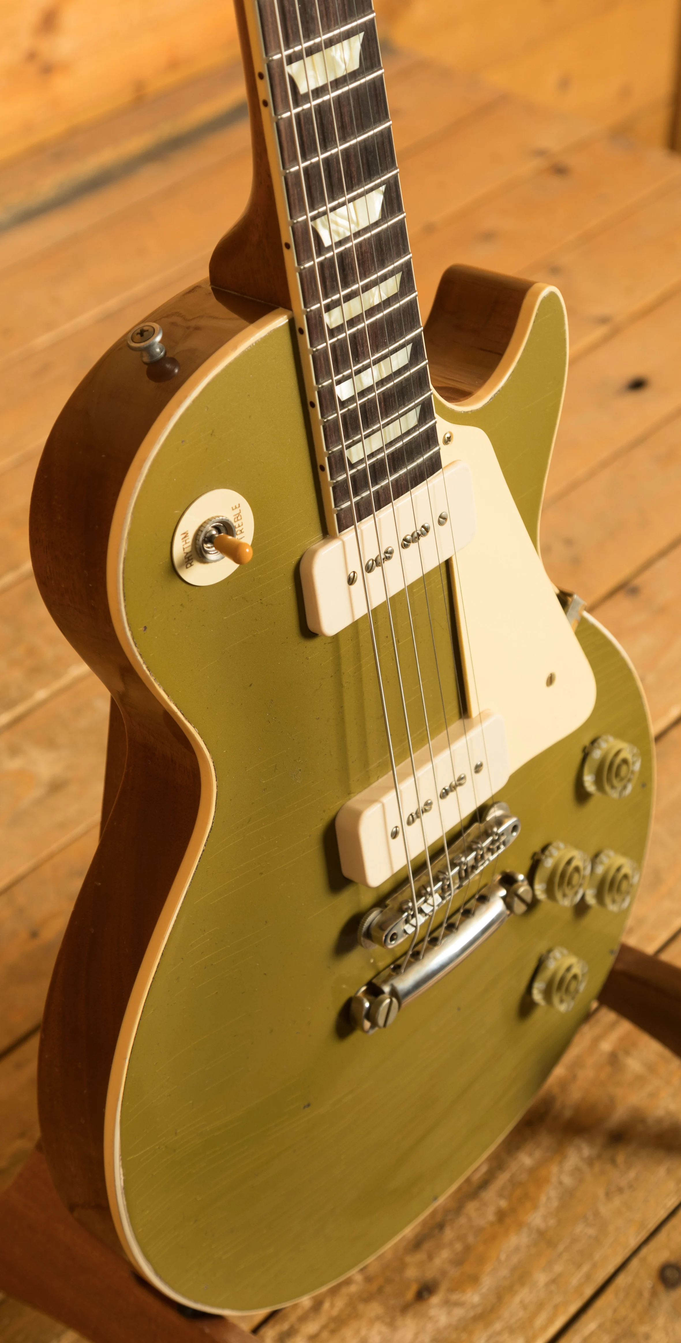A guitar these awesome needs a pickup set up to the challenge. Its fitted with a pair of cream Custom Shop P-90 Soapbar pickups that are hand-wired to 500k CTS potentiometers and paper-in-oil capacitors. Both pickups are well balanced and sound great clean or with some gain, theyll handle just about anything you want to throw at them. These guitars also feature colour-matched speed knobs, which is accurate to the original models built in 1955.
