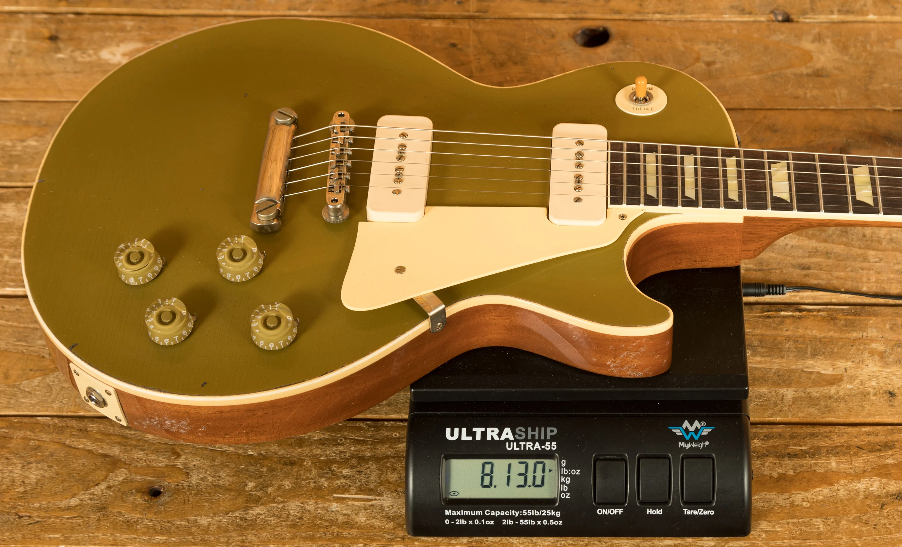 This awesome guitar features a traditional and historically accurate 1955 Les Paul spec. It features a lightweight one-piece Mahogany body and a hide glue fitted two-piece maple cap. With this legendary tone wood pairing, you just know its going to nail that iconic early 50s Les Paul tone. The custom metallic Nugget Gold nitrocellulose finish looks super slick and gives this special instrument a unique charm. The ultra-thin nitrocellulose finish has been painstakingly aged by the Gibson Custom Murphy Lab team. The Light Aged finish treatment, paired with lightly aged hardware, simulates decades of light play wear, giving these guitars the unique character, vibe, and feel of an original example from the Gibson Golden Era.
