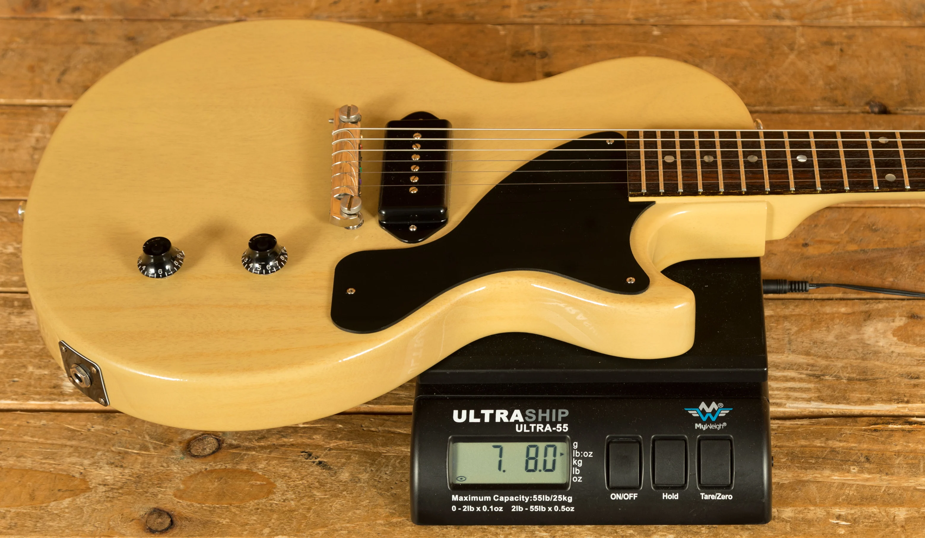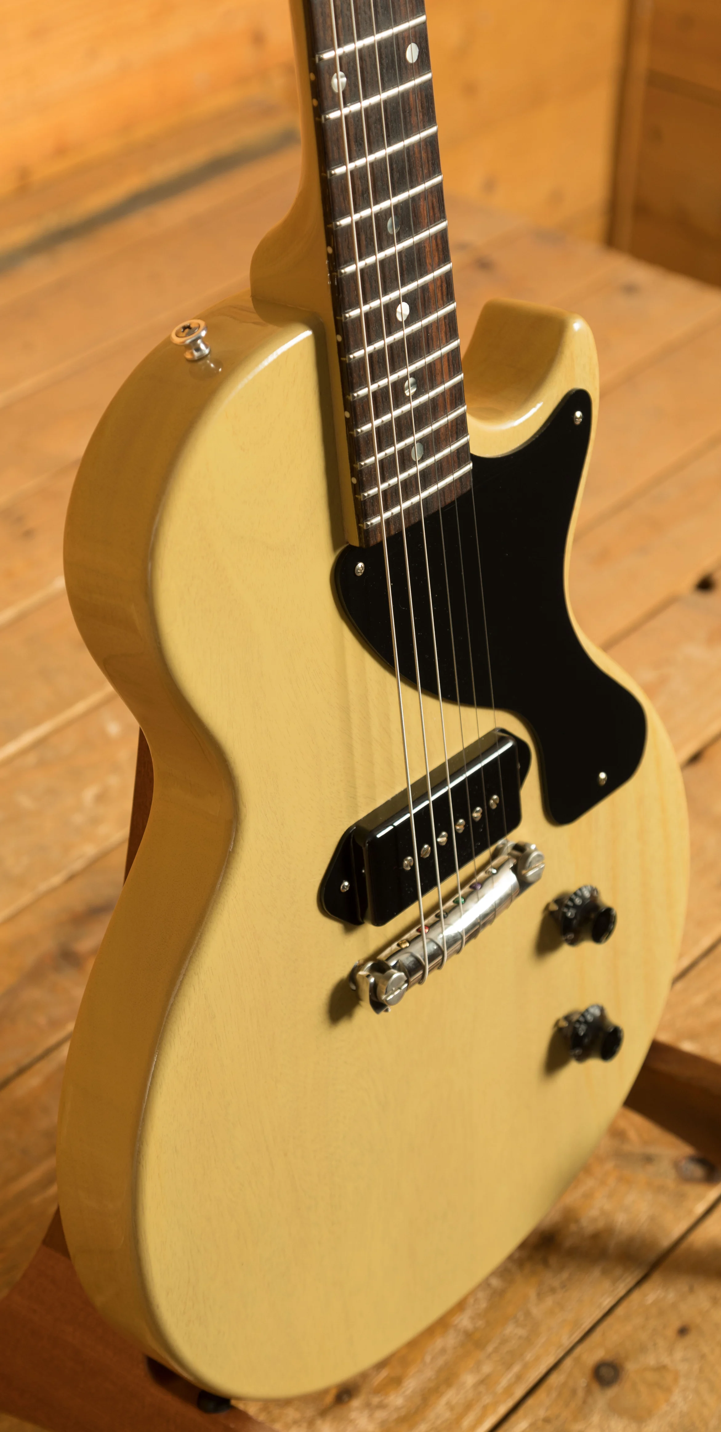The Mahogany neck features a Rosewood fingerboard and the classic 24.75" scale length. Great at either end of the board, this guitar is smooth underhand and so easy to play. The wraparound bridge is great while the single Gibson Custom Dog Ear P90 really enhances that old school vibe.