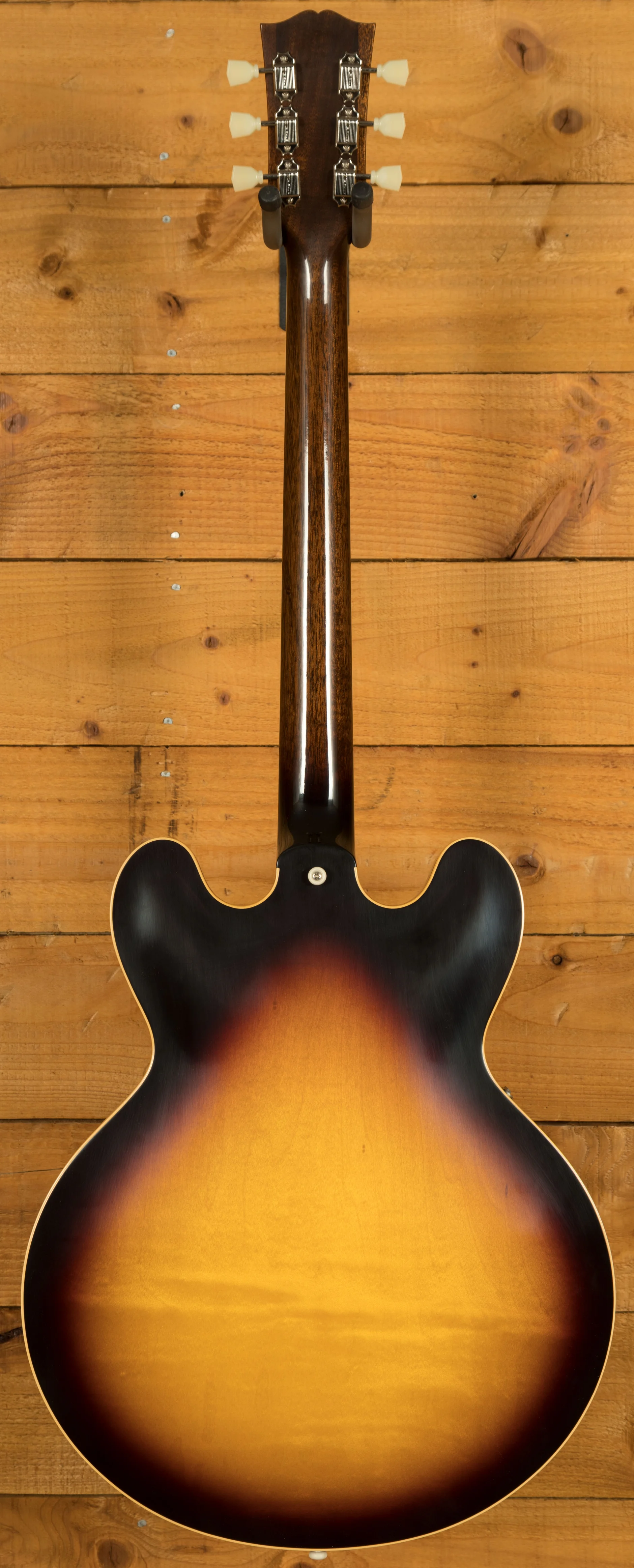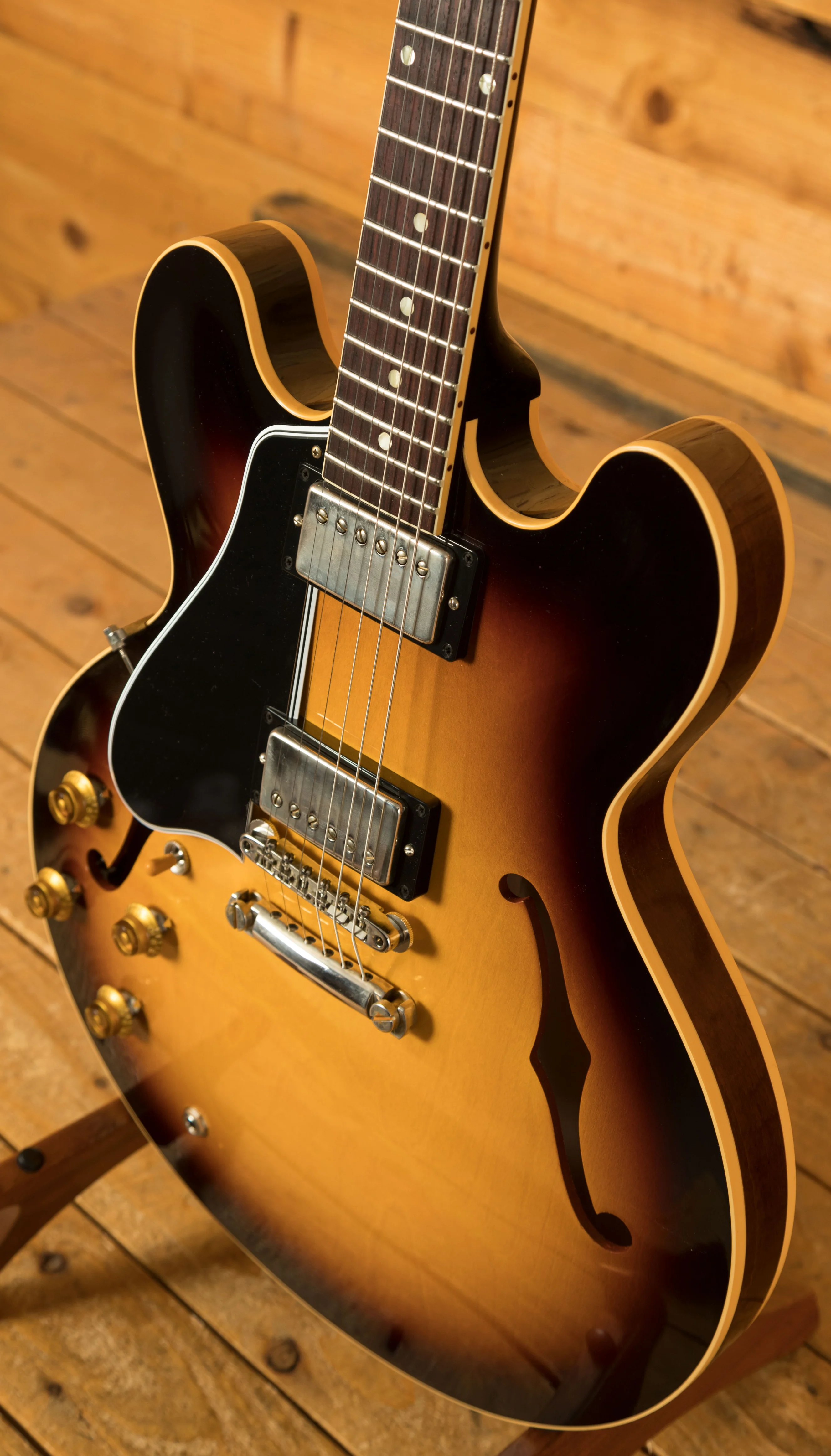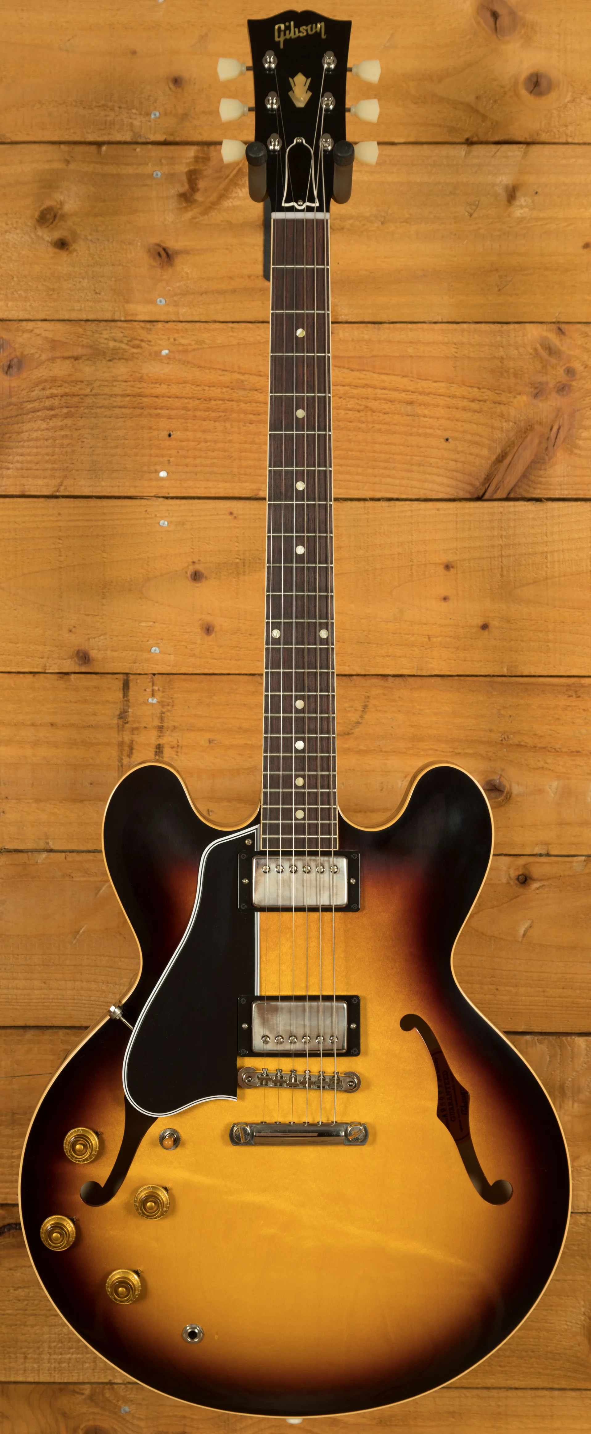 The neck is something special, crafted from Mahogany; it features a gorgeous Indian Rosewood fingerboard, embellished with Pearloid inlays. With 22 frets, 12" radius, 1.687" nut width and a 24.75" scale length it feels smooth and comfortable, equally at home playing slick lead work or heavy chord strumming thanks to the authentic 50s Rounded Medium "C" profile. With hide glue construction, this 335 offers true vintage tonality.