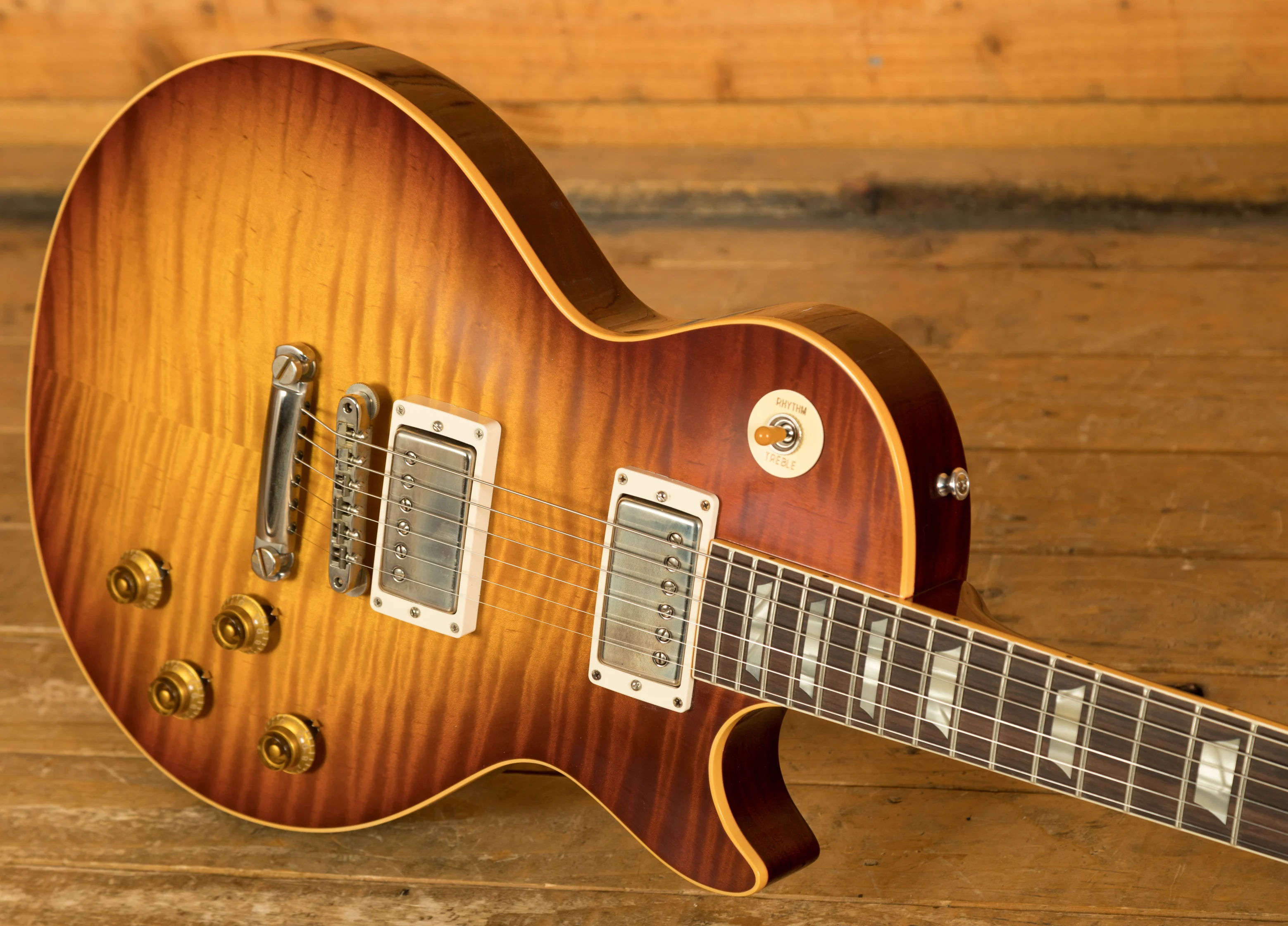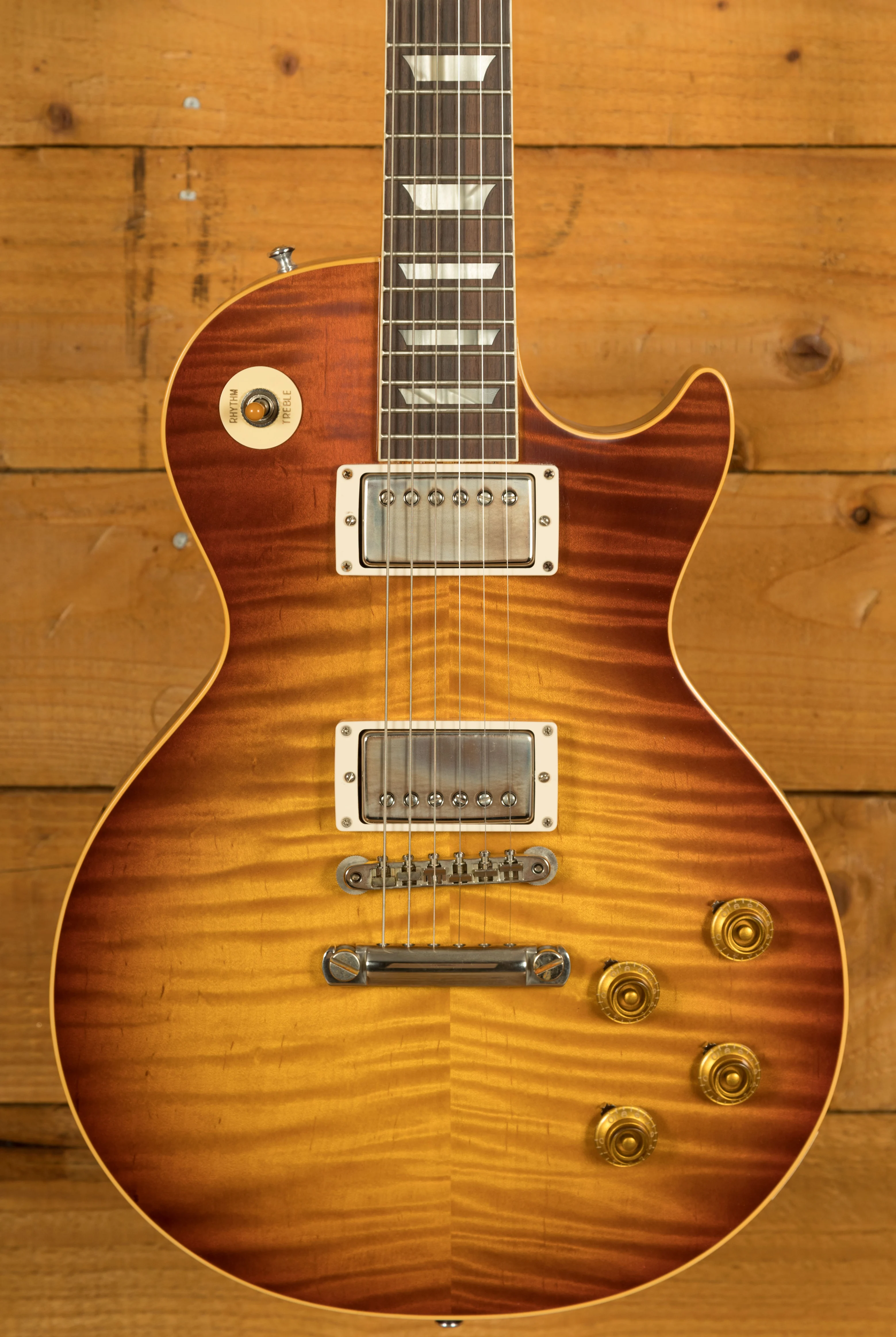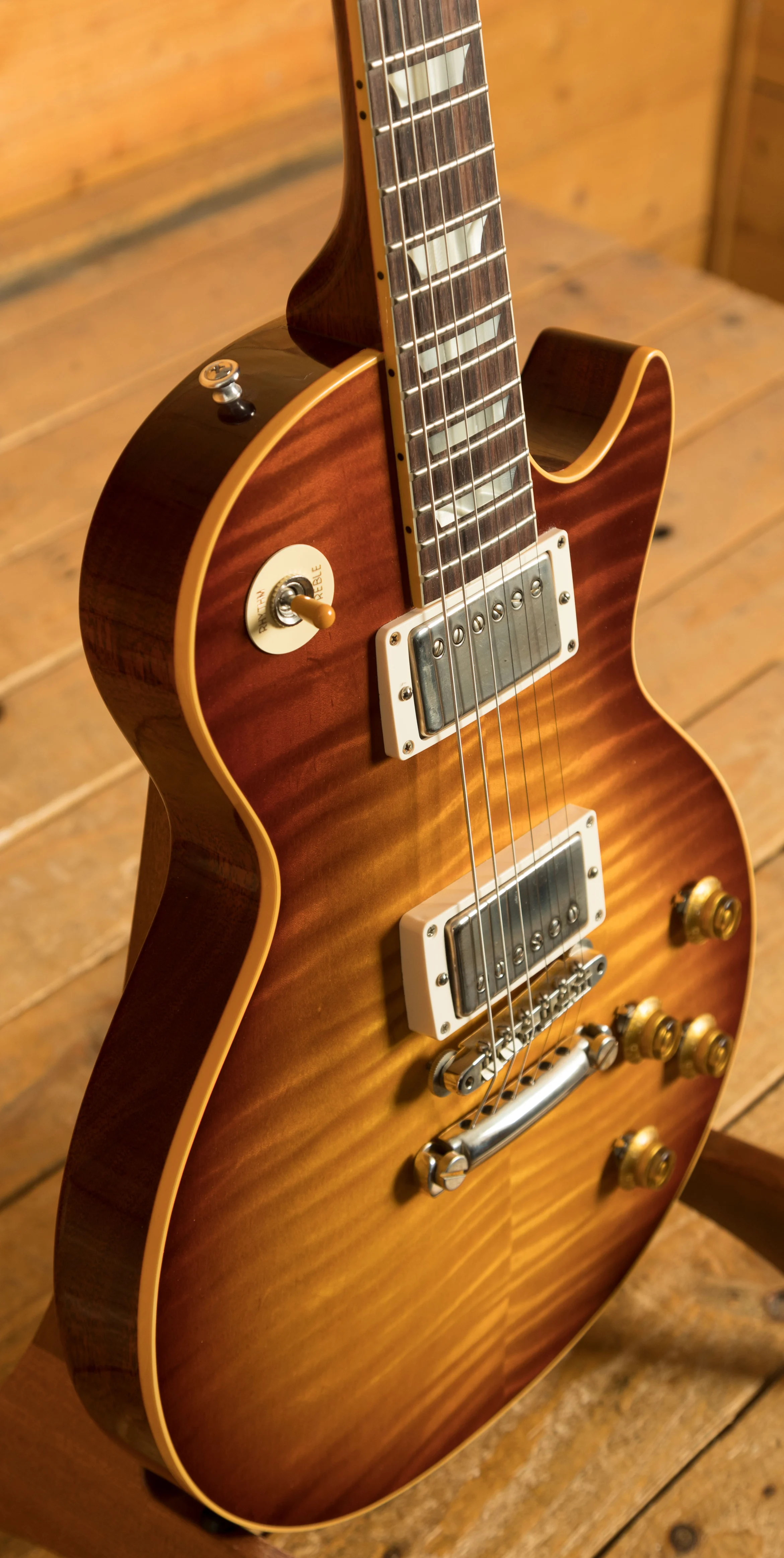 As this is a ’59 Les Paul re-issue, the body is crafted from both mahogany and figured maple. This tonewood partnership really is something special, it gives you warmth, sustain, and great clarity. All of the timber used on this build was personally chosen by John for its beauty, and lightweight nature. So, if you’re looking for a lightweight instrument with a killer tone, then you should 100% check this out! The stain we choose for this limited run of guitars is heavily inspired by Tom Murphy’s legendary “Tom’s Tea” stain, which is a gorgeous sunburst finish which is slightly faded around the edge. This finish works well with the darker maple tops and has resulted in a seriously cool looking guitar. We spec’d these to feature no pickguard, but there is a pickguard included in the case with this guitar.