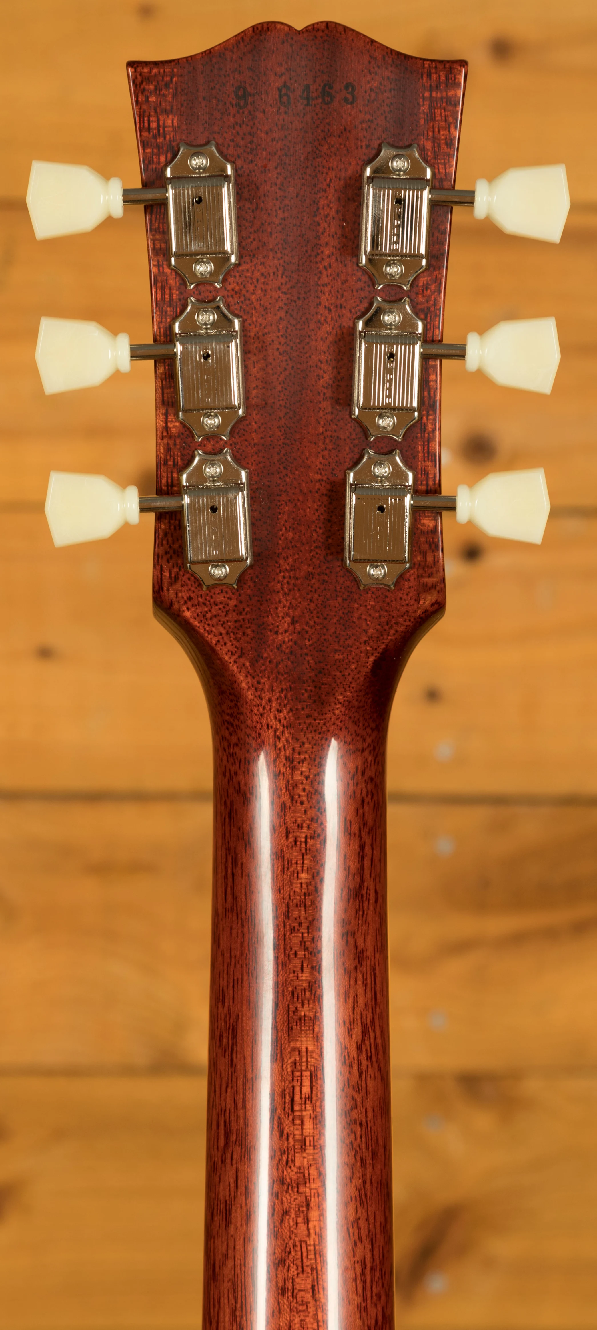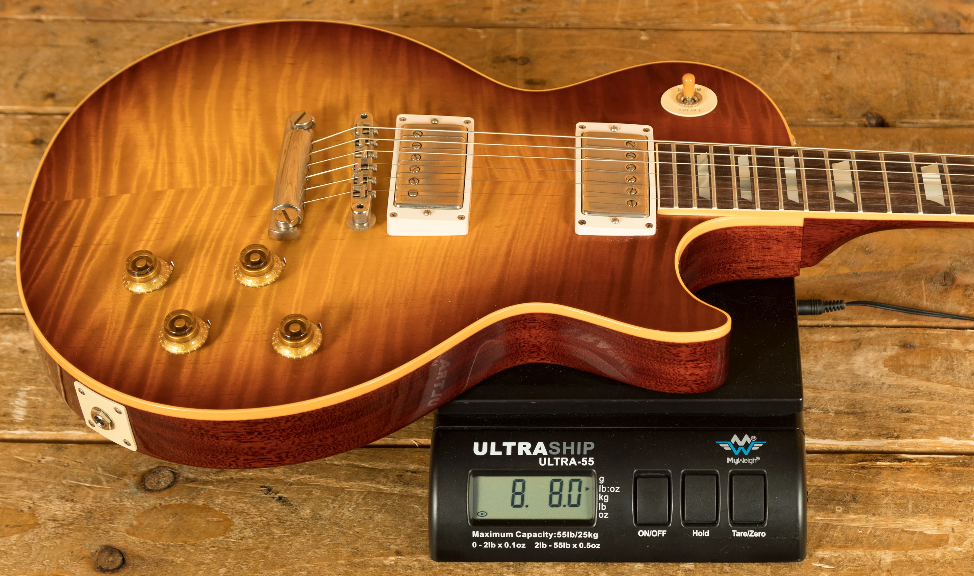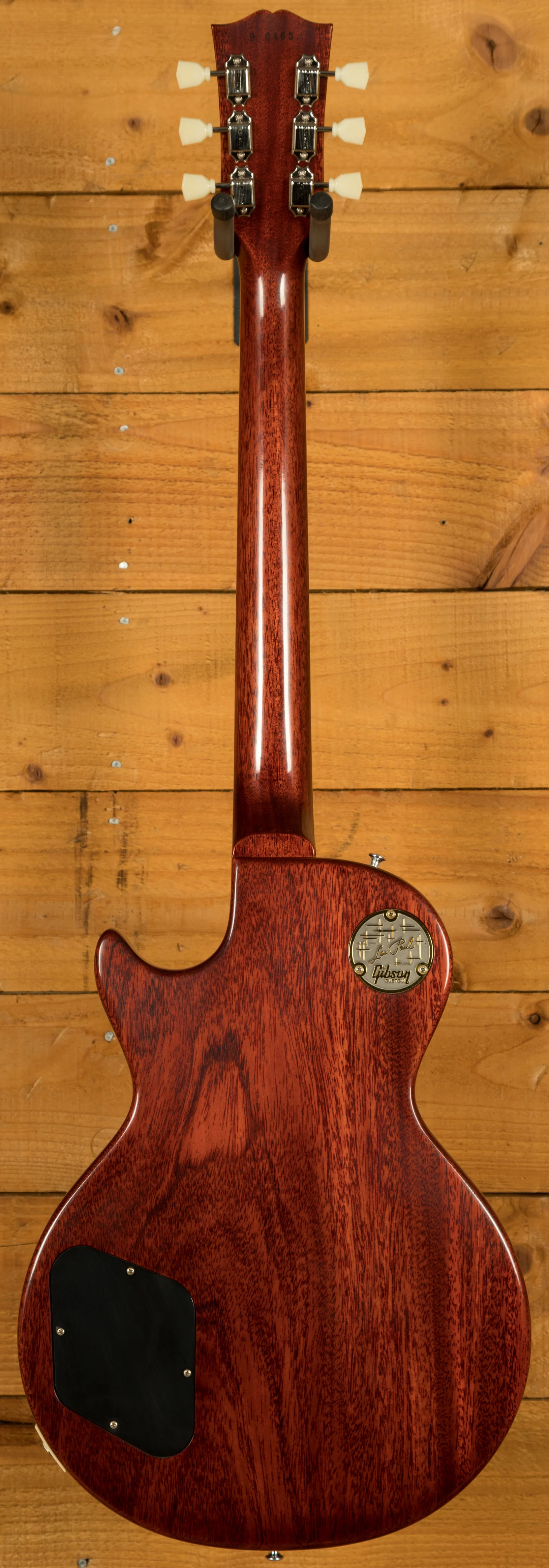 As this is a ’59 Les Paul re-issue, the body is crafted from both mahogany and figured maple. This tonewood partnership really is something special, it gives you warmth, sustain, and great clarity. All of the timber used on this build was personally chosen by John for its beauty, and lightweight nature. So, if you’re looking for a lightweight instrument with a killer tone, then you should 100% check this out! The stain we choose for this limited run of guitars is heavily inspired by Tom Murphy’s legendary “Tom’s Tea” stain, which is a gorgeous sunburst finish which is slightly faded around the edge. This finish works well with the darker maple tops and has resulted in a seriously cool looking guitar. We spec’d these to feature no pickguard, but there is a pickguard included in the case with this guitar.