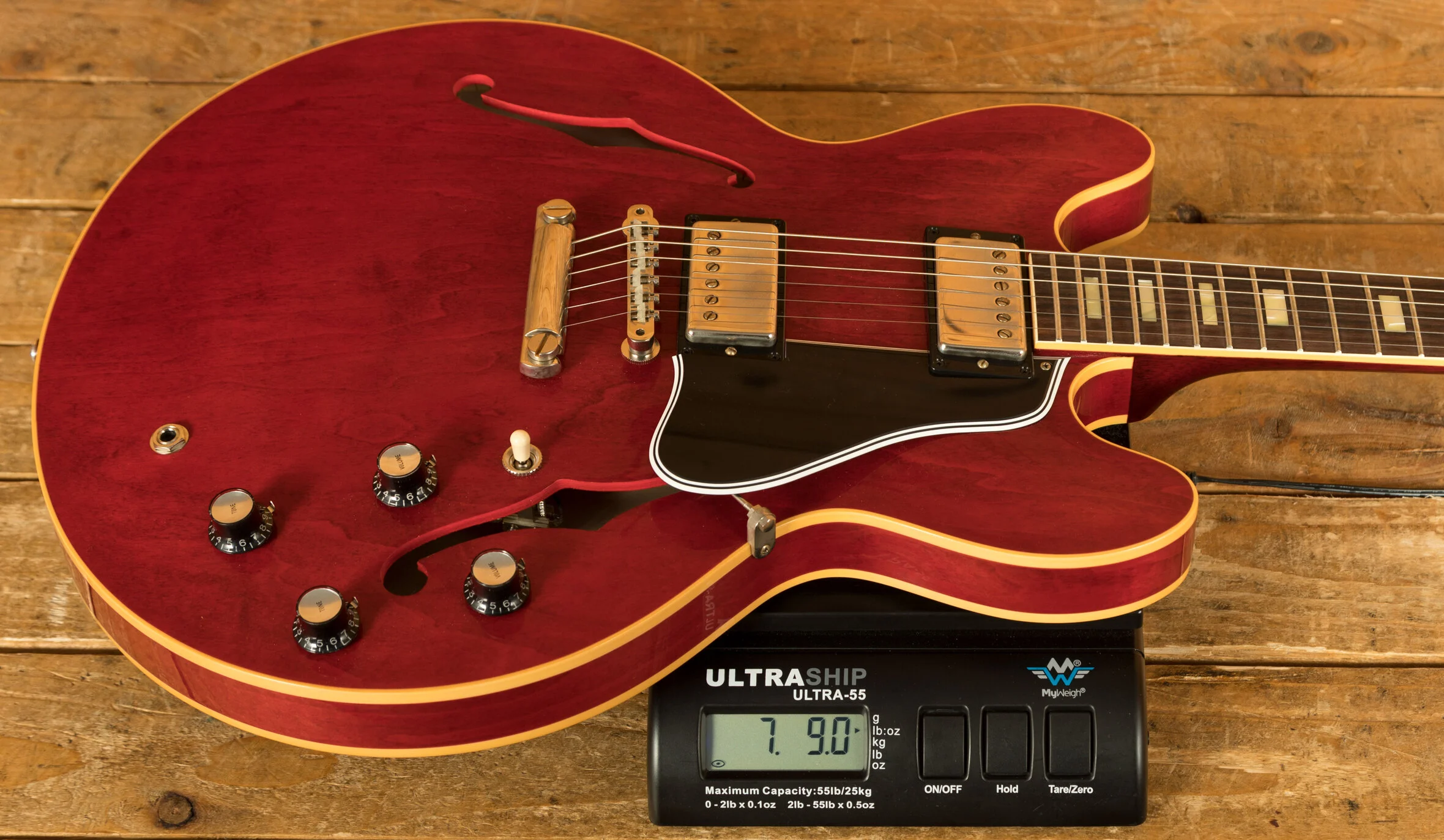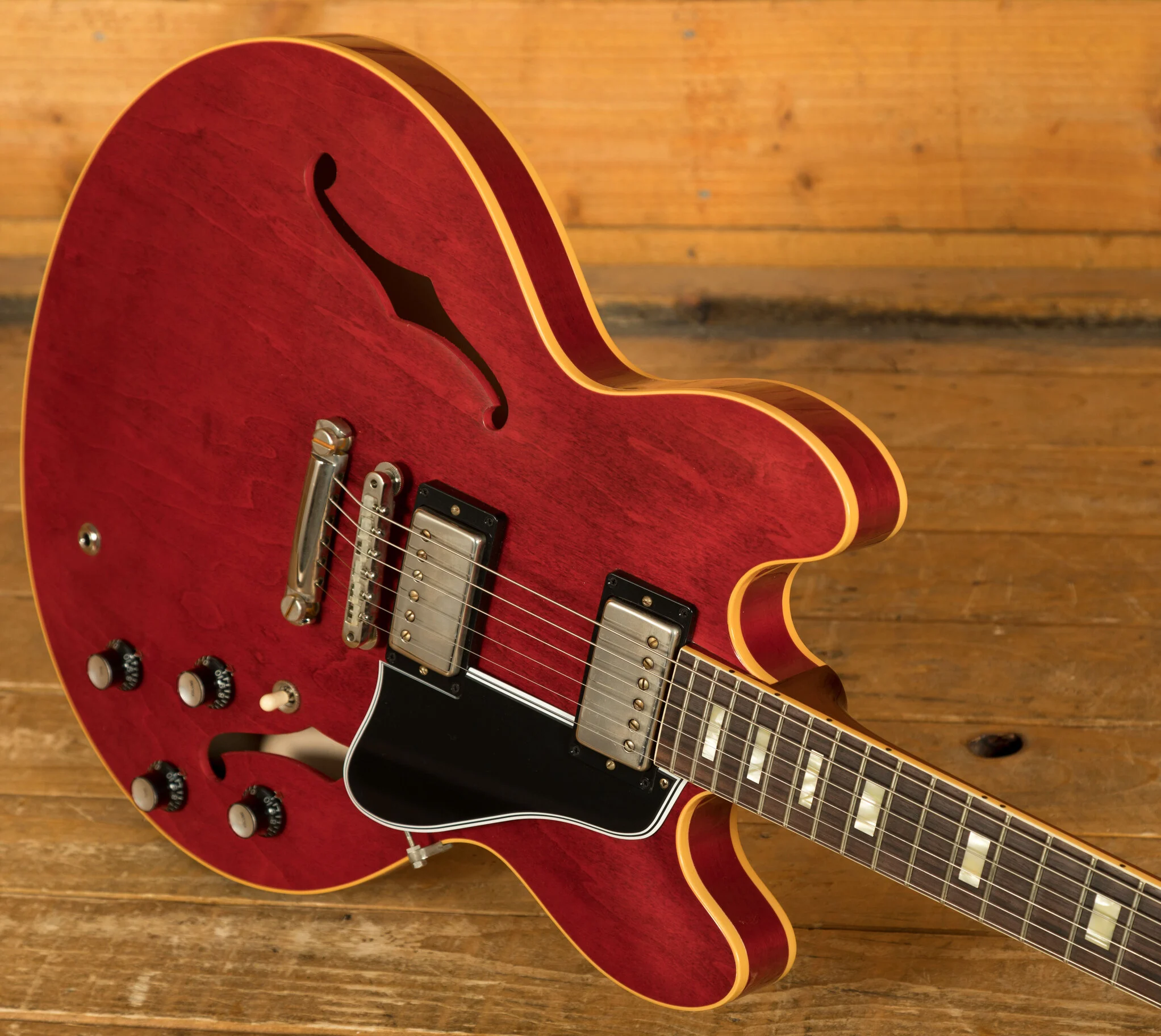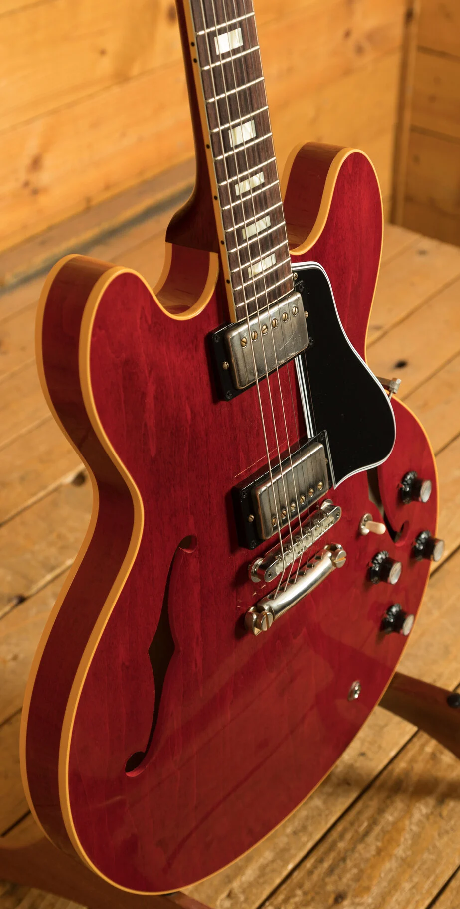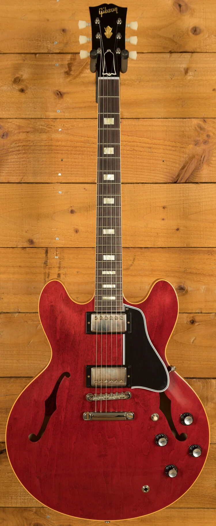 The neck is something special, crafted from Mahogany; it features a gorgeous Indian rosewood fingerboard, embellished with small block inlays. With 22 frets and a 24.75" scale length it feels smooth and comfortable, equally at home playing slick lead work or heavy chord strumming. With hide glue construction, this 335 offers true vintage tonality.