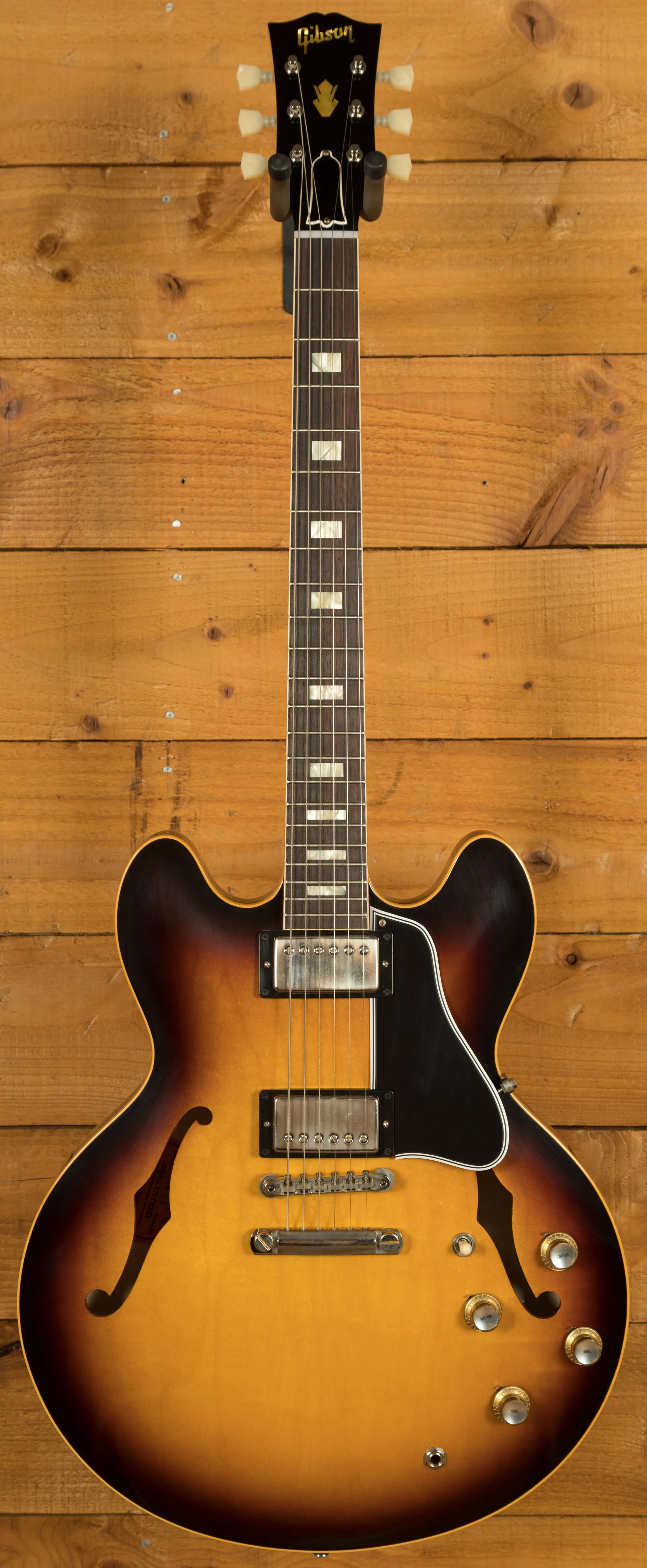 The neck is something special, crafted from Mahogany; it features a gorgeous Indian rosewood fingerboard, embellished with small block inlays. With 22 frets and a 24.75" scale length it feels smooth and comfortable, equally at home playing slick lead work or heavy chord strumming. With hide glue construction, this 335 offers true vintage tonality.