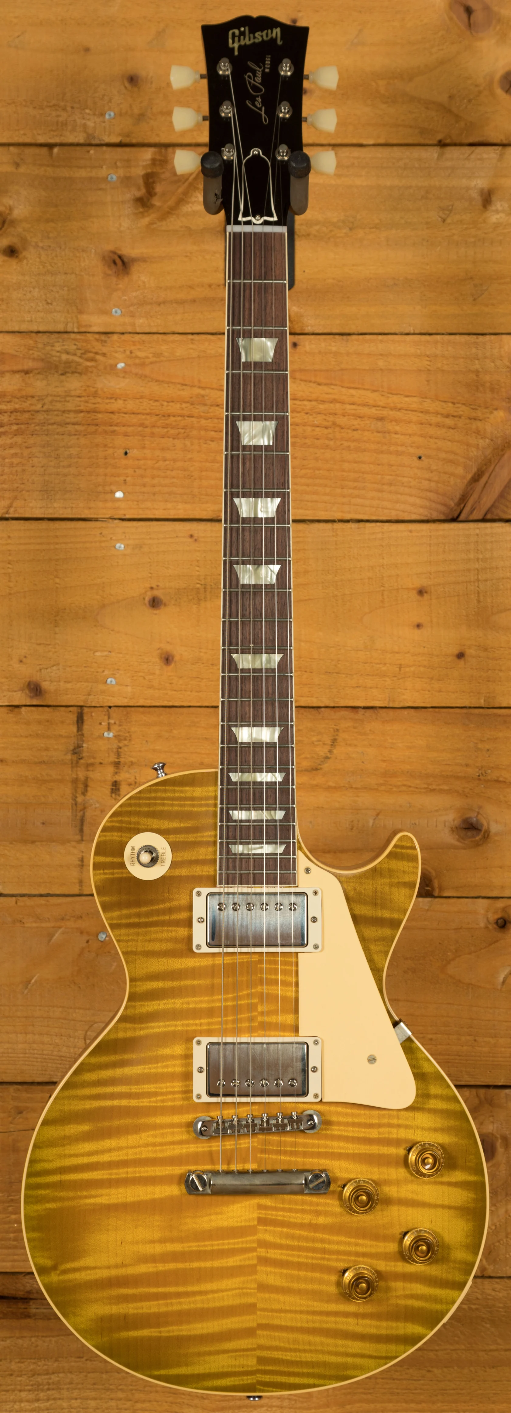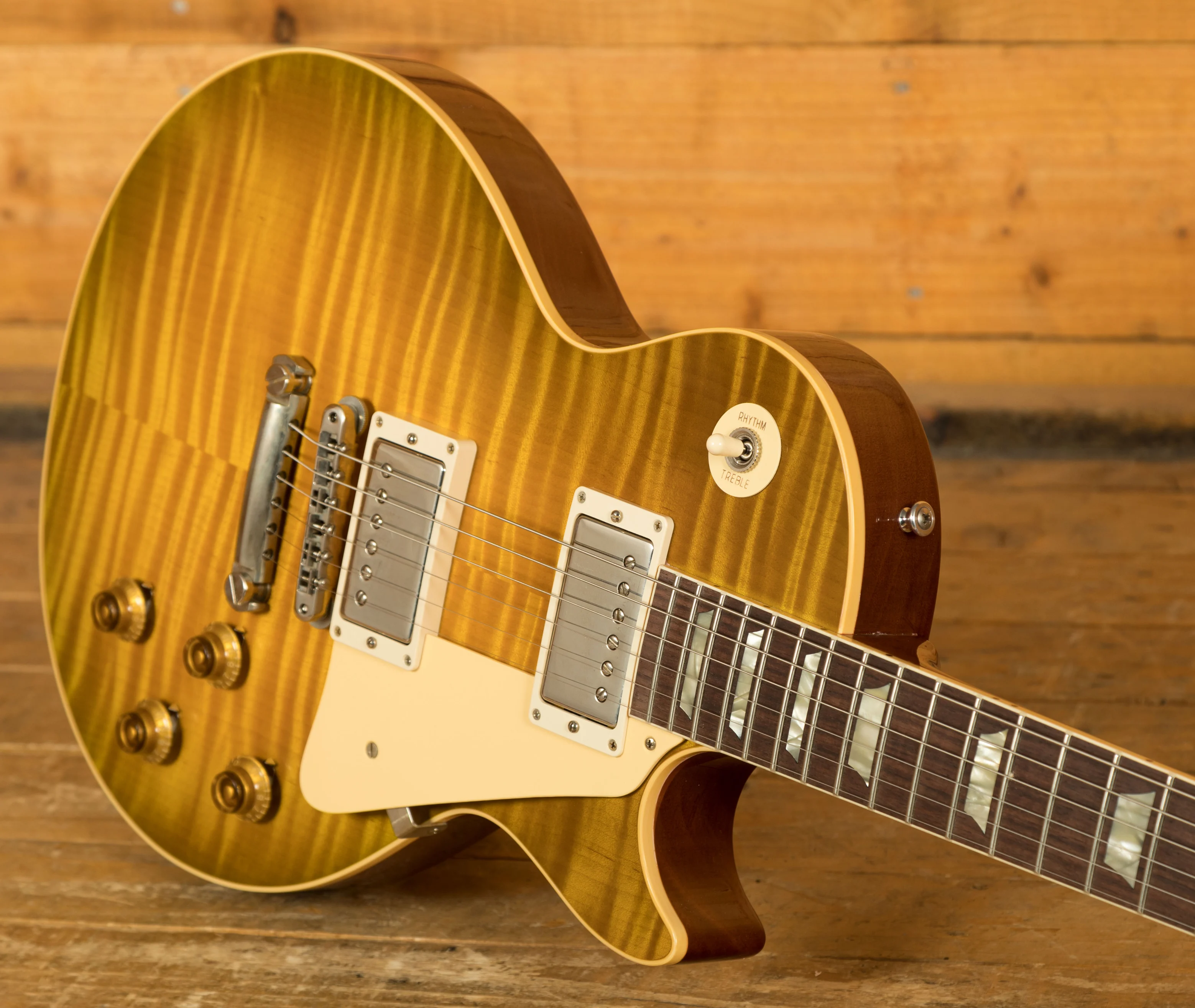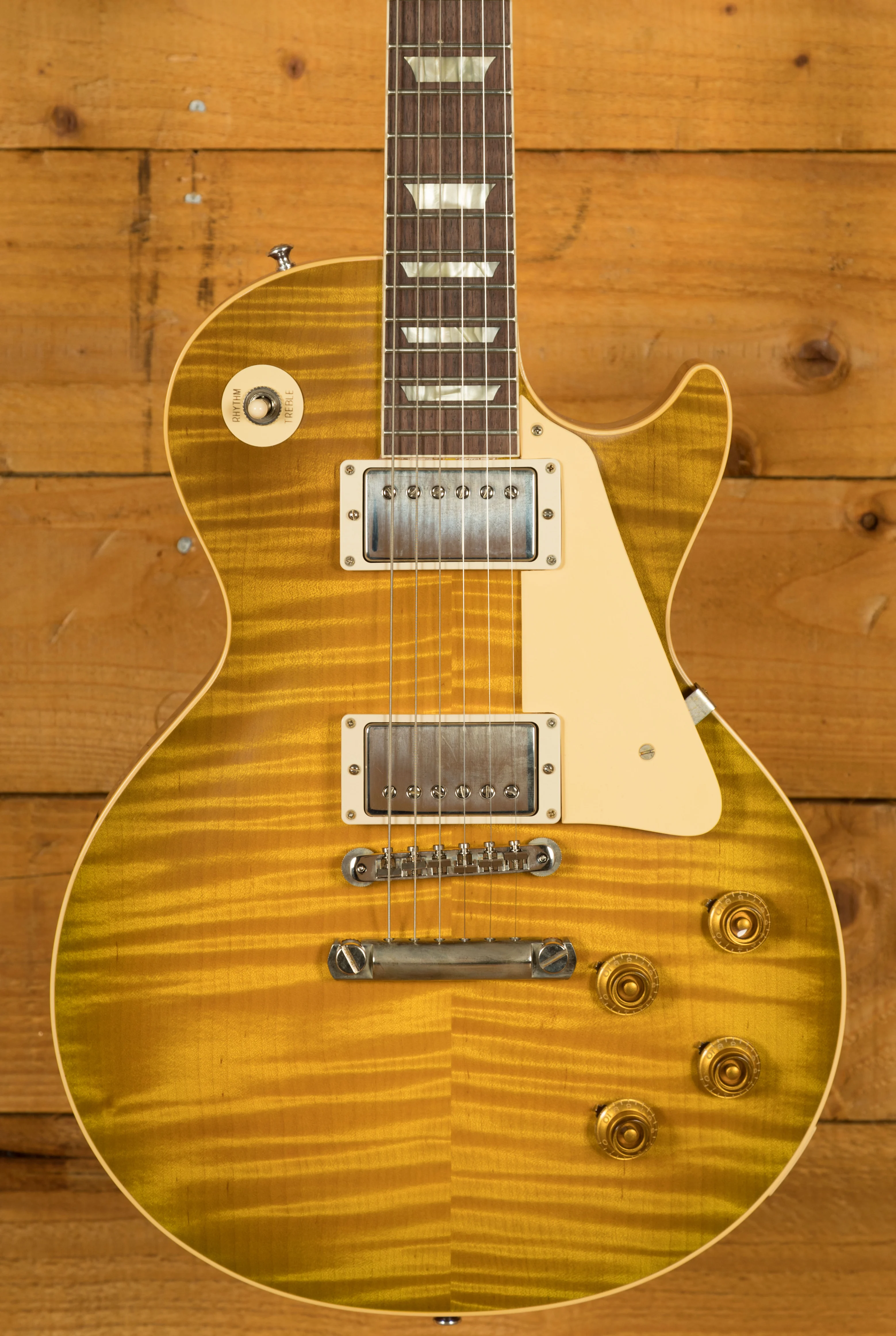 With a Mahogany body, this Les Paul benefits from a hand picked figured Maple top for the ultimate tonewood partnership. We enjoy a very strong relationship with the Gibson Custom Shop here at Peach, with our very own John Priest taking regular trips out to the workshop to pick out some awesome tops for our guitars. The figuring on this beauty is incredible. Rich and super resonant it offers premium tone and timeless aesthetics, while the Green Lemon VOS Nitro finish looks a million dollars and really allows the wood to breathe and the natural tone to sing through.this Les Paul is of the highest quality. The Custom Shop do an incredible job of capturing the feel of a vintage instrument. With hide glue construction, this Les Paul offers true vintage tonality.