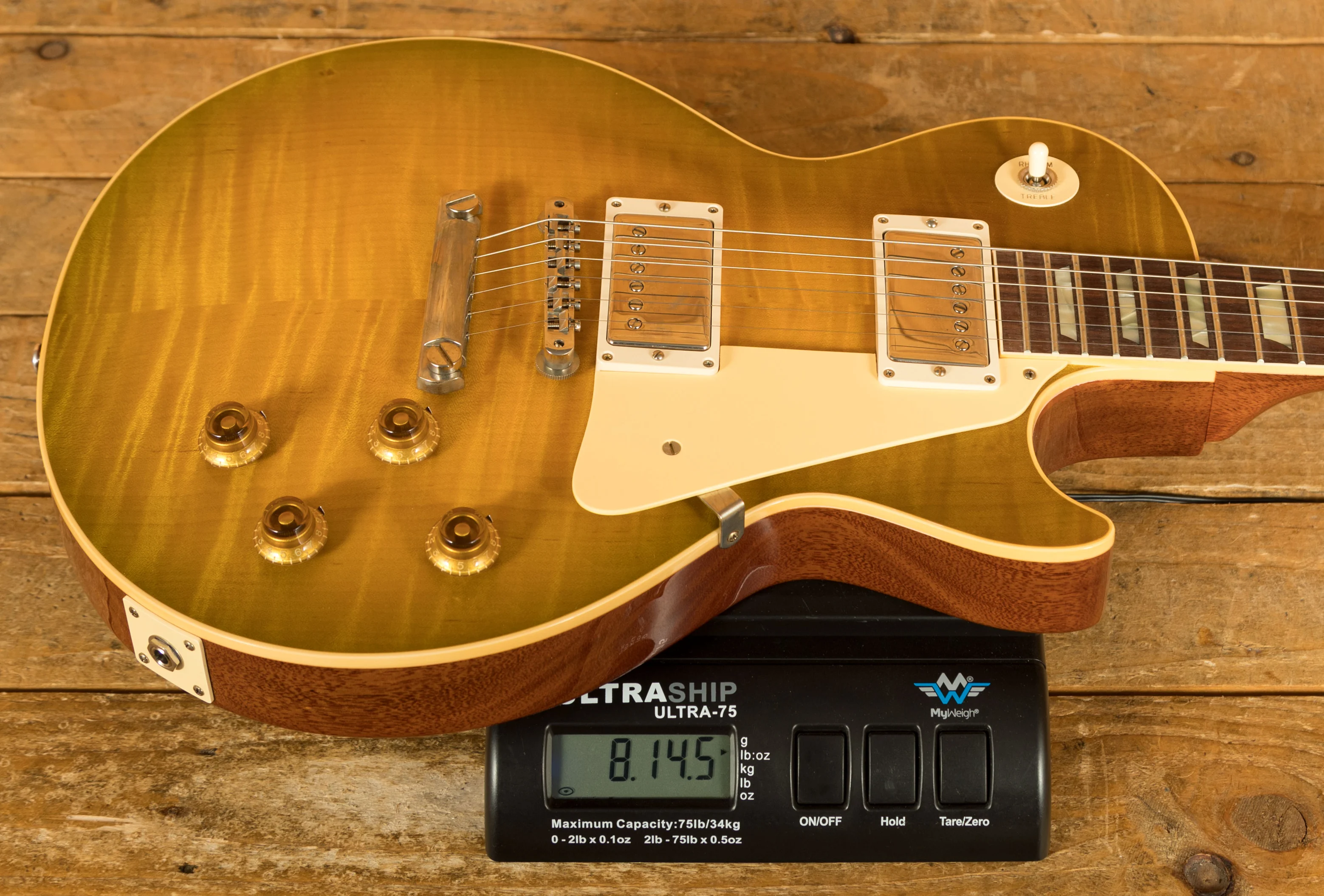 The solid Mahogany neck is topped with a crisp Indian Rosewood fingerboard with classic Gibson Trapezoid inlays, this guitar looks every bit the real deal. With a 24.75" scale length, 12" radius, 1.687" nut width and medium jumbo frets, it retains that classic Les Paul feel. The ABR-1 bridge and light weight stopbar offer an authentic vintage vibe.