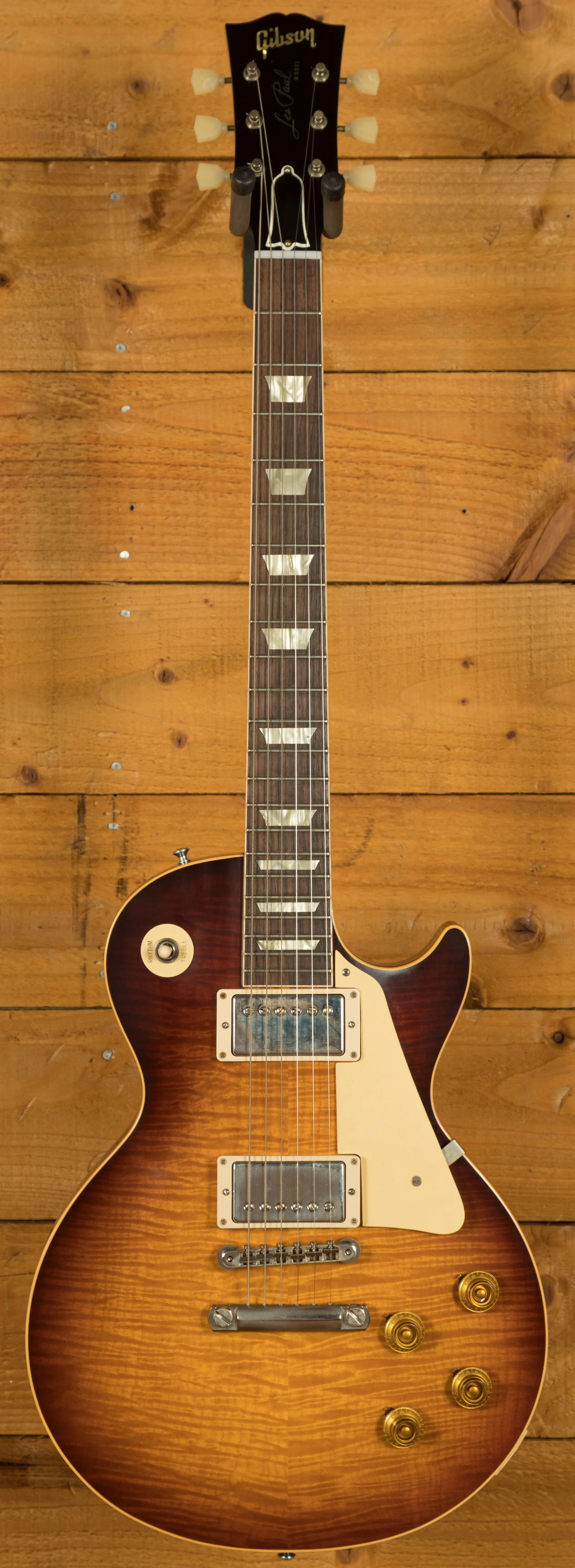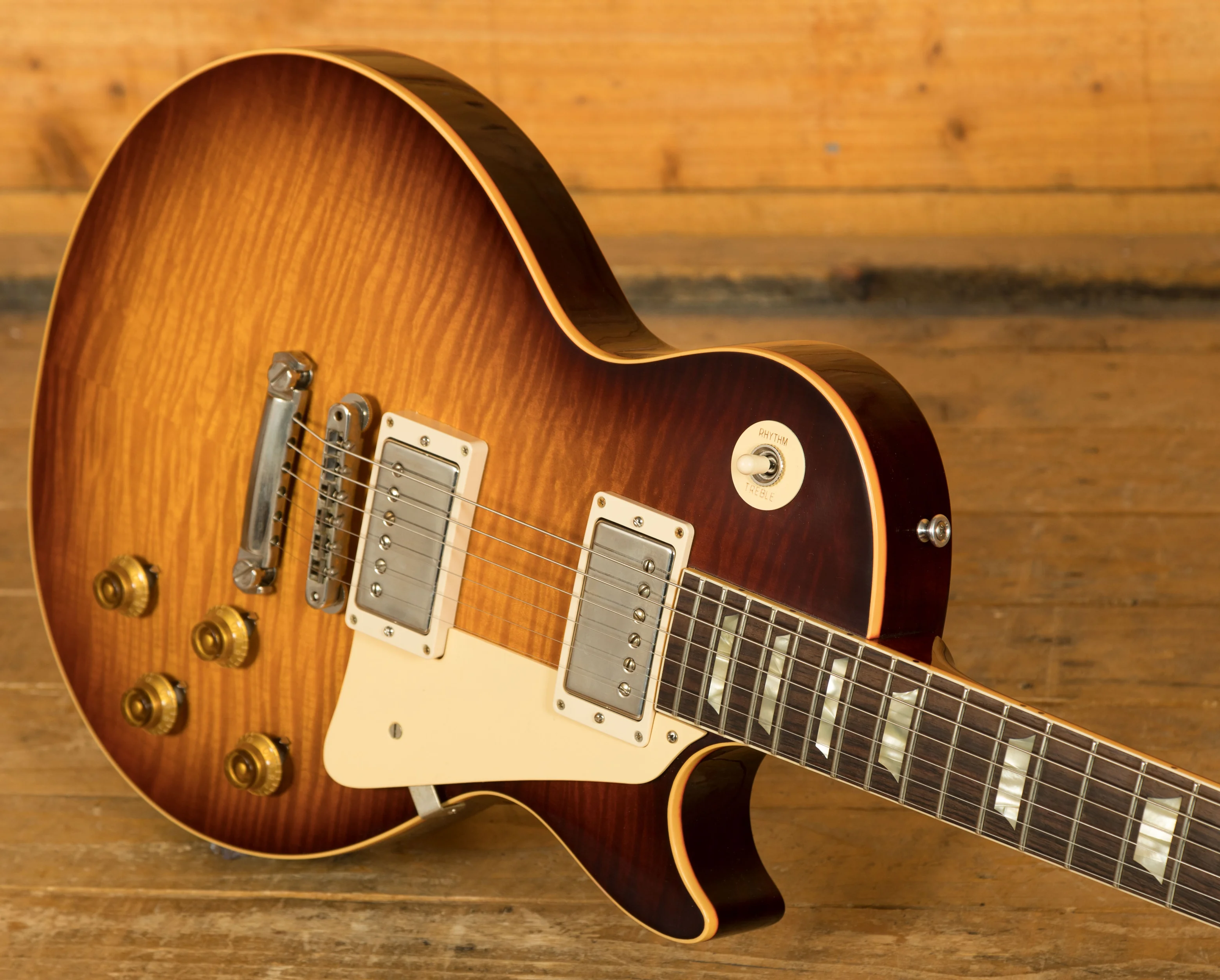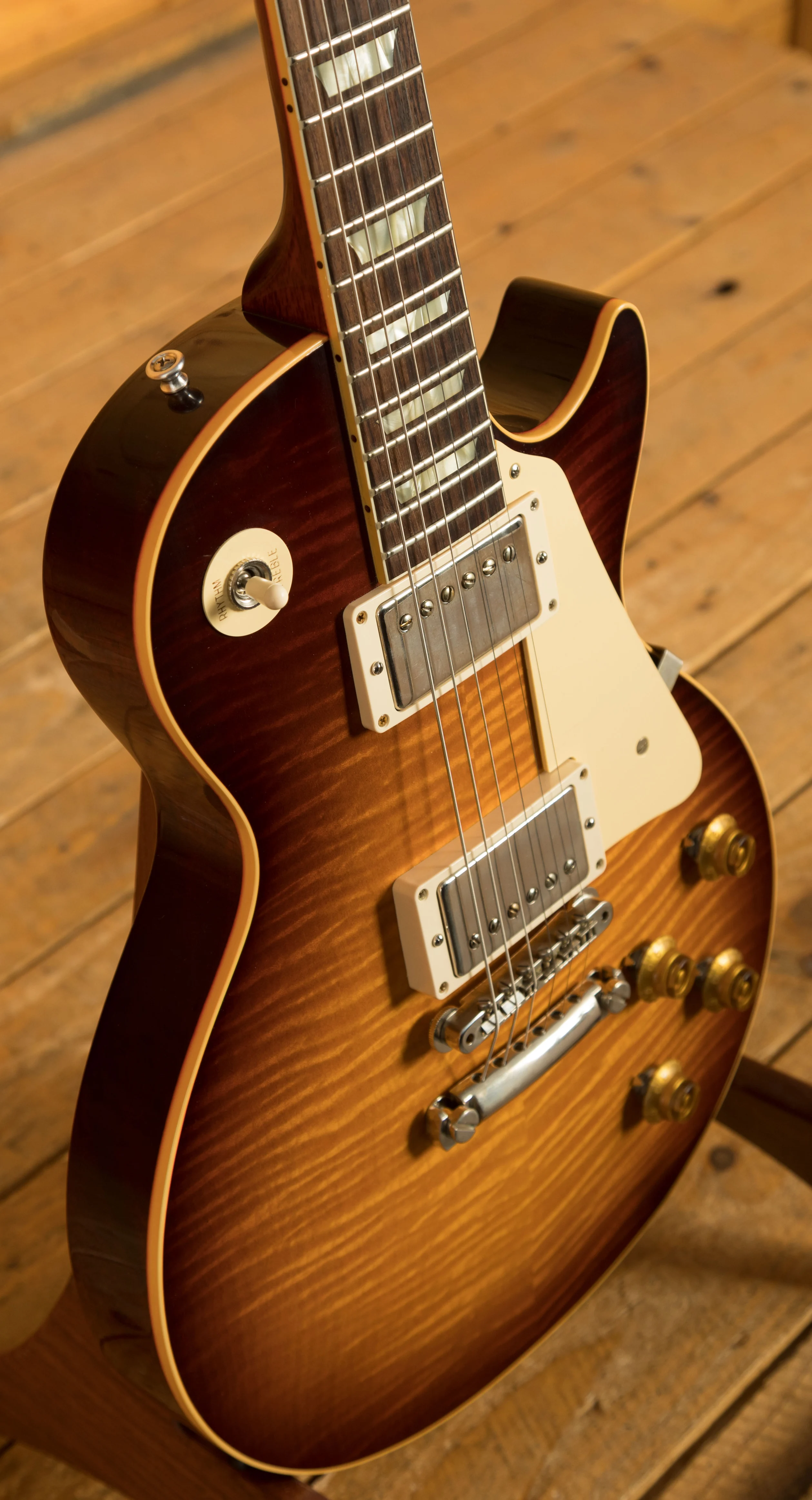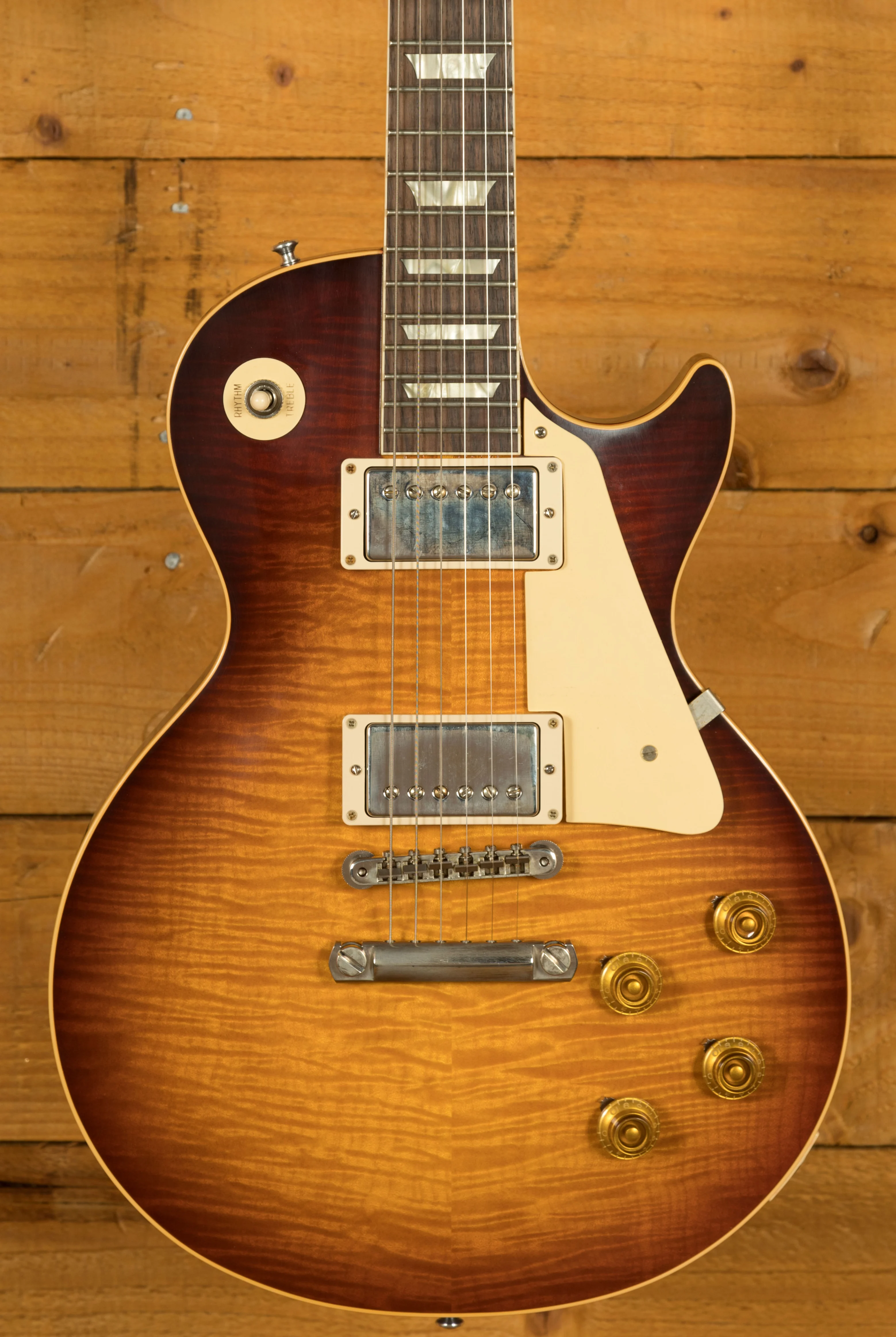 With a Mahogany body, this Les Paul benefits from a figured Maple top for the ultimate tonewood partnership. Rich and super resonant it offers premium tone and timeless aesthetics, while the sunburst finish looks a million dollars and really allows the wood to breathe and the natural tone to sing through. This guitar is based of one of the iconic original golden era "Bursts" featured in the legendary book "The Beauty of the Burst", more specifically a burst featured on page 82. It looks supre slick and perfectly captures the magic and vibe of that iconic instrument!