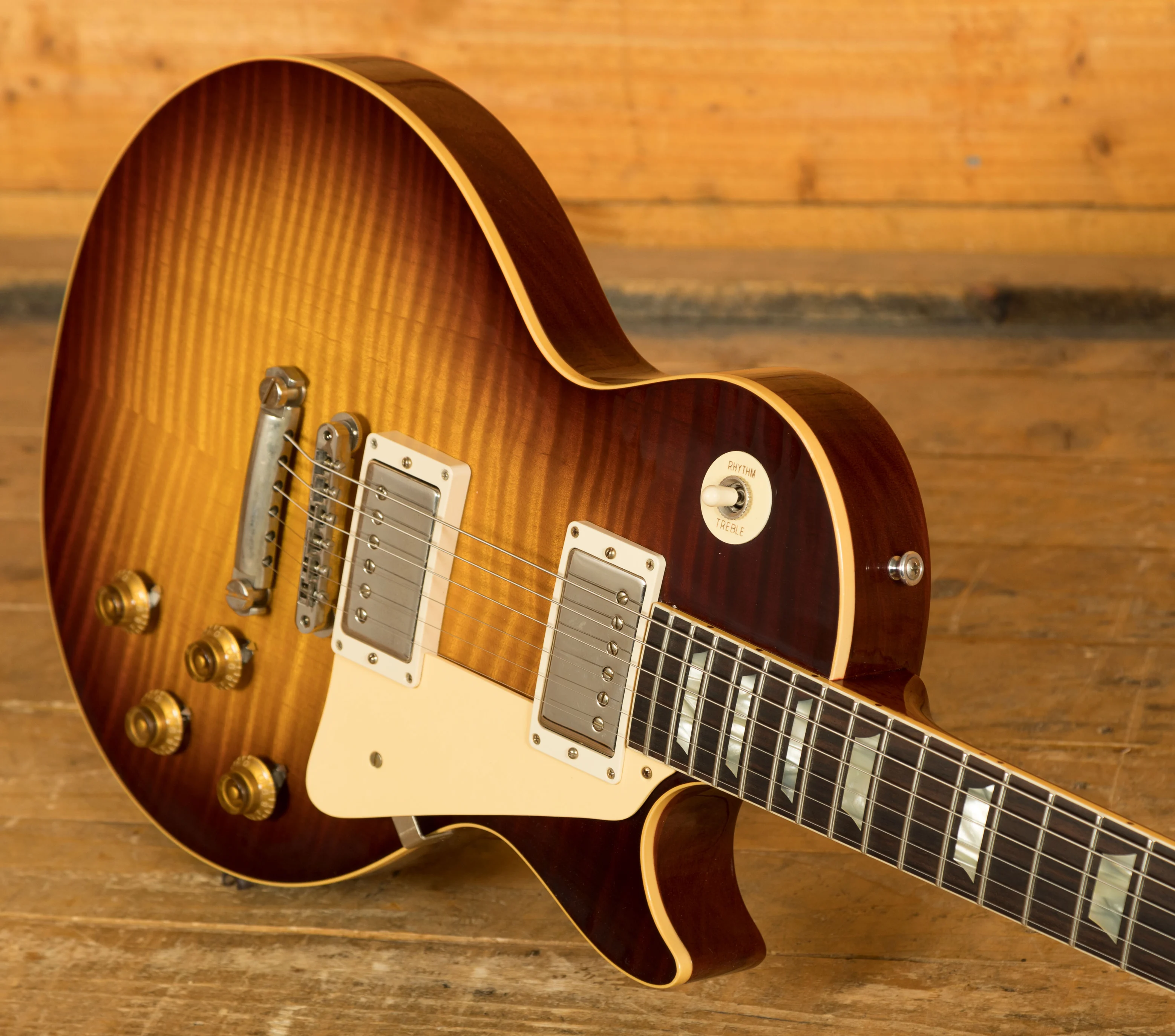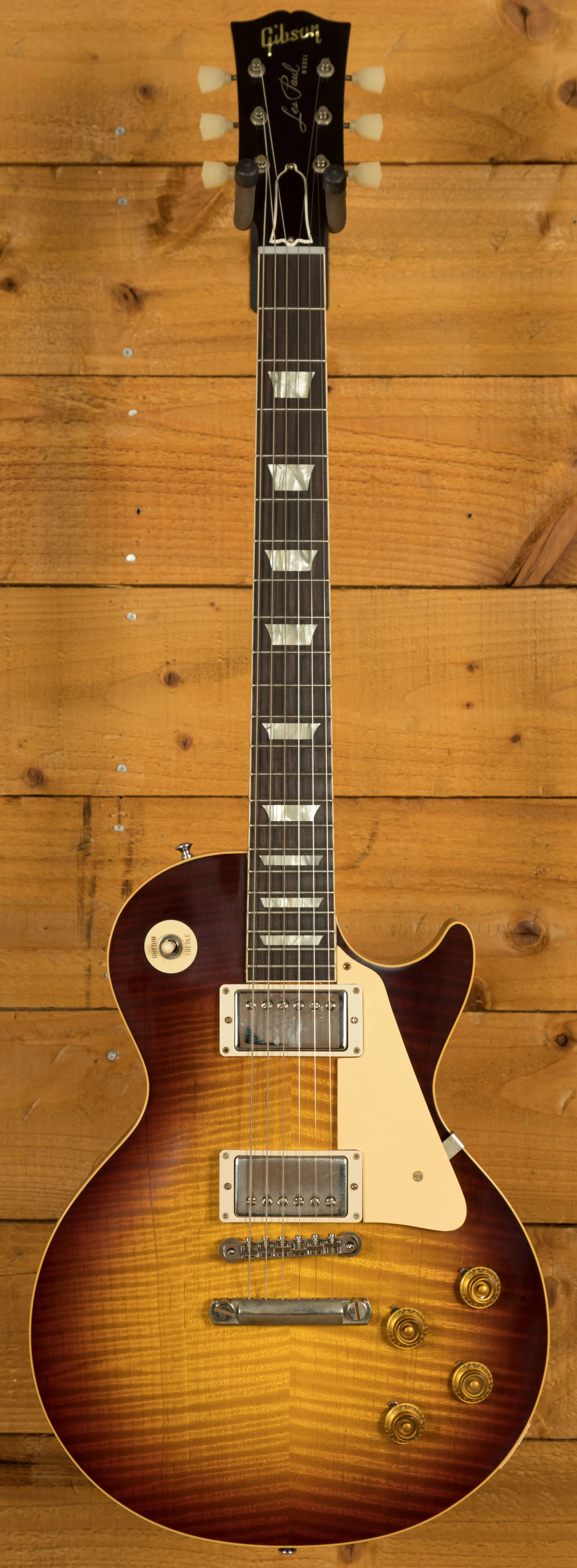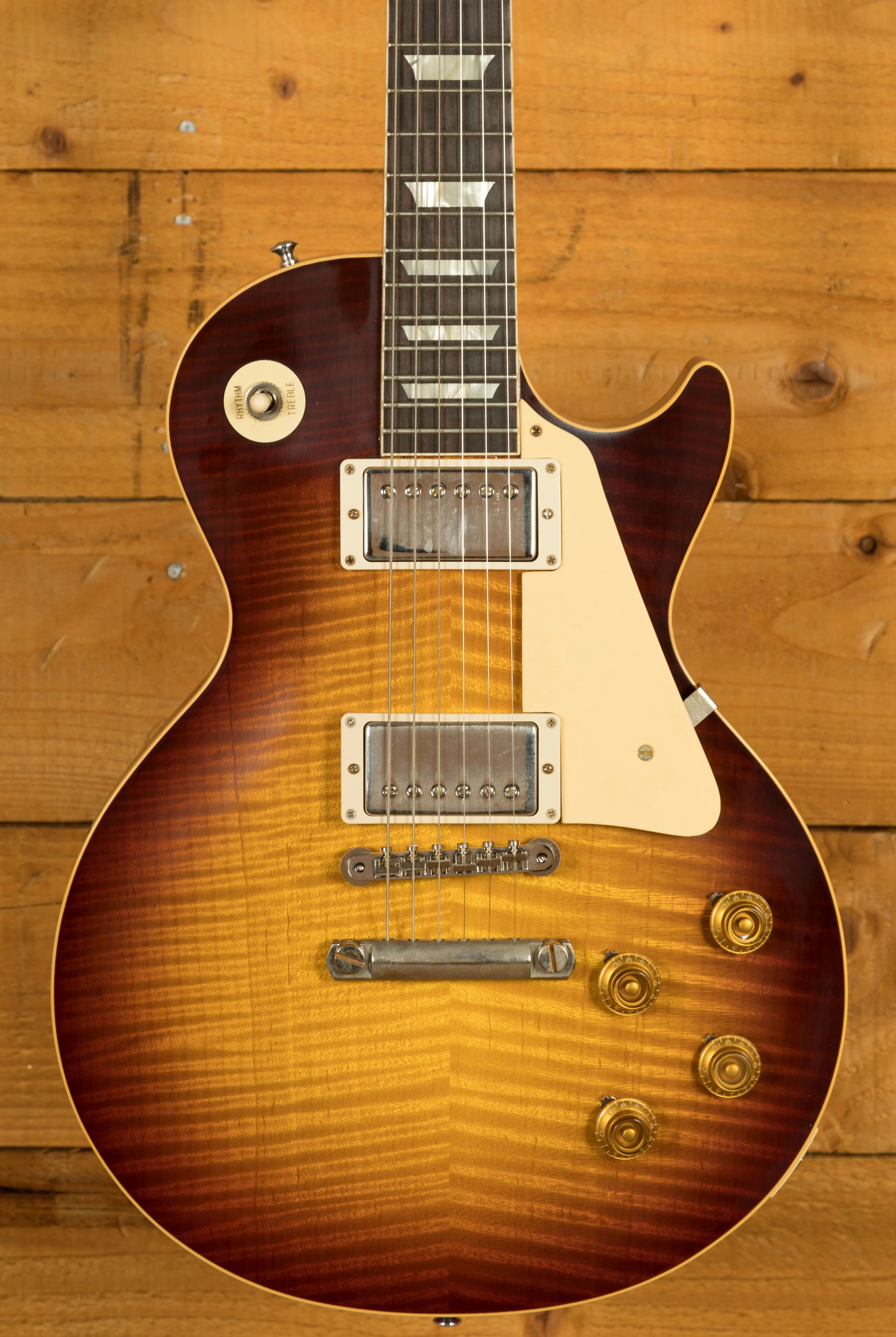 With a Mahogany body, this Les Paul benefits from a hand picked figured Maple top for the ultimate tonewood partnership. We enjoy a very strong relationship with the Gibson Custom Shop here at Peach, with our very own John Priest taking regular trips out to the workshop to pick out some awesome tops for our guitars. The figuring on this beauty is incredible. Rich and super resonant it offers premium tone and timeless aesthetics, while the Royal Tea Burst VOS Nitro finish looks a million dollars and really allows the wood to breathe and the natural tone to sing through.this Les Paul is of the highest quality. The Custom Shop do an incredible job of capturing the feel of a vintage instrument. With hide glue construction, this Les Paul offers true vintage tonality.