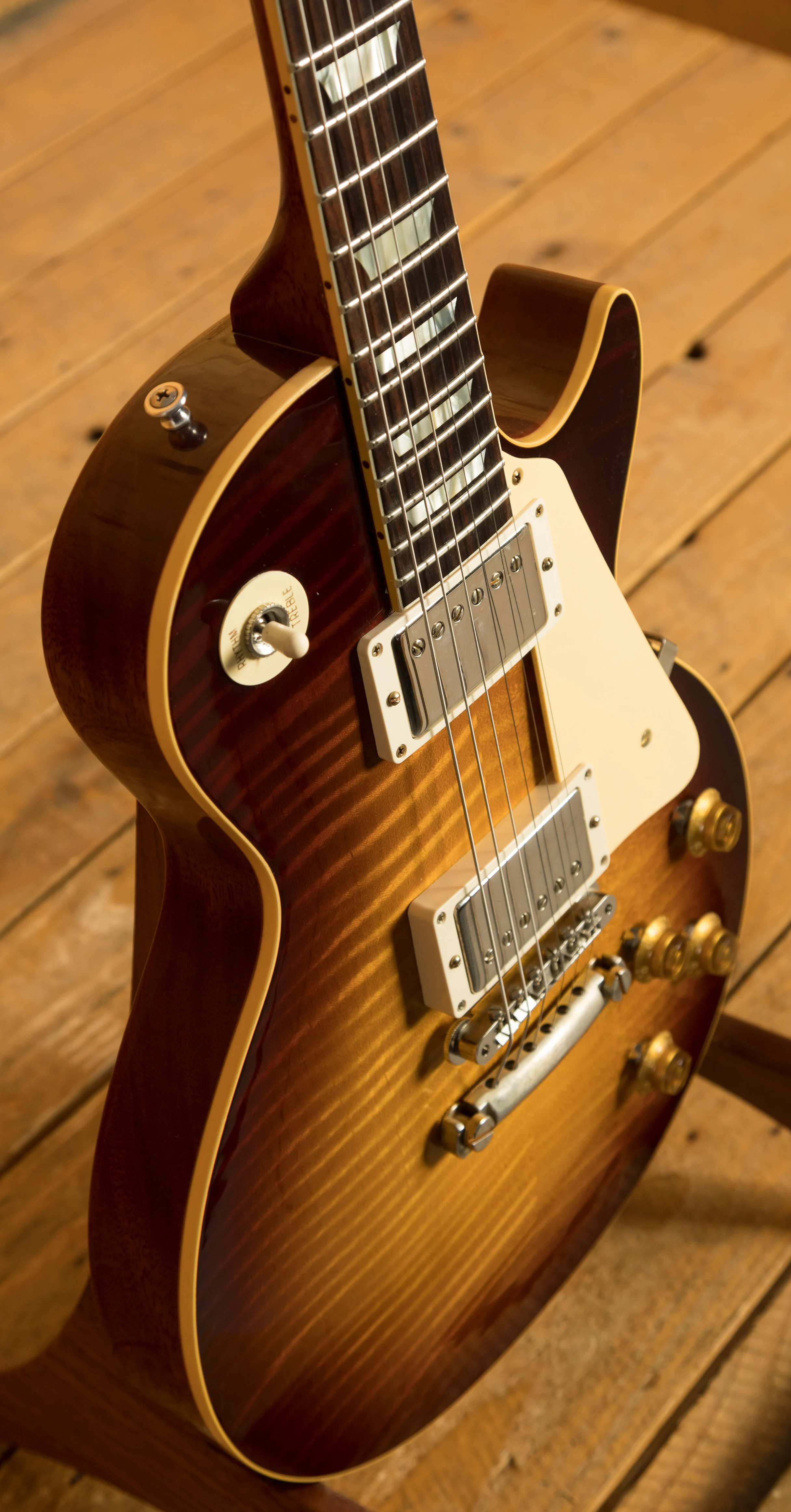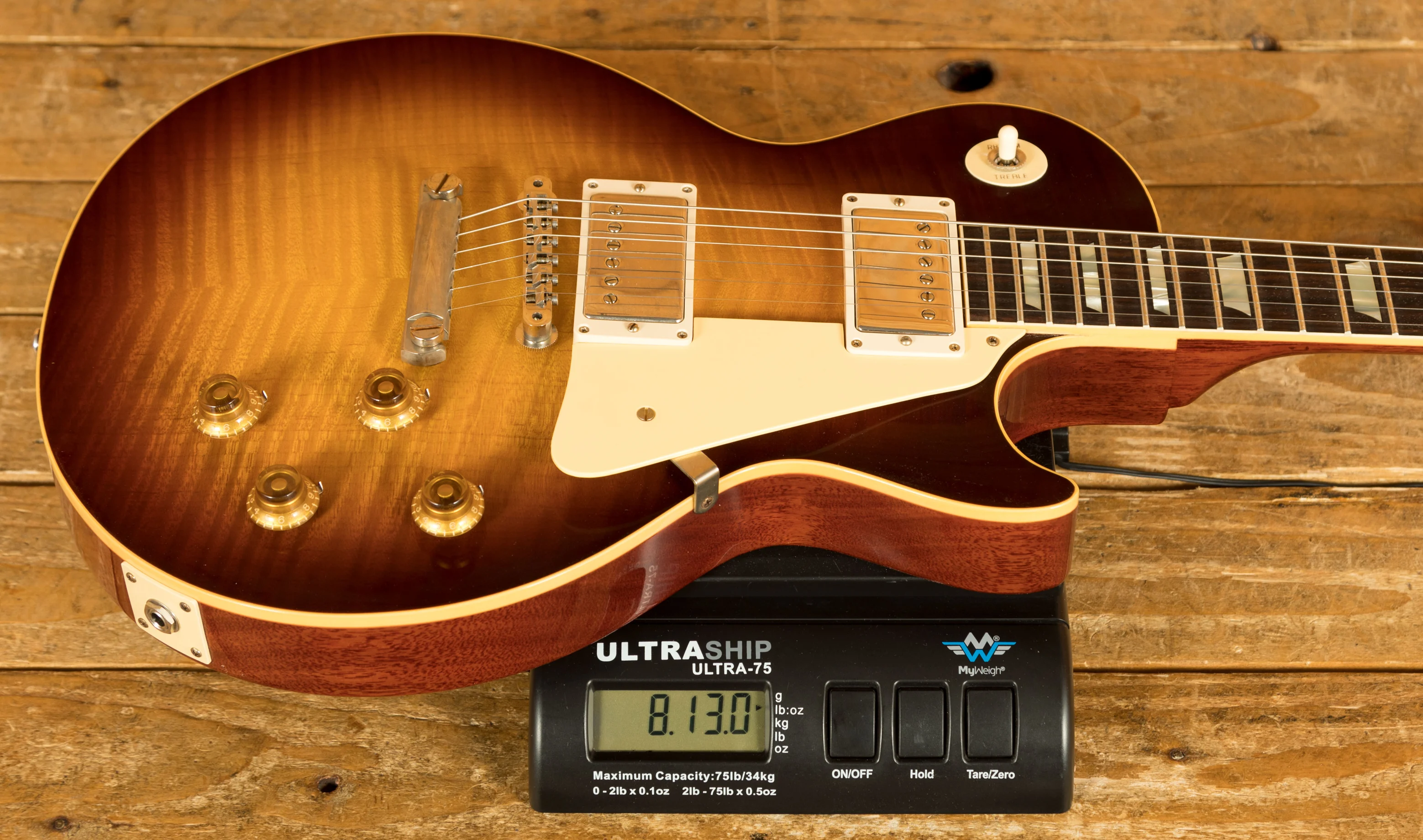 The solid Mahogany neck is topped with a crisp Indian Rosewood fingerboard with classic Gibson Trapezoid inlays, this guitar looks every bit the real deal. With a 24.75" scale length, 12" radius, 1.687" nut width and medium jumbo frets, it retains that classic Les Paul feel. The ABR-1 bridge and light weight stopbar offer an authentic vintage vibe.