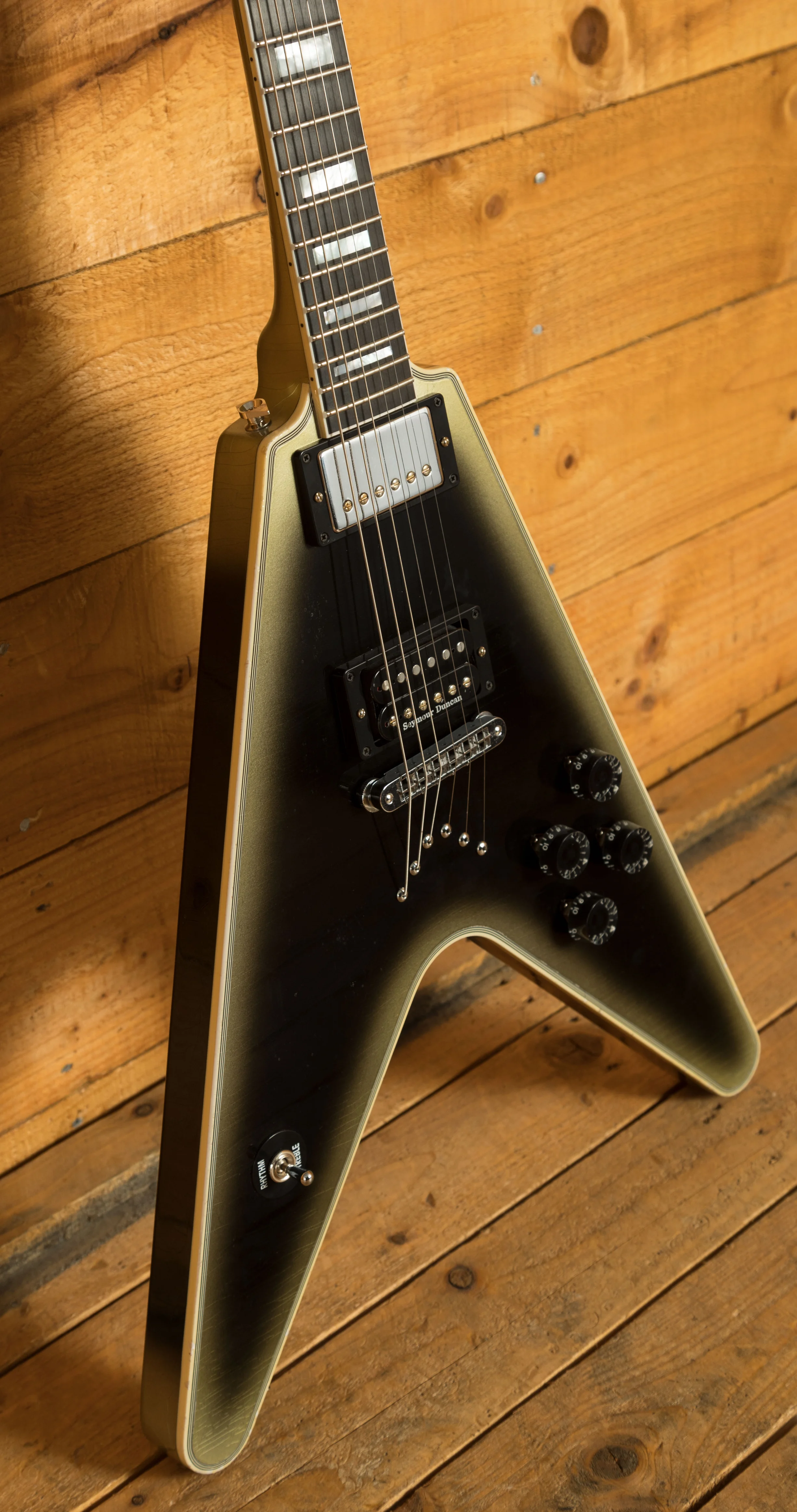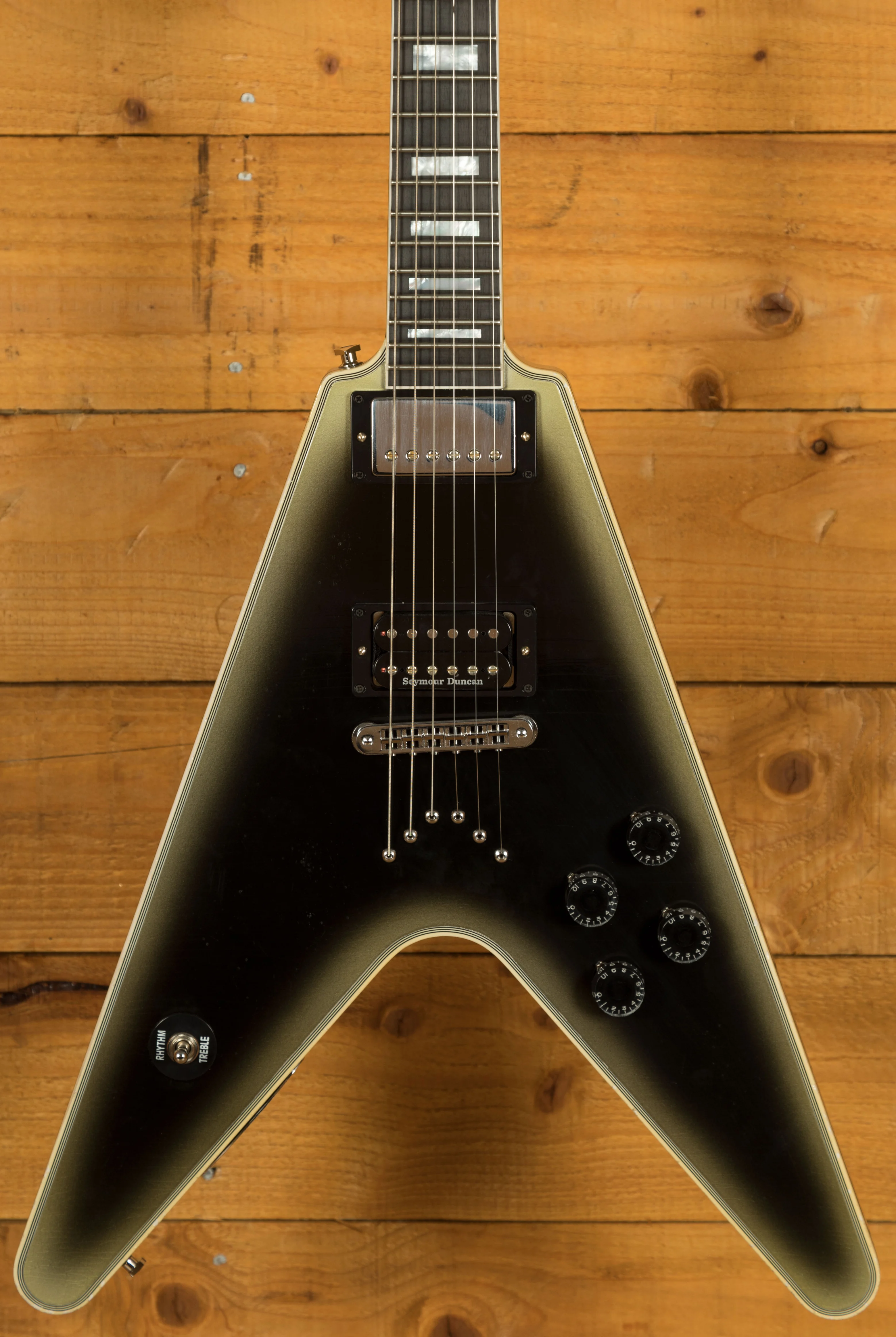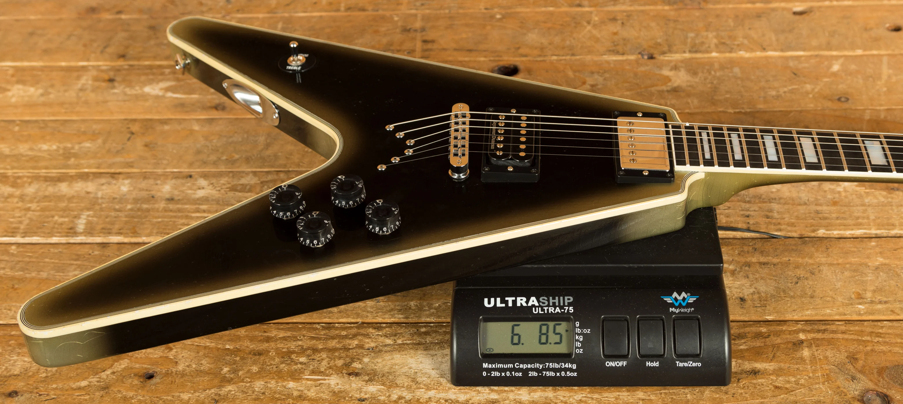 The 3-piece Maple neck boasts a 24.75" scale length, 22 frets, an Ebony fingerboard with Mother of Pearl block inlays and a comfortable medium C neck profile; it feels perfectly balanced and poised, just as a Flying V should. One of the defining features of the Adam Jones Flying V is the inclusion of Gibson’s lesser known Futura style headstock, this abstract design is certain eye-catching and will definitely turn a few heads!