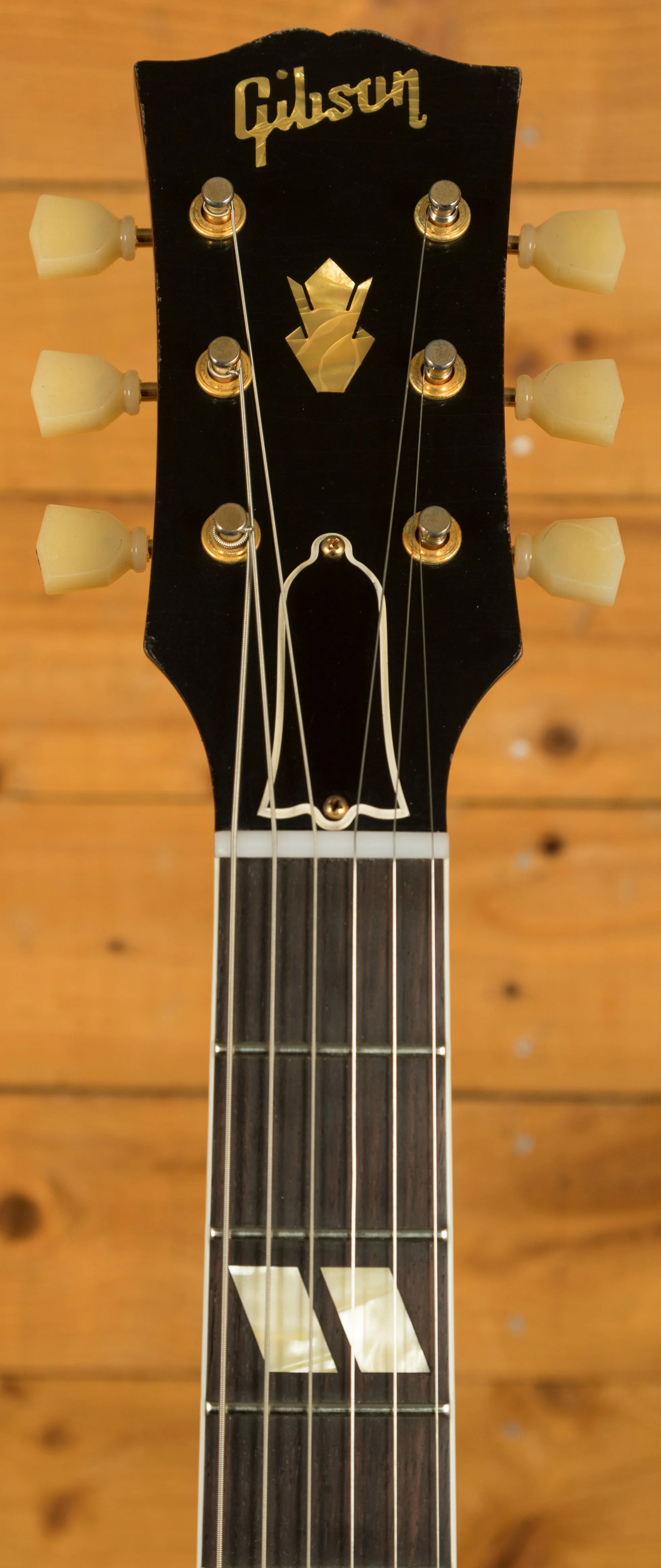 This guitar features a traditional three-ply ES body constructed from maple, poplar, and maple, along with a solid maple center block for added sustain and reduced feedback. Ensuring the colour of this guitar was as accurate as possible to the original was a serious challenge. The Gibson Custom team spent months analysing the original film, and other instruments crafted at the time to ensure the colour was just right, and they’ve done a wicked job. The Murphy Lab team have also done an incredible job aging this instrument. The subtle lacquer cracking, dings, and tarnished hardware really add to this guitars look and character.