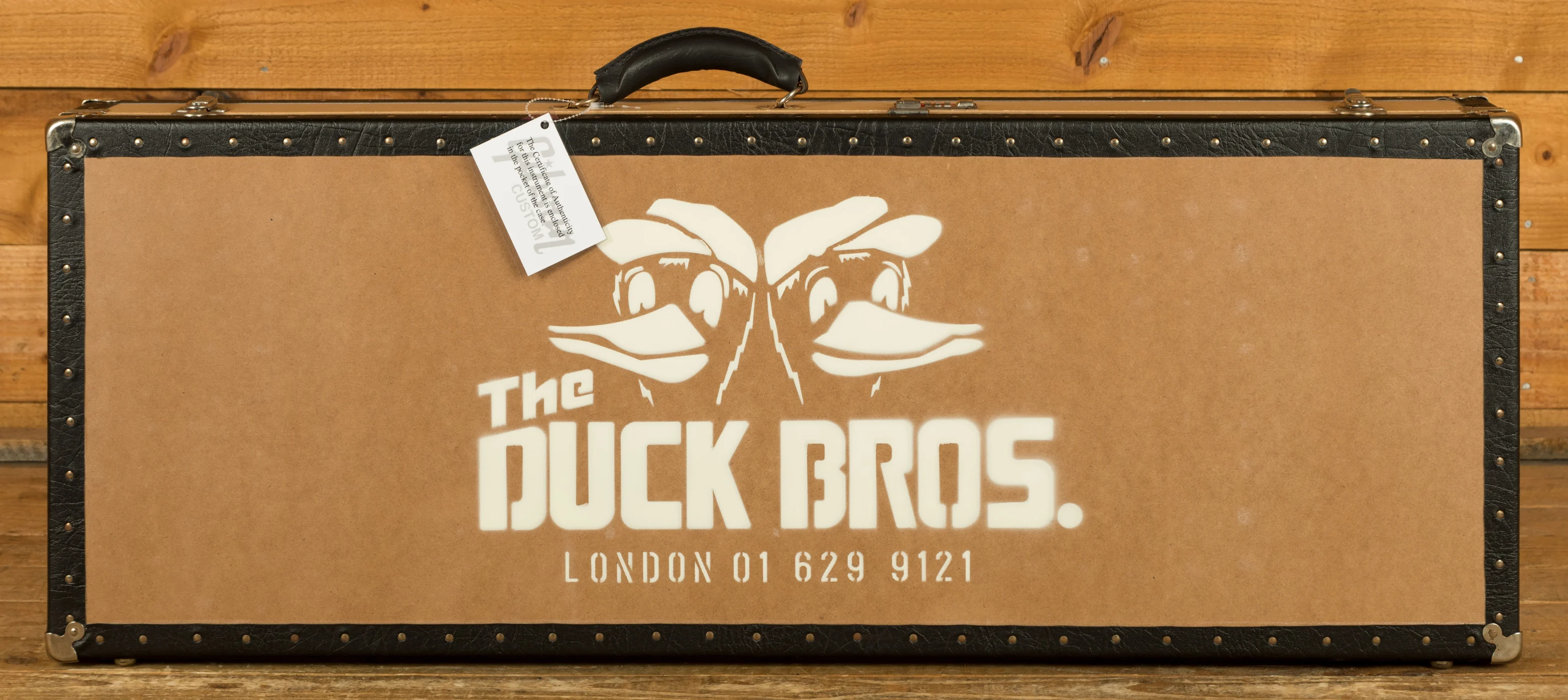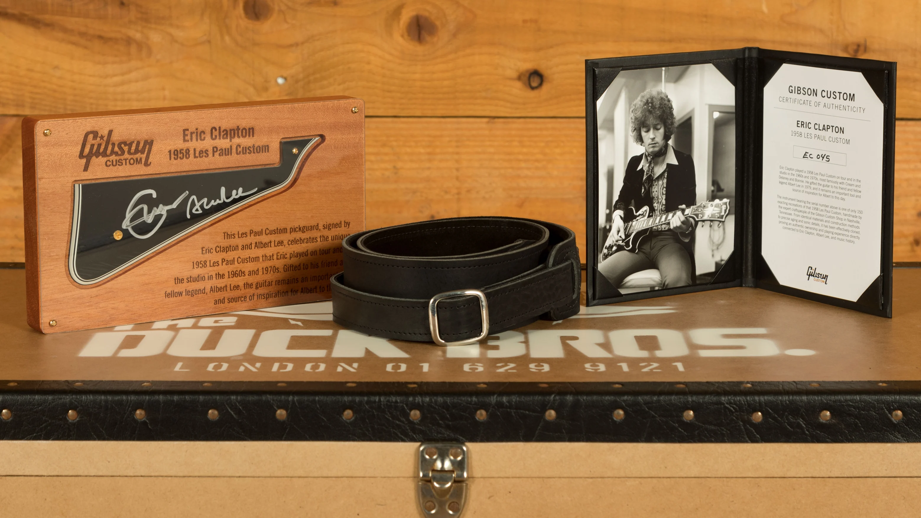 The guitar comes in a custom Duck Brothers-inspired case, designed specifically for this model. Included with the guitar is a second pickguard, which has been signed by both Eric Clapton and Albert Lee. This signed pickguard is presented in a separate wooden display case, adding to its collectable value. A Certificate of Authenticity, featuring a photograph by Chuck Stewart, authenticates the guitar's provenance. A black leather Archive Series strap and a Gibson Custom switch plate medallion are also included in the case. The guitar is handcrafted by the skilled luthiers of the Gibson Custom Shop and Murphy Lab in Nashville, Tennessee, ensuring the highest level of quality and craftsmanship.