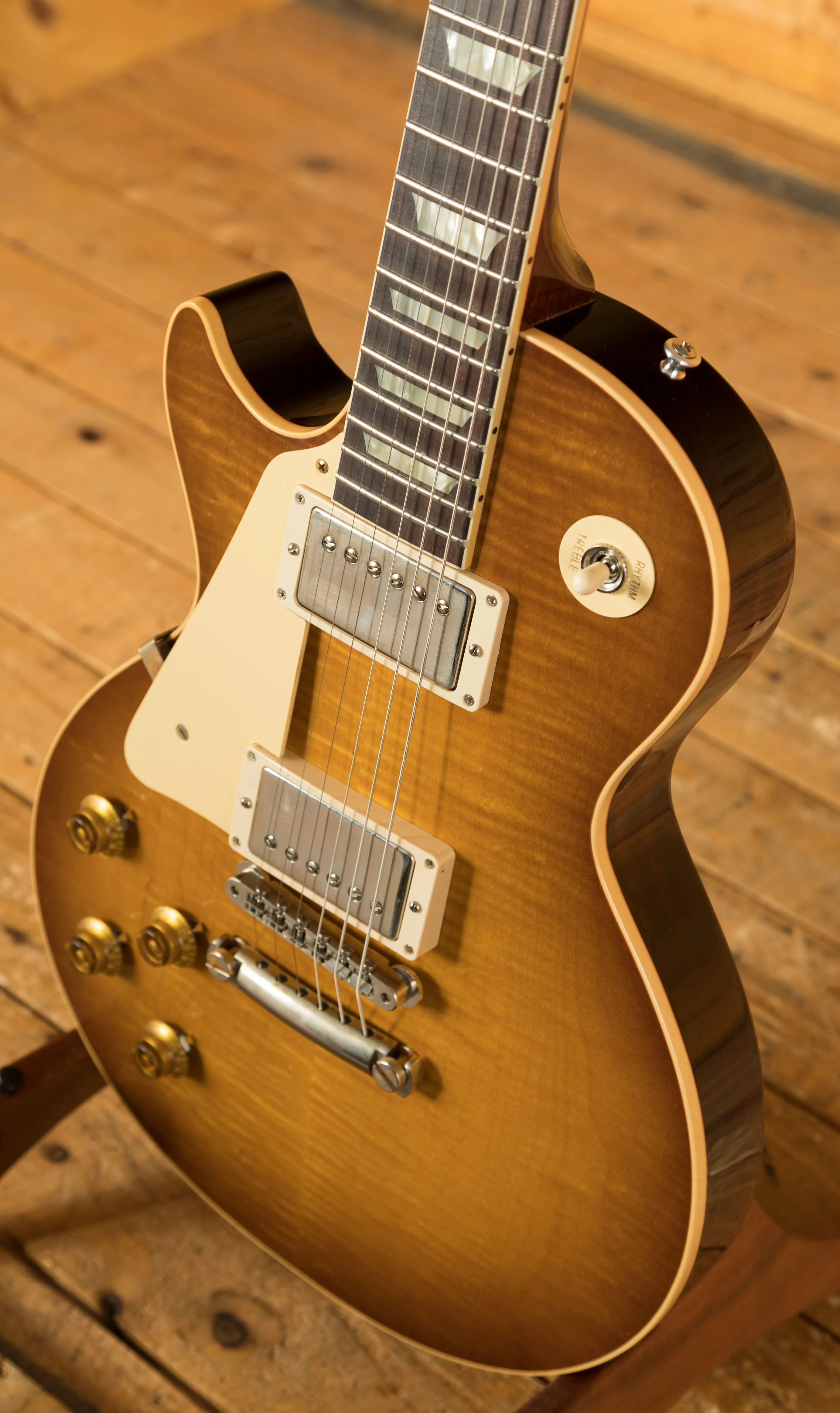 The solid Mahogany neck is topped with a crisp Indian Rosewood fingerboard with classic Gibson Trapezoid inlays, this guitar looks every bit the real deal. With a 24.75" scale length and medium jumbo frets, it retains that classic Les Paul feel. The no wire ABR-1 bridge and light weight tailpiece offer an authentic vintage vibe.