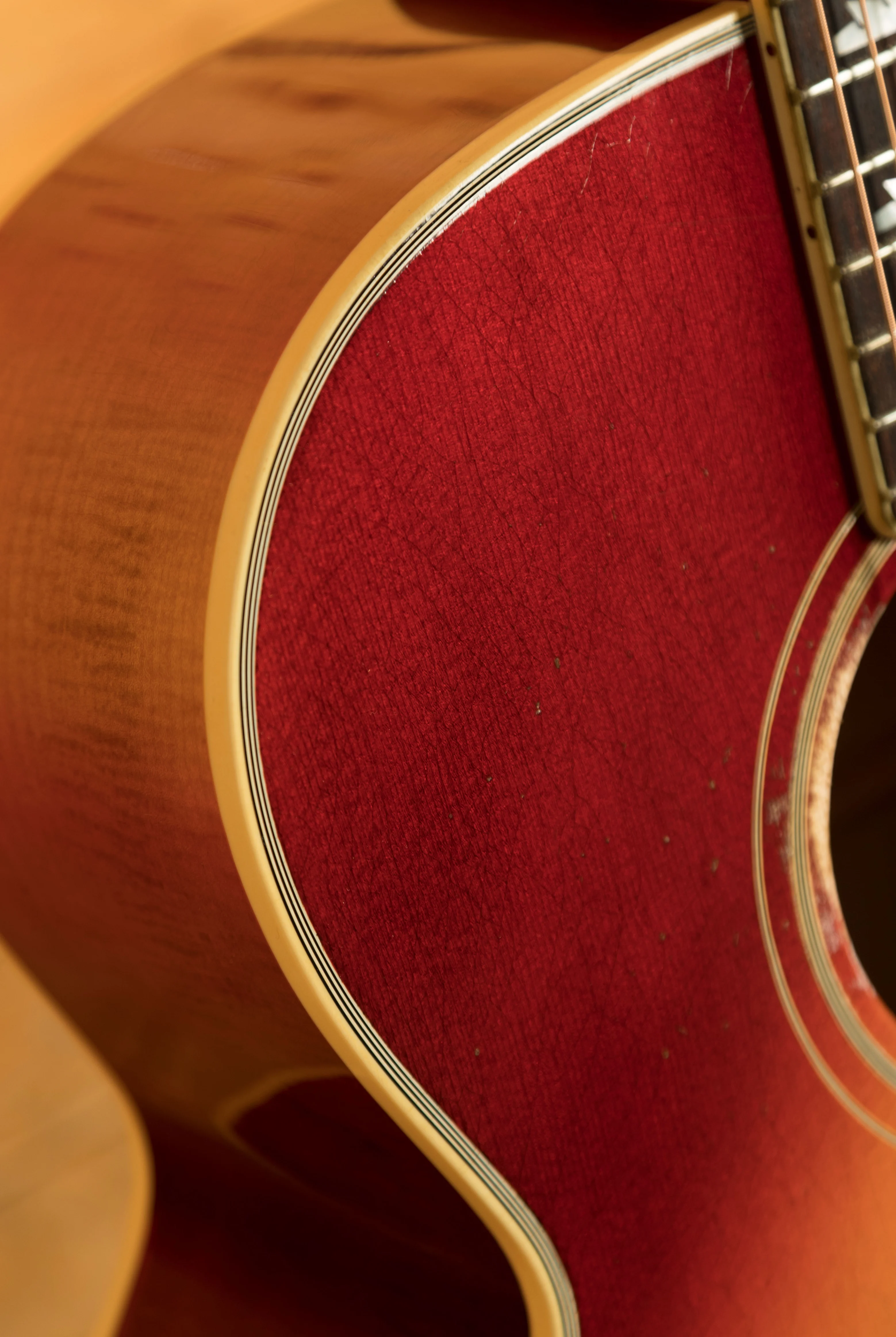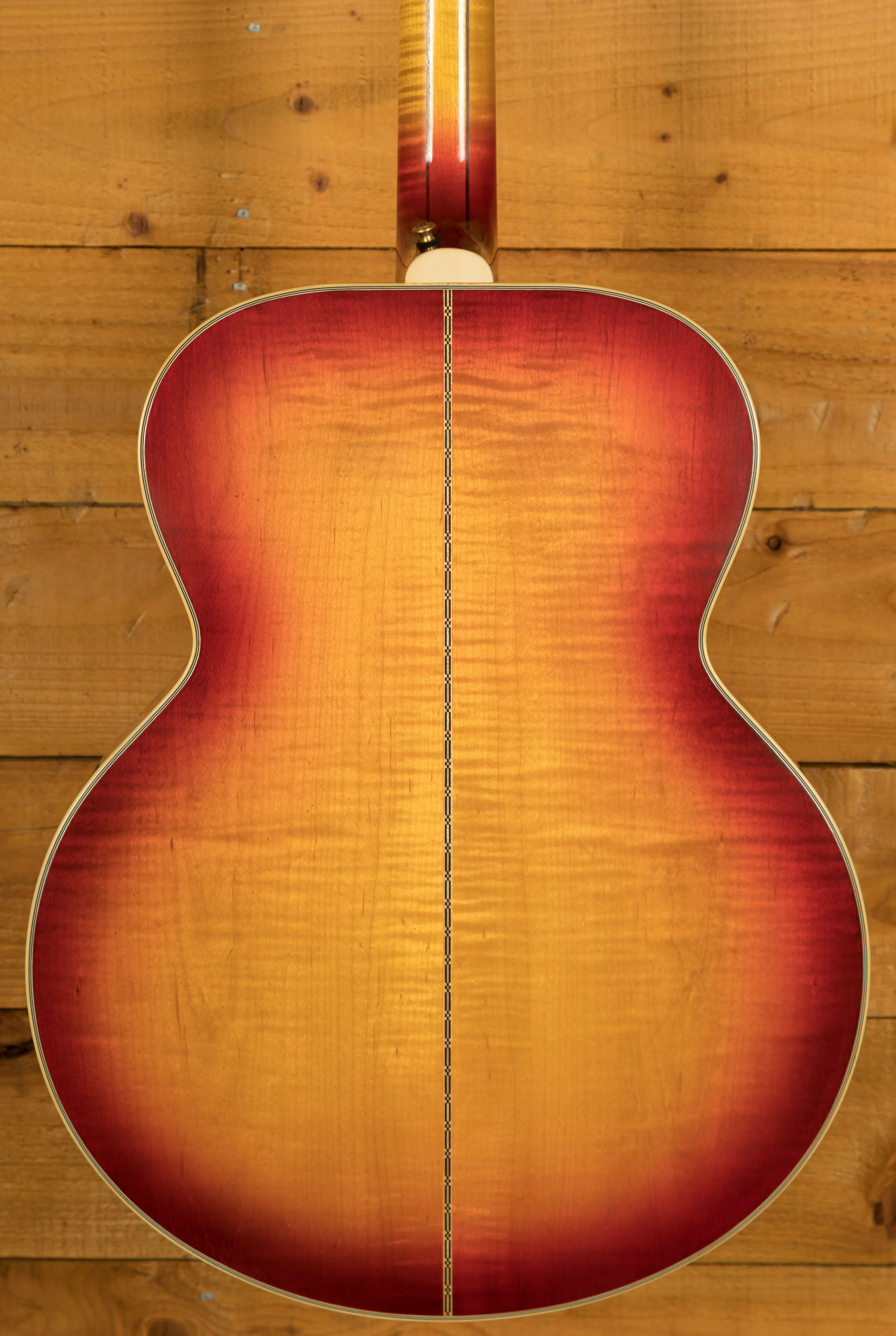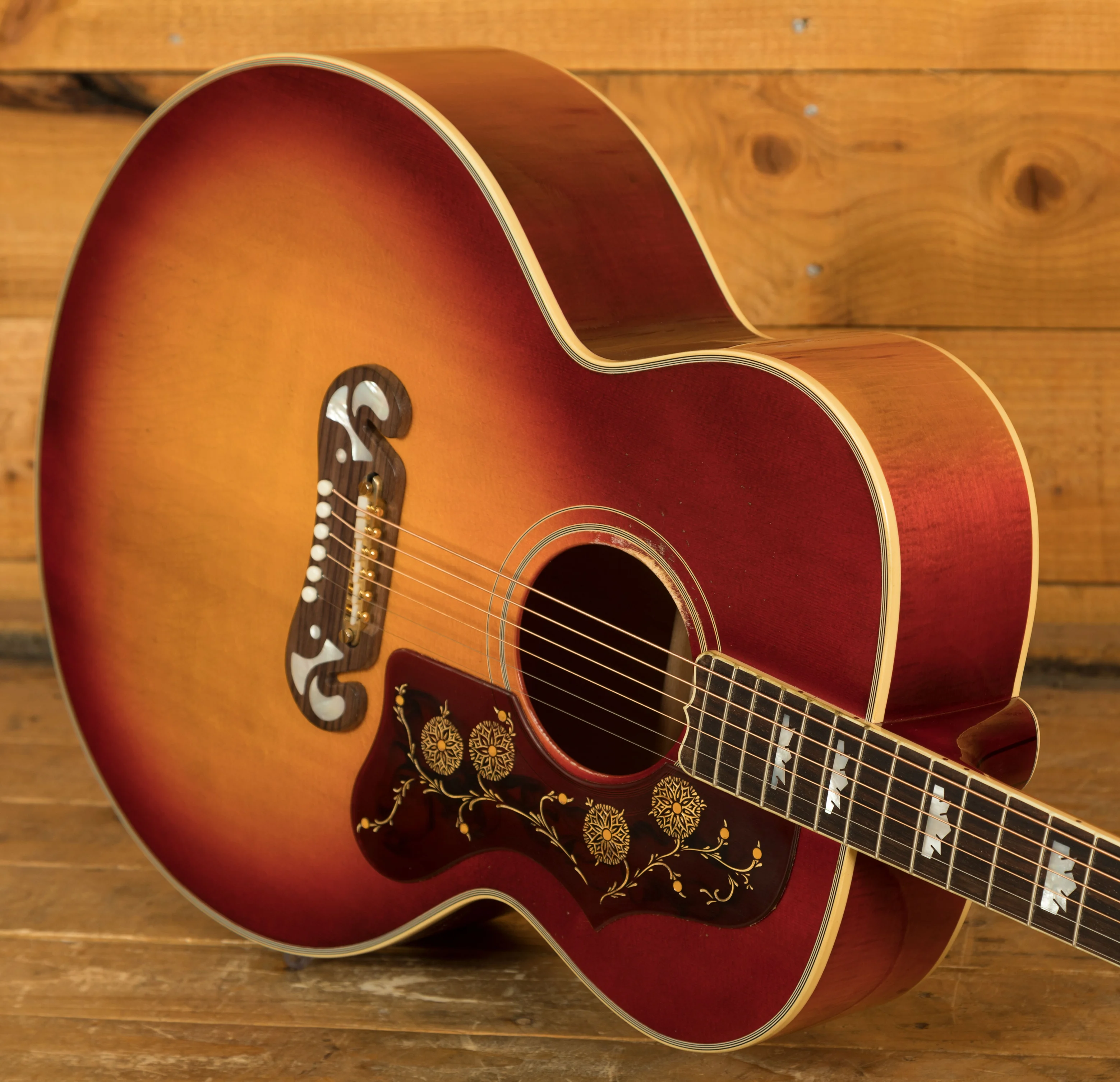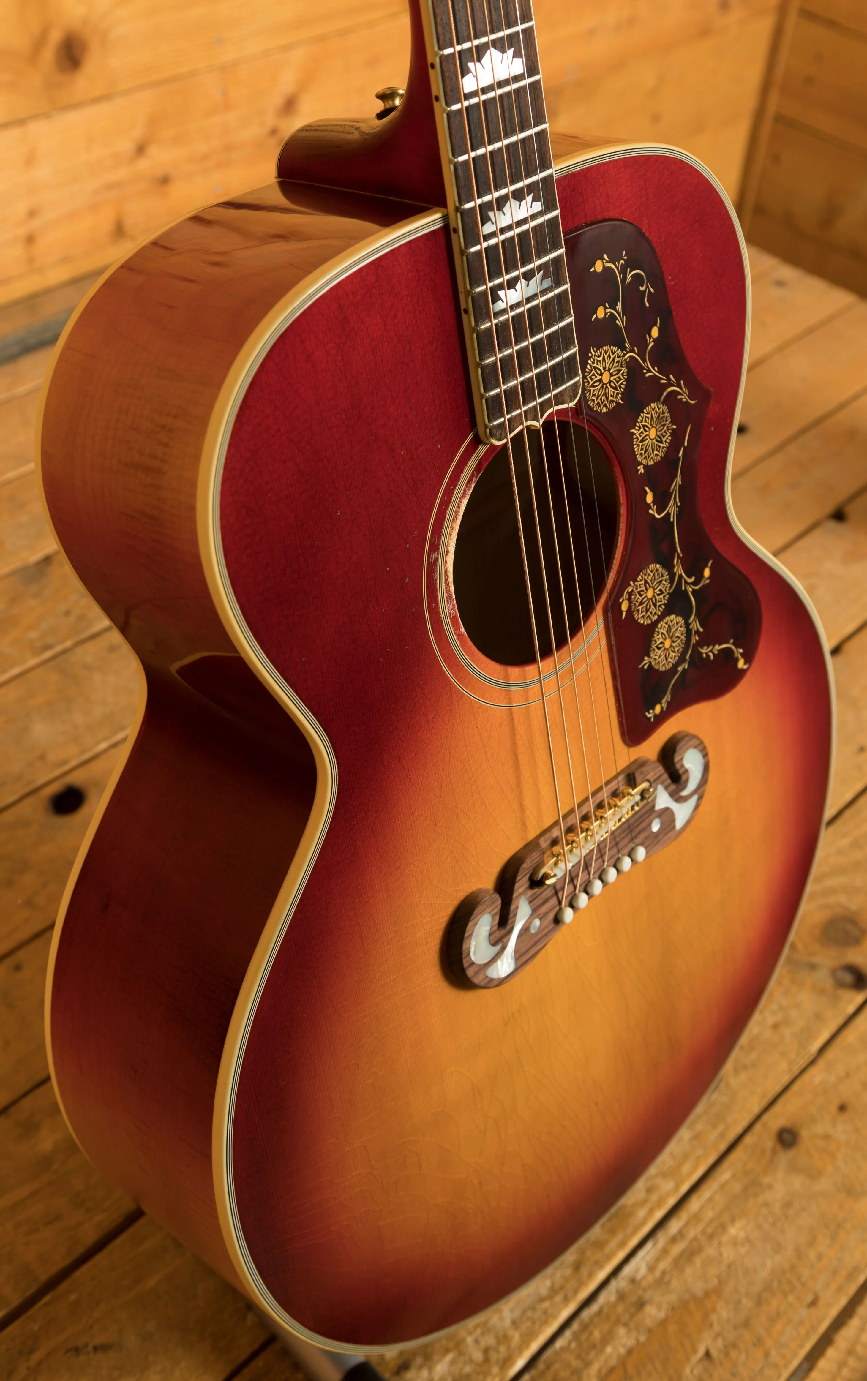 The Gibson Jimmy Page 1964 SJ-200 Collector's Edition is a meticulously crafted, limited edition acoustic guitar designed in collaboration with Jimmy Page. Every aspect of this instrument, from its tone to its aesthetic features, has been shaped by Page's personal input, ensuring it delivers a truly authentic experience. The guitar features highly flamed AAA maple for the back and sides, paired with a AAA Sitka spruce top and multi-ply front and back binding. This combination of premium tonewoods, along with a slightly deeper Super Jumbo body design, gives the guitar a distinctive and unique sound.