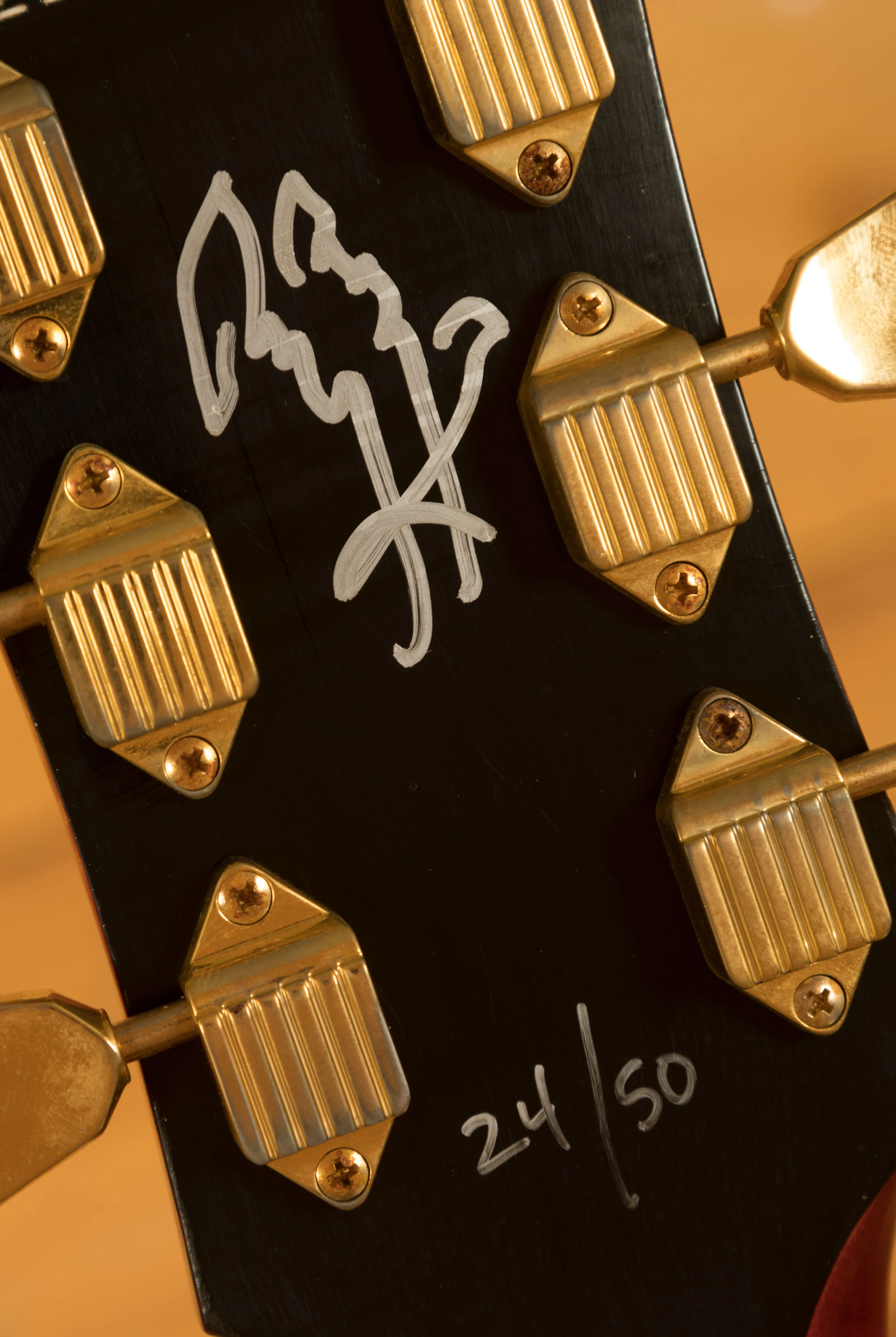 The 60s-style solid rosewood Moustache bridge, adorned with mother-of-pearl inlays, is equipped with a gold Tune-O-Matic bridge with nylon saddles, offering a unique tonal character. The guitar also includes vintage-style gold Kluson Waffleback tuners with Keystone buttons, complementing its classic design. Each guitar in this series is not only hand-signed by Jimmy Page on the back of the headstock but has been personally played by him, with the plectrum used also included with the guitar in a custom wooden pickholder. This truly is an incredibly rare collector's item.
