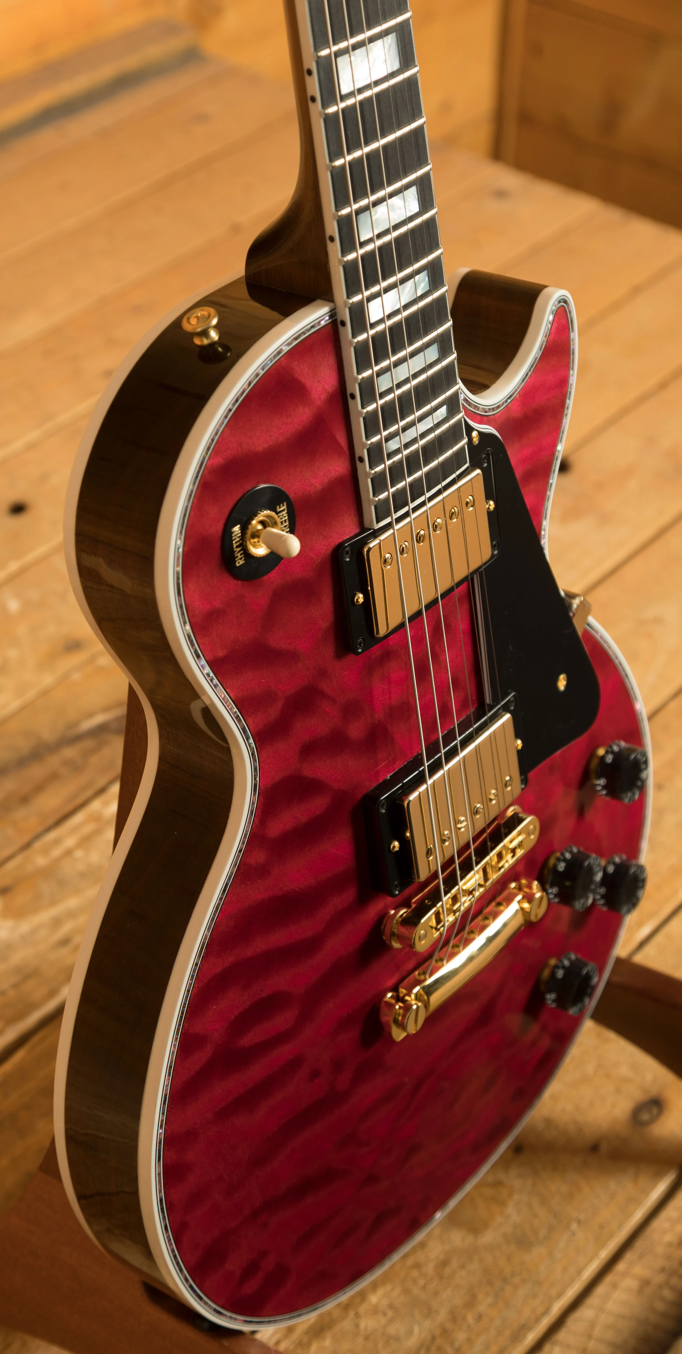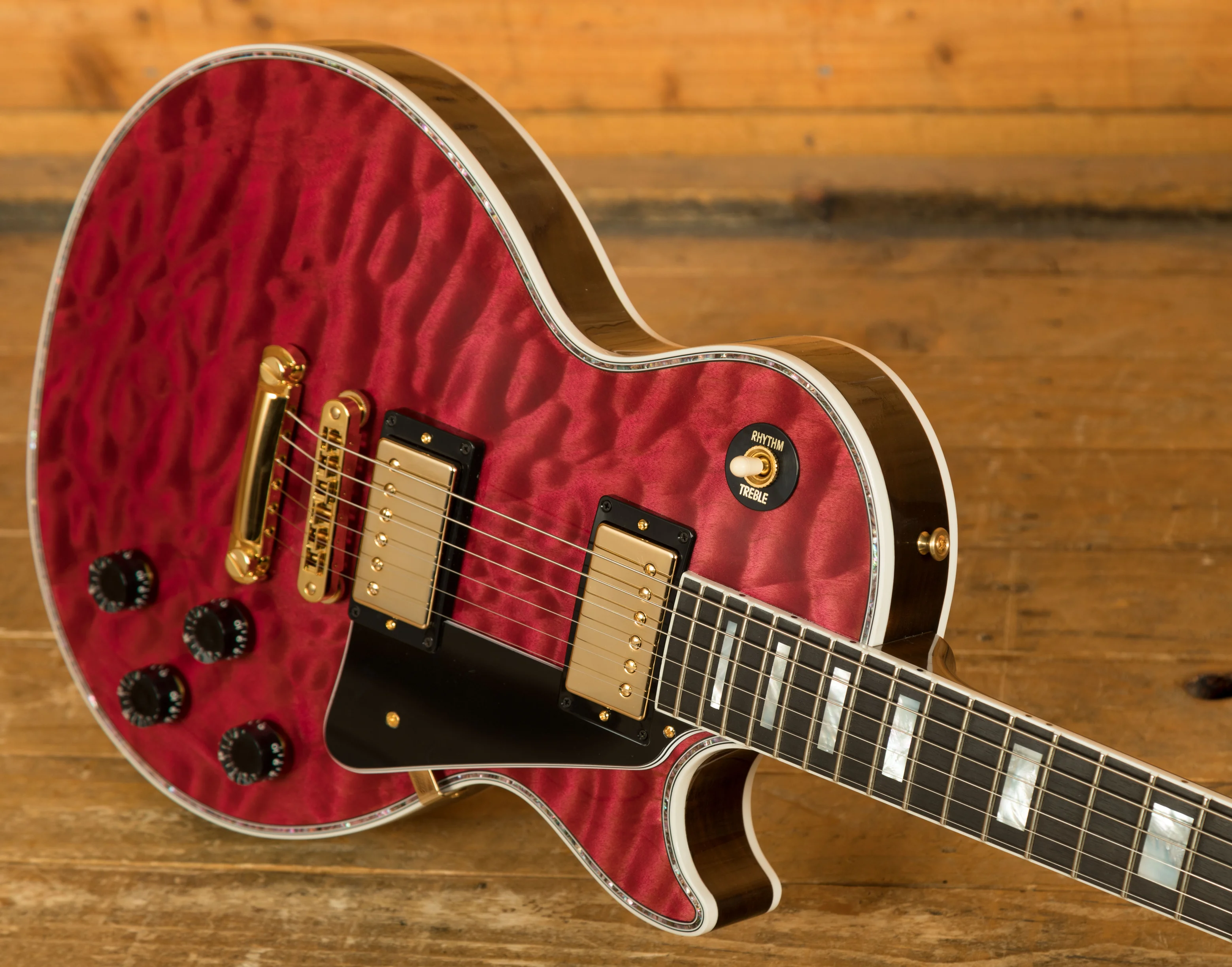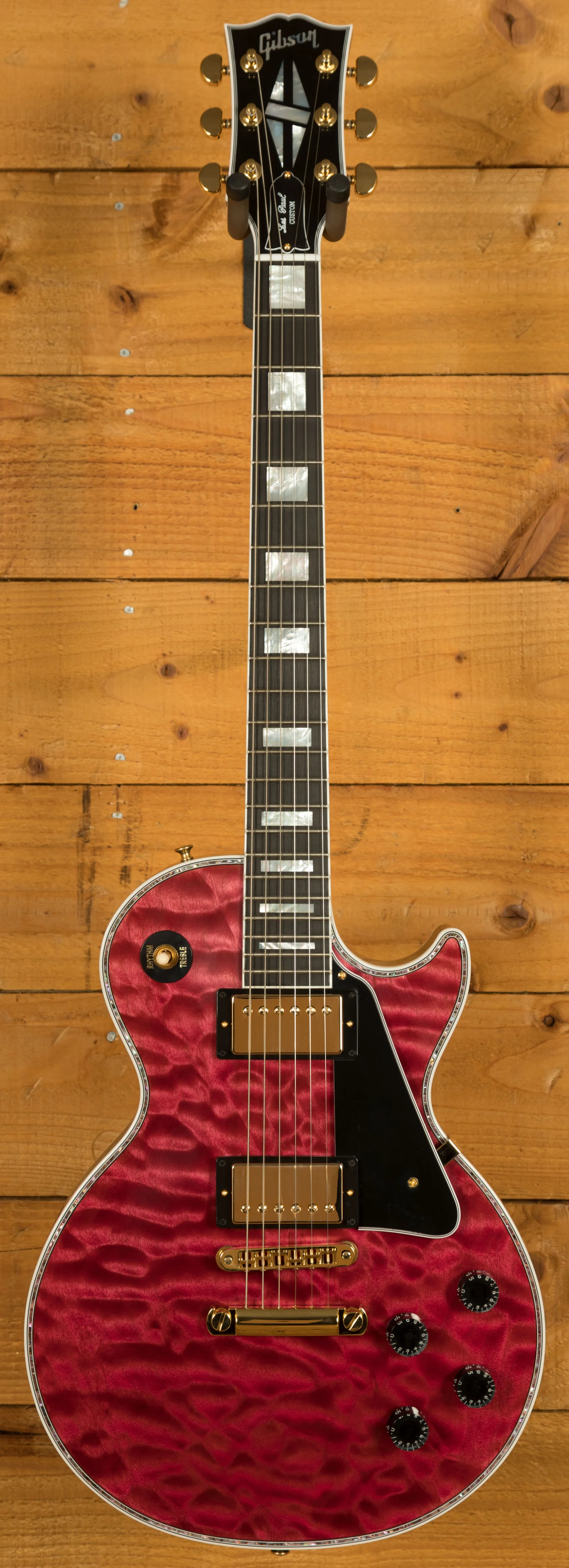Here's something truly special from the Gibson Custom Shop: a Les Paul Custom 5A Quilt Top in Chablis Pink VOS. This guitar is an amazing looker that packs a punch, featuring a stunning, hand-picked ONE-PIECE 5A Quilt Maple top that truly pops with incredible depth and movement, all finished in a captivating Chablis Pink. This guitar's exceptional one-piece 5A Quilt Maple top is incredibly rare, representing only the second such example we've seen since 2006, truly setting it apart from virtually any other Les Paul Custom.