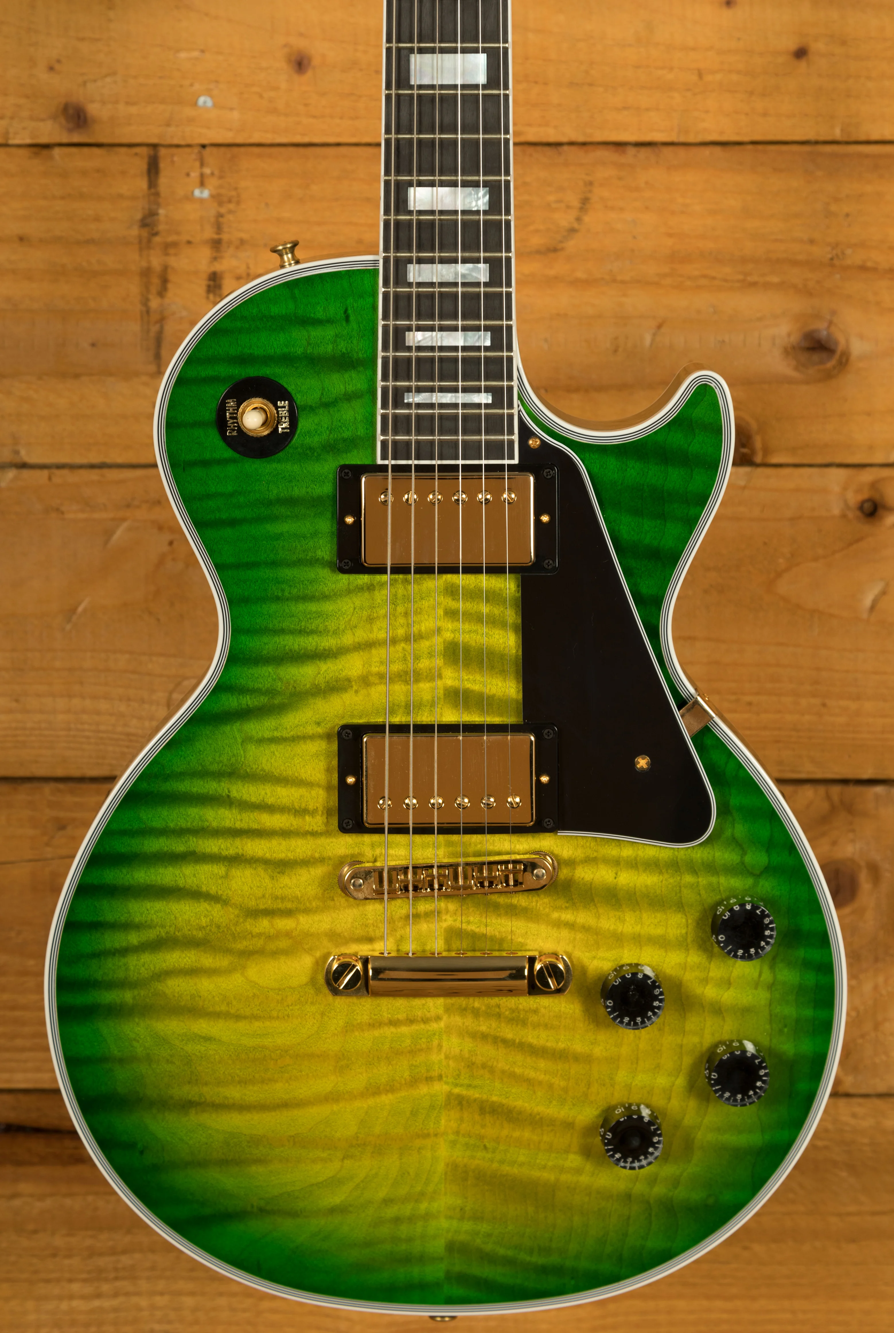 The Gibson Les Paul Custom is the ultimate way to experience what makes the Les Paul so special. With a solid Mahogany body and a carved AAA Figured Maple Top, the Custom is finished in stunning Iguana Burst with Gold hardware. I think it's fair to say it's a real eye catcher.