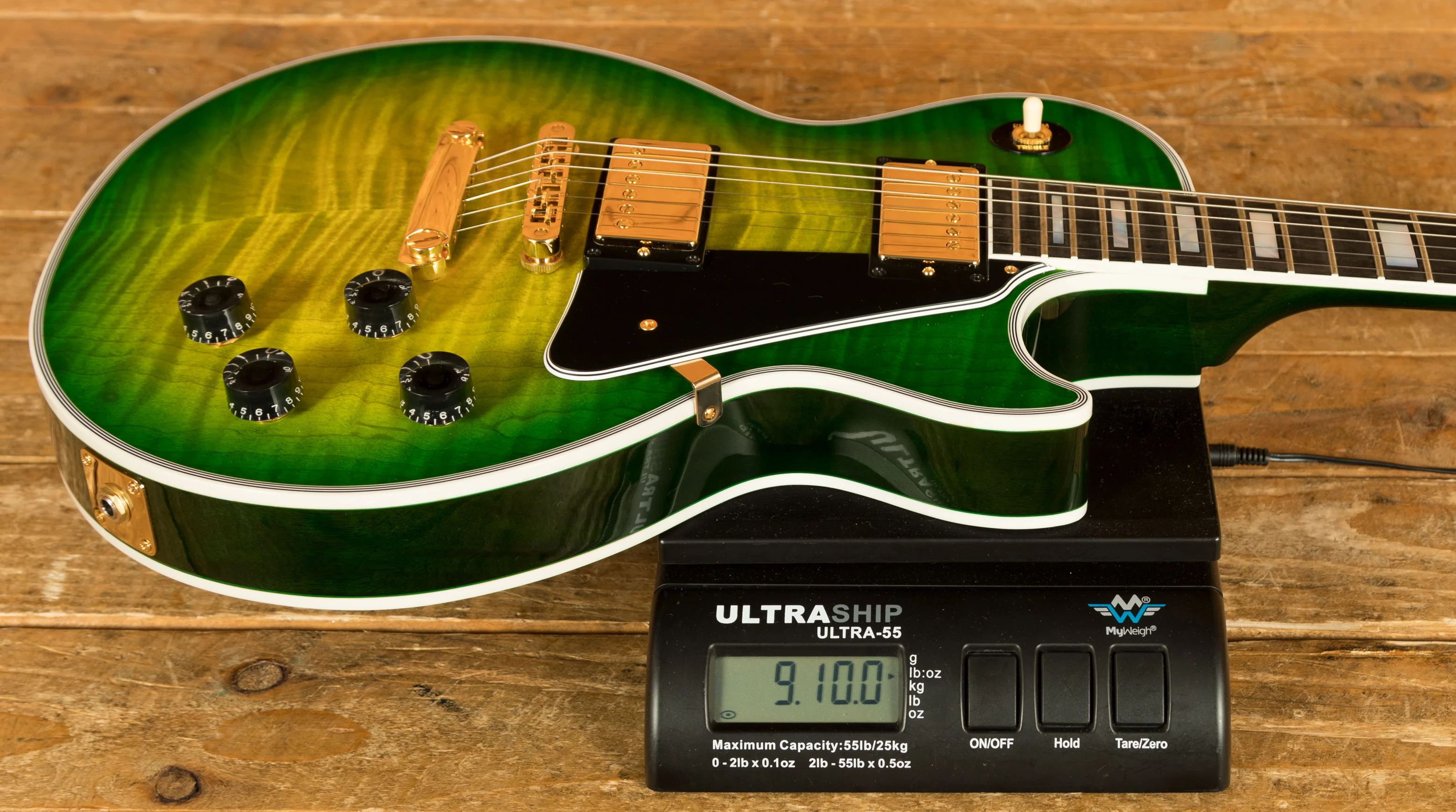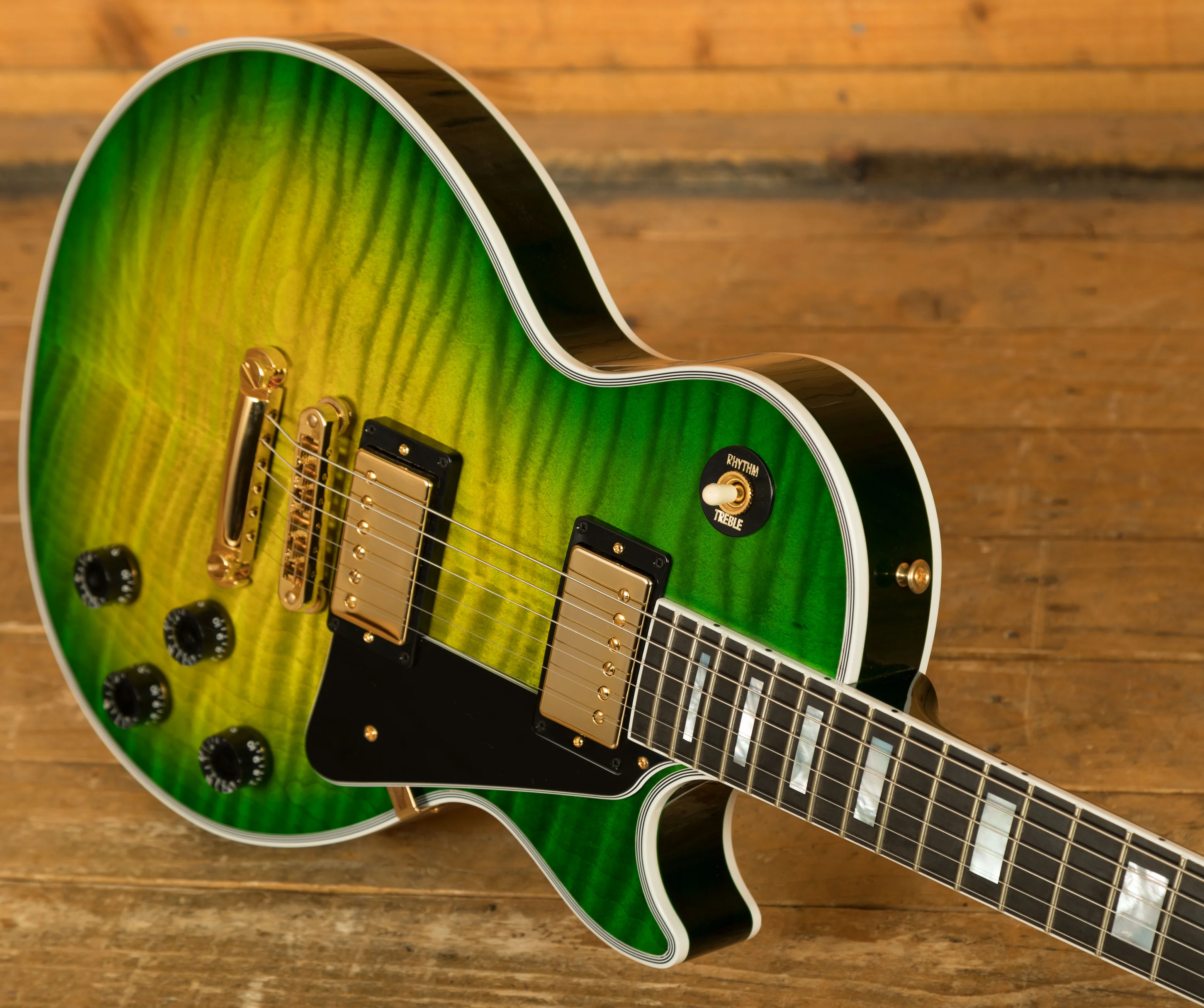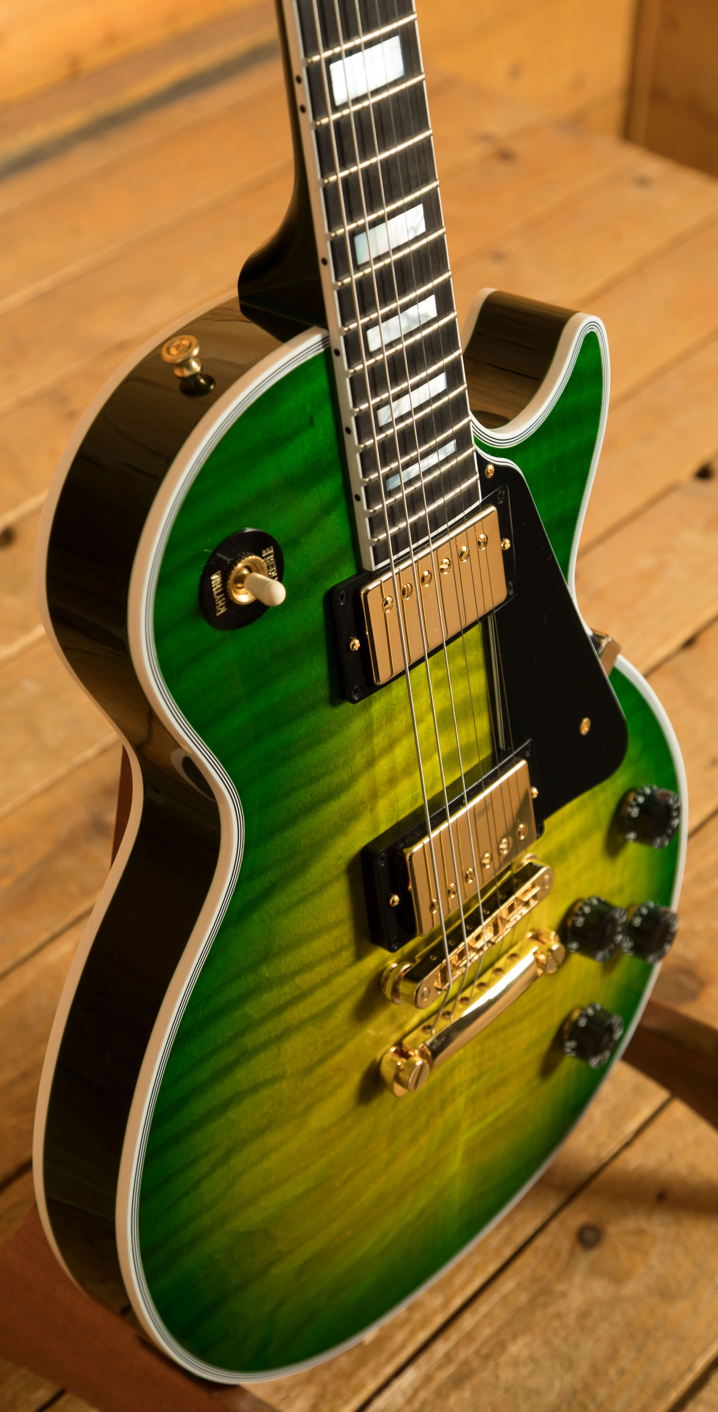 The Mahogany neck boasts a 24.75" scale length, an Ebony fingerboard with Pearloid block inlays; it feels perfectly balanced and poised, just as a Les Paul should. This is the long awaited return of the Ebony board, this is the ultimate powerhouse LP!
