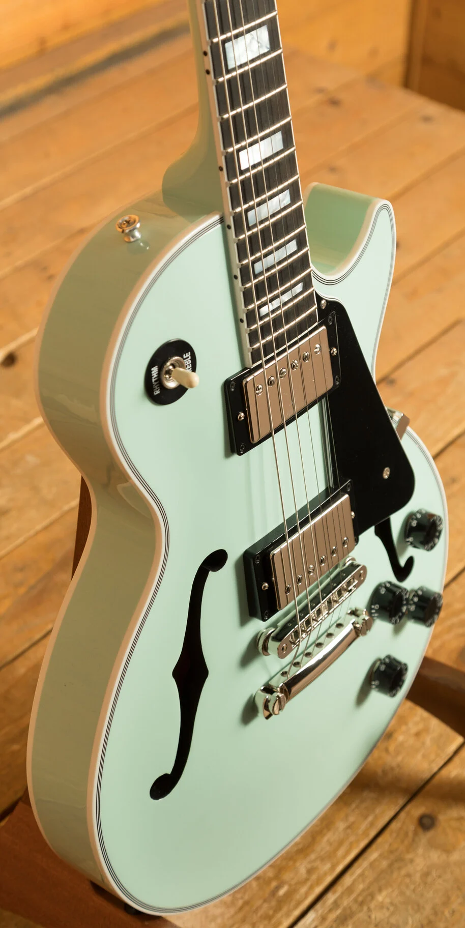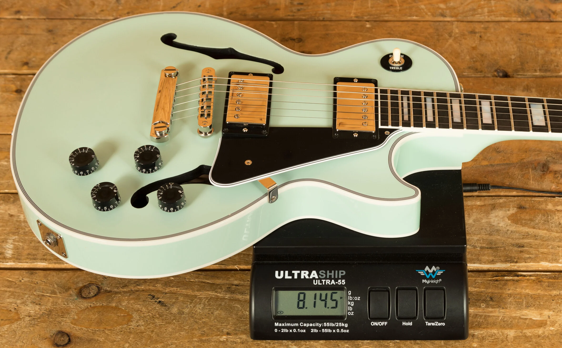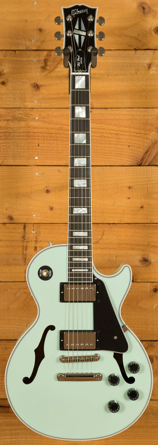 Fresh from our latest batch of custom spec Gibsons is this cool and unique twist on a modern collection Les Paul Custom. The Kerry Green finish alone already gives this Les Paul Custom a colourful face lift with tonnes of character but under the hood is a chambered Mahogany body and a Maple top with F-Holes that give it an open sound akin to what you'd expect from an ES semi-hollow. This guitar is all about unique looks and unique sounds.