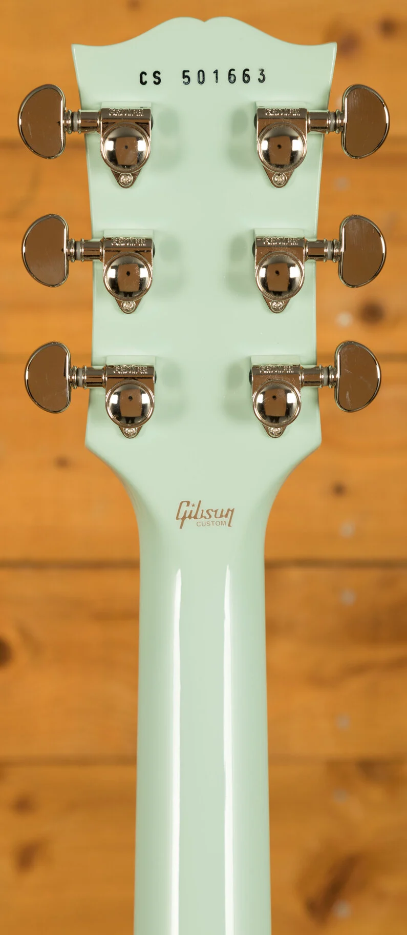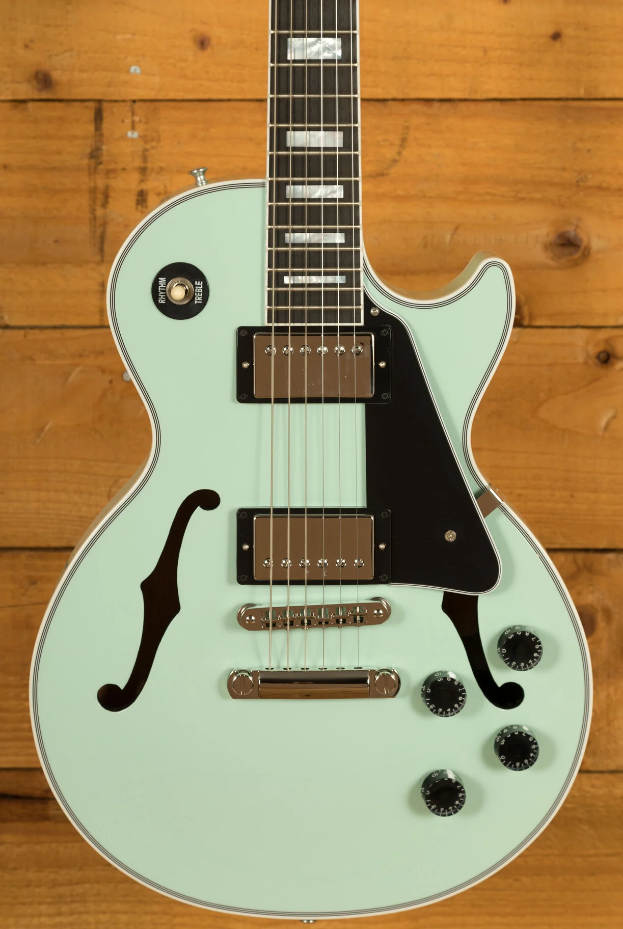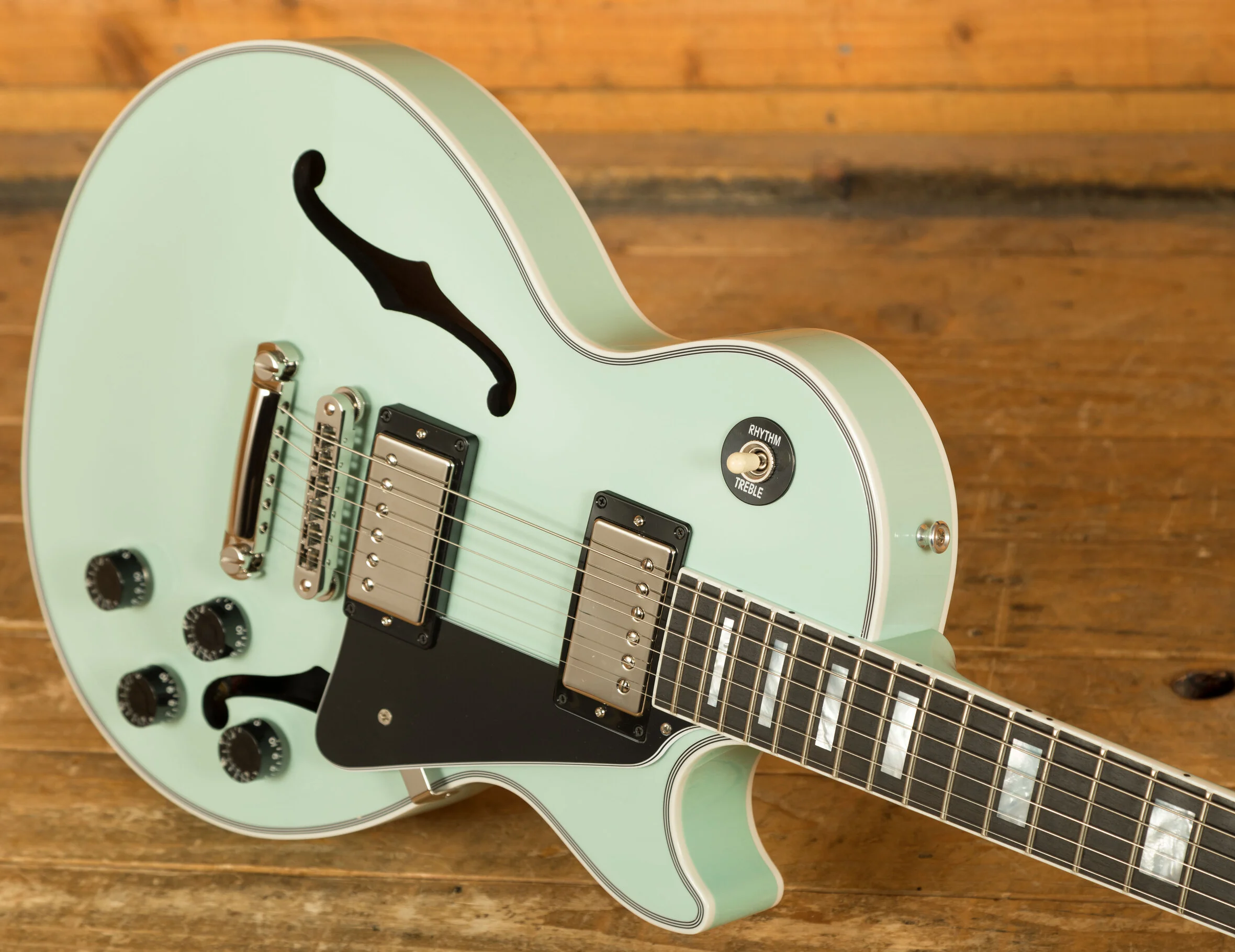 Fresh from our latest batch of custom spec Gibsons is this cool and unique twist on a modern collection Les Paul Custom. The Kerry Green finish alone already gives this Les Paul Custom a colourful face lift with tonnes of character but under the hood is a chambered Mahogany body and a Maple top with F-Holes that give it an open sound akin to what you'd expect from an ES semi-hollow. This guitar is all about unique looks and unique sounds.