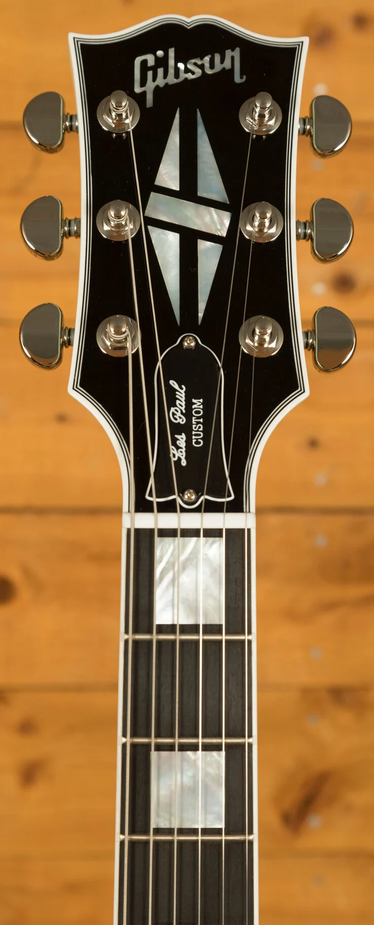 The rest of the specs are pretty inline with other modern collection Les Paul Customs so besides weight, looks, and tone, it should feel very similar. The 24.75" scale length Mahogany neck features a 12" radius Ebony fingerboard with 22 Jescar FW45100 frets for a silky smooth feel underhand. The LPC Modern Medium C neck profile measures .820" at the 1st fret and .965" at the 12th. With Mother-of-Pearl Block inlays and black and white multi-ply top and back and white neck binding, this guitar still holds all the class of a Les Paul Custom.