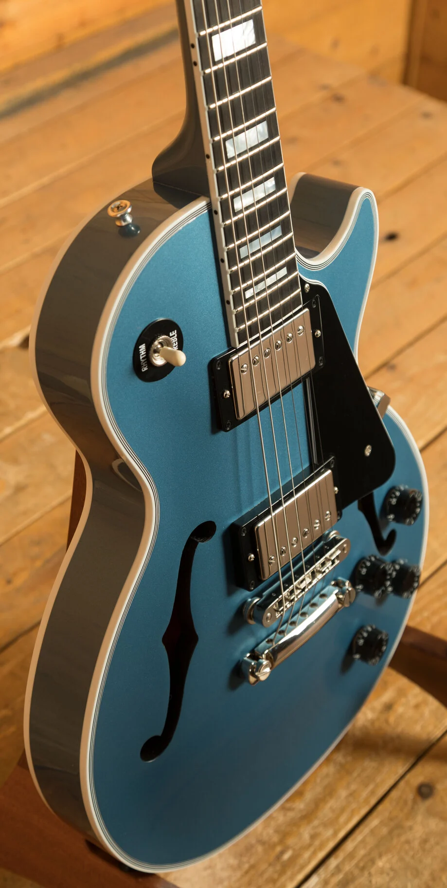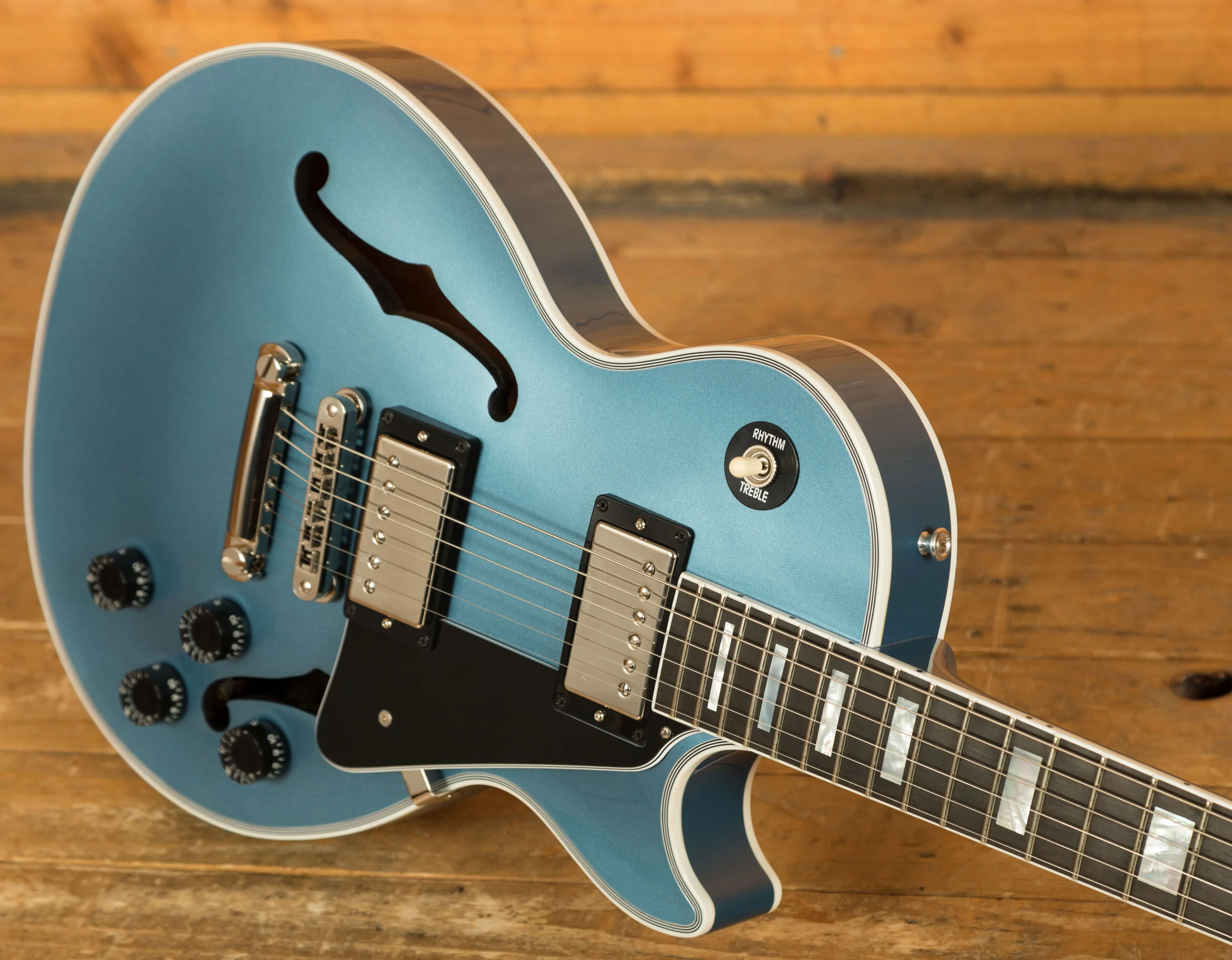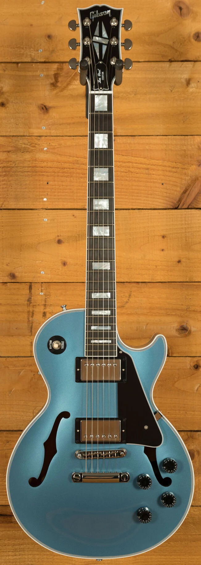 Fresh from our latest batch of custom spec Gibsons is this cool and unique twist on a modern collection Les Paul Custom. The Pelham Blue finish alone already gives this Les Paul Custom a colourful face lift with tonnes of character but under the hood is a chambered Mahogany body and a Maple top with F-Holes that give it an open sound akin to what you'd expect from an ES semi-hollow. This guitar is all about unique looks and unique sounds.