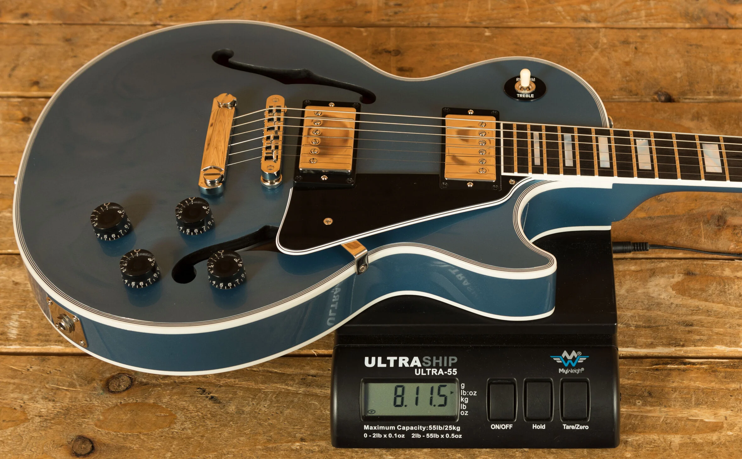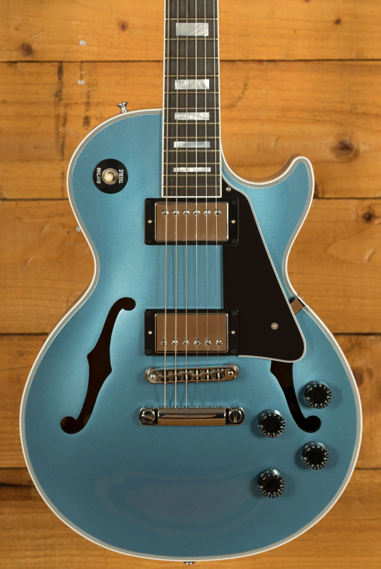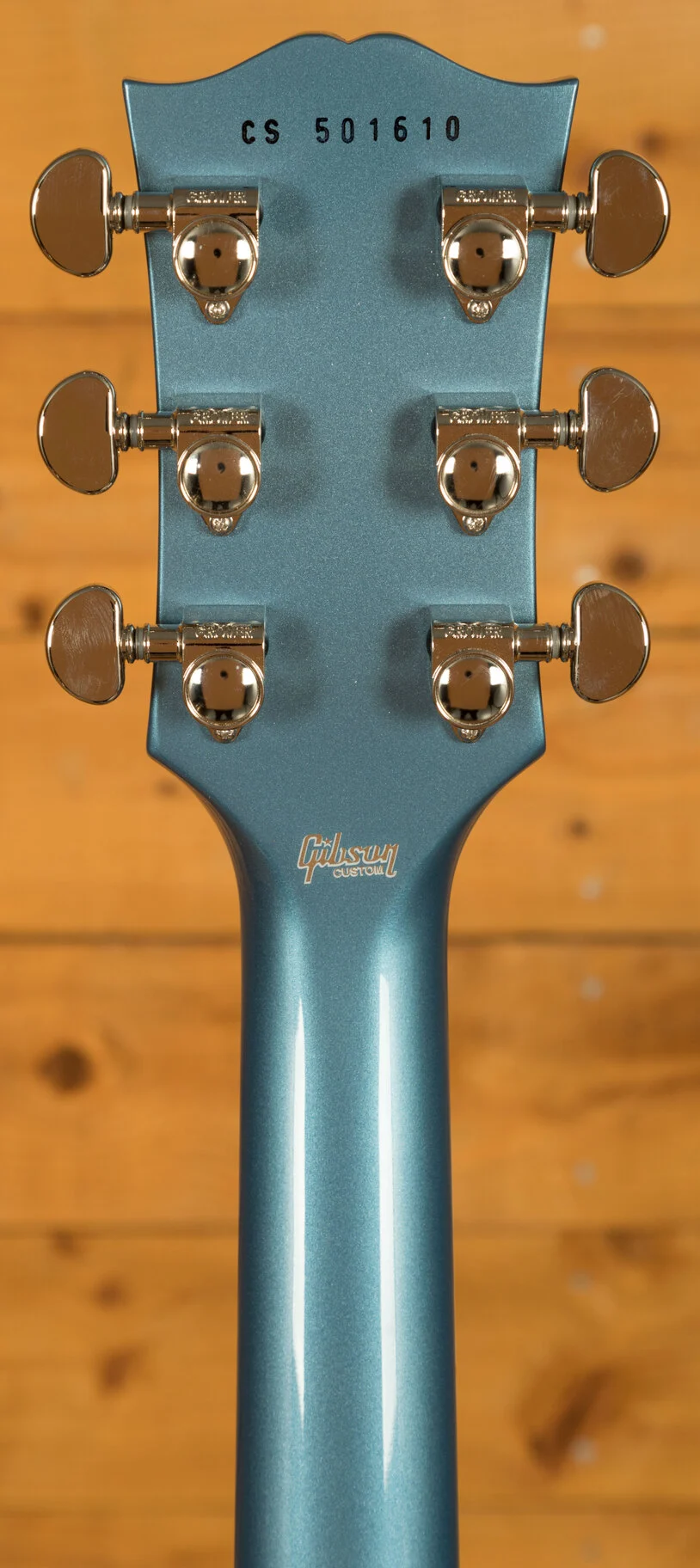 Fresh from our latest batch of custom spec Gibsons is this cool and unique twist on a modern collection Les Paul Custom. The Pelham Blue finish alone already gives this Les Paul Custom a colourful face lift with tonnes of character but under the hood is a chambered Mahogany body and a Maple top with F-Holes that give it an open sound akin to what you'd expect from an ES semi-hollow. This guitar is all about unique looks and unique sounds.
