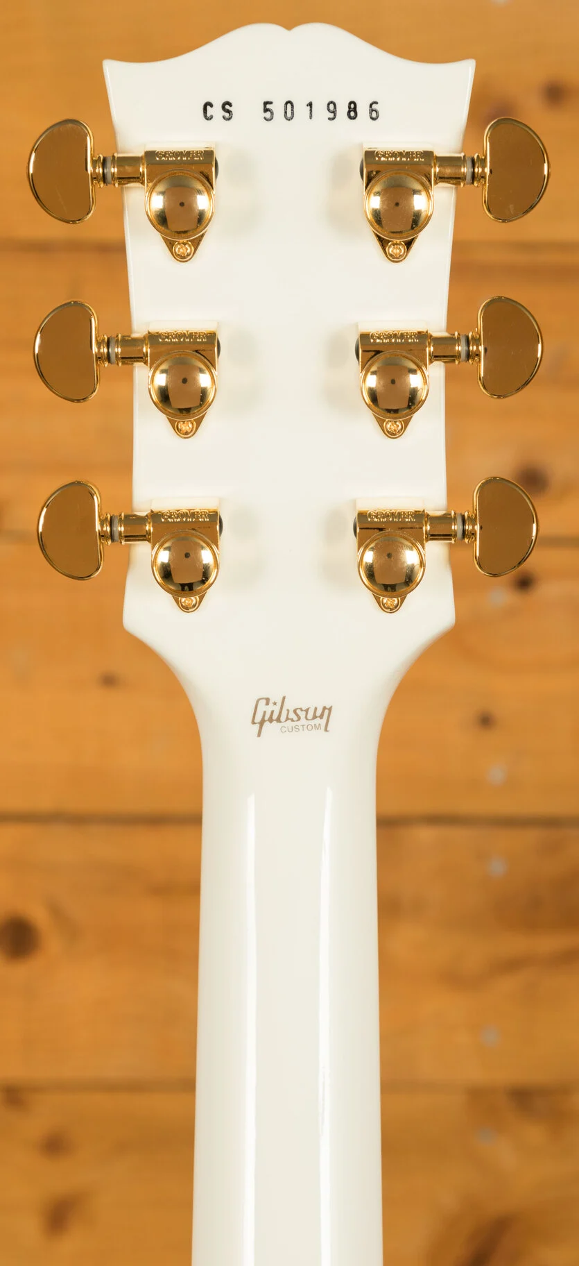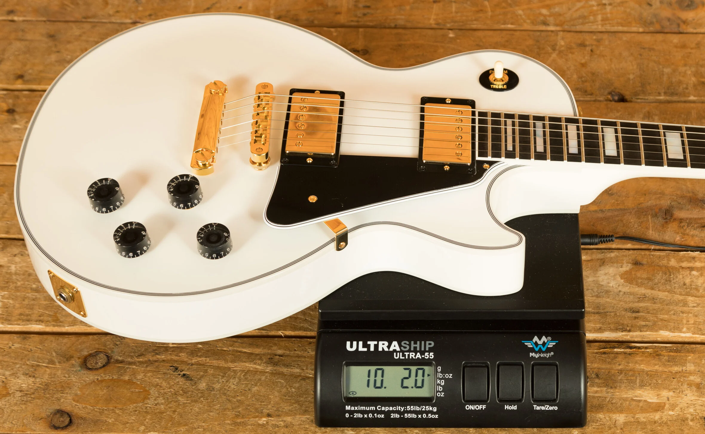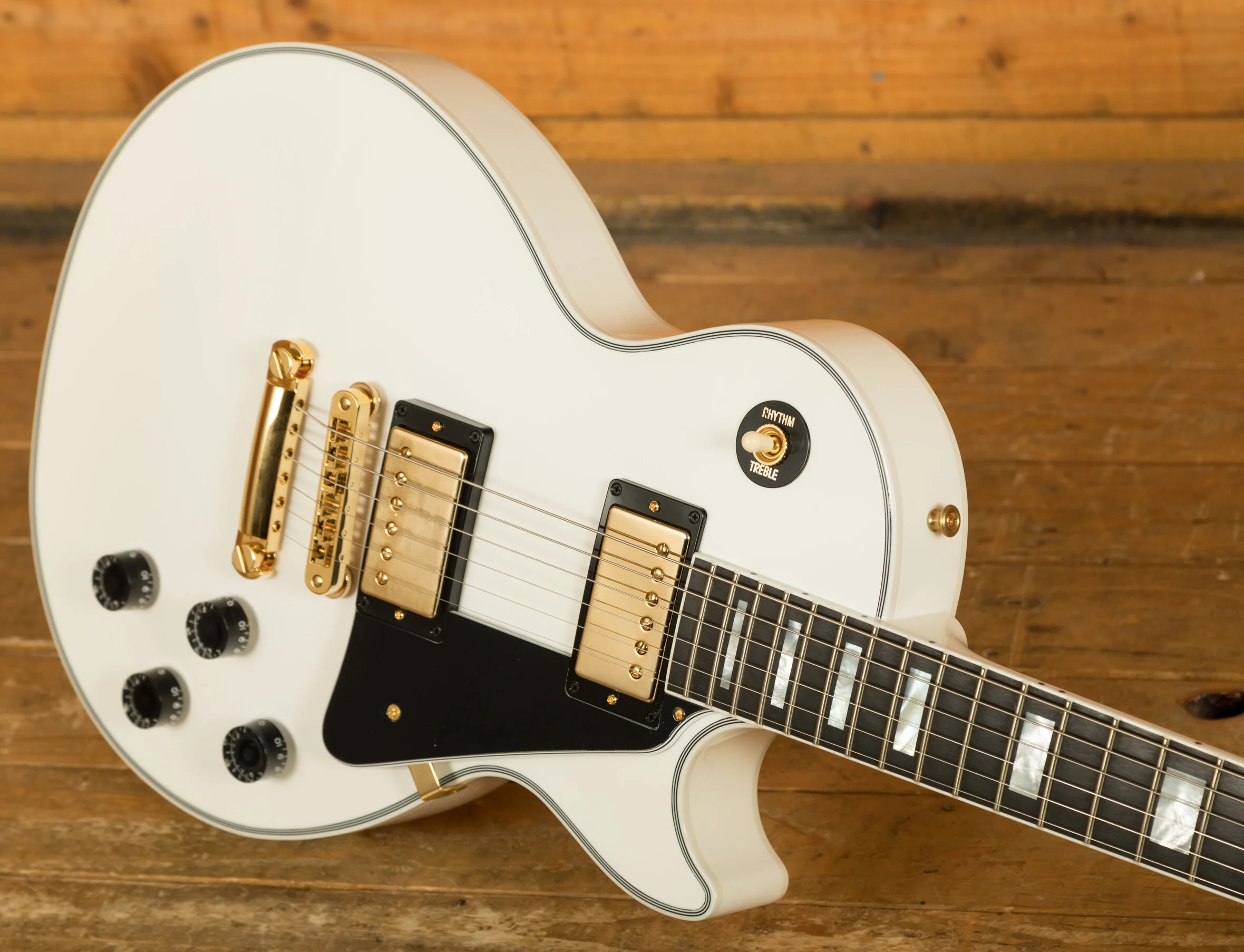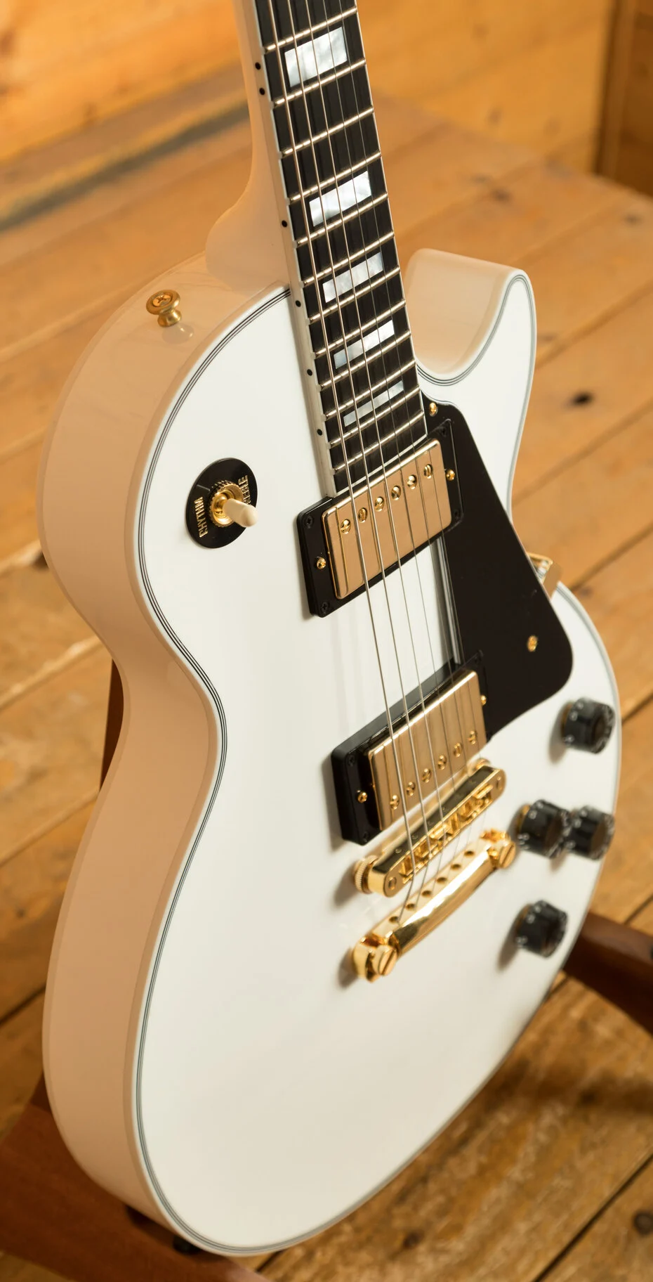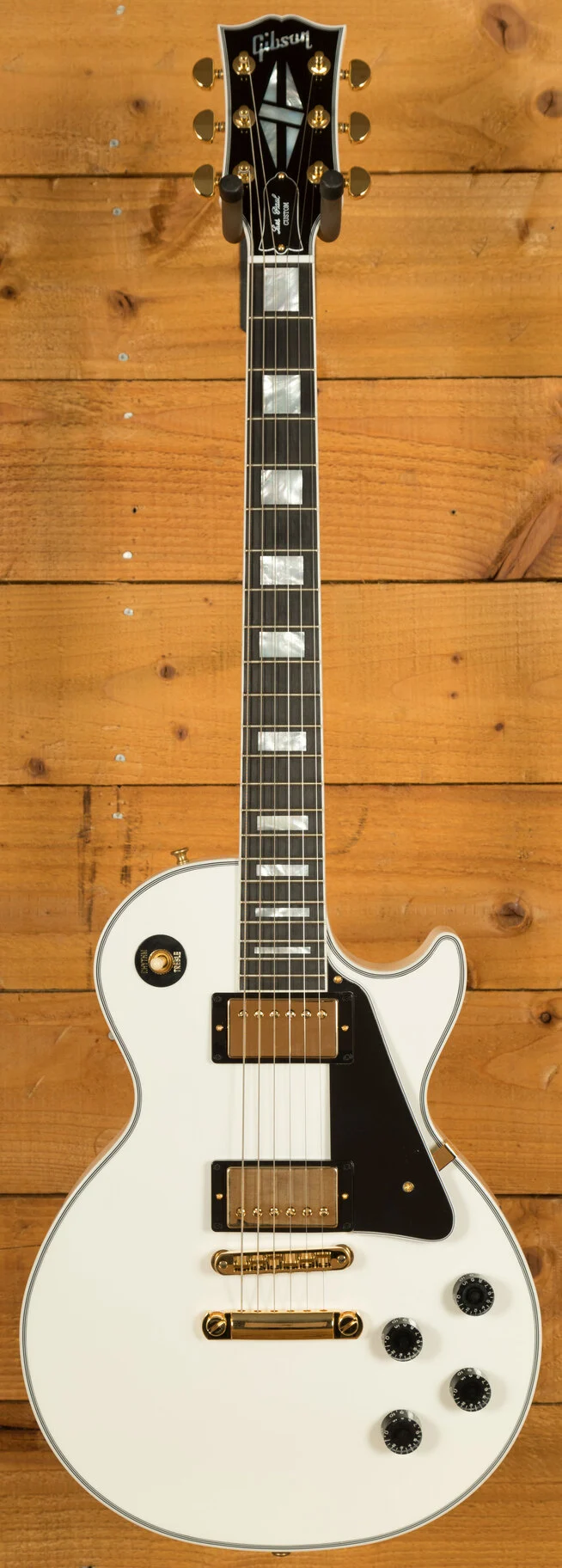 The Gibson Les Paul Custom is the ultimate way to experience what makes the Les Paul so special. With a solid Mahogany body and a carved Maple Top, the Custom is finished in stunning Alpine White with Gold hardware. I think it's fair to say it's a real eye catcher.