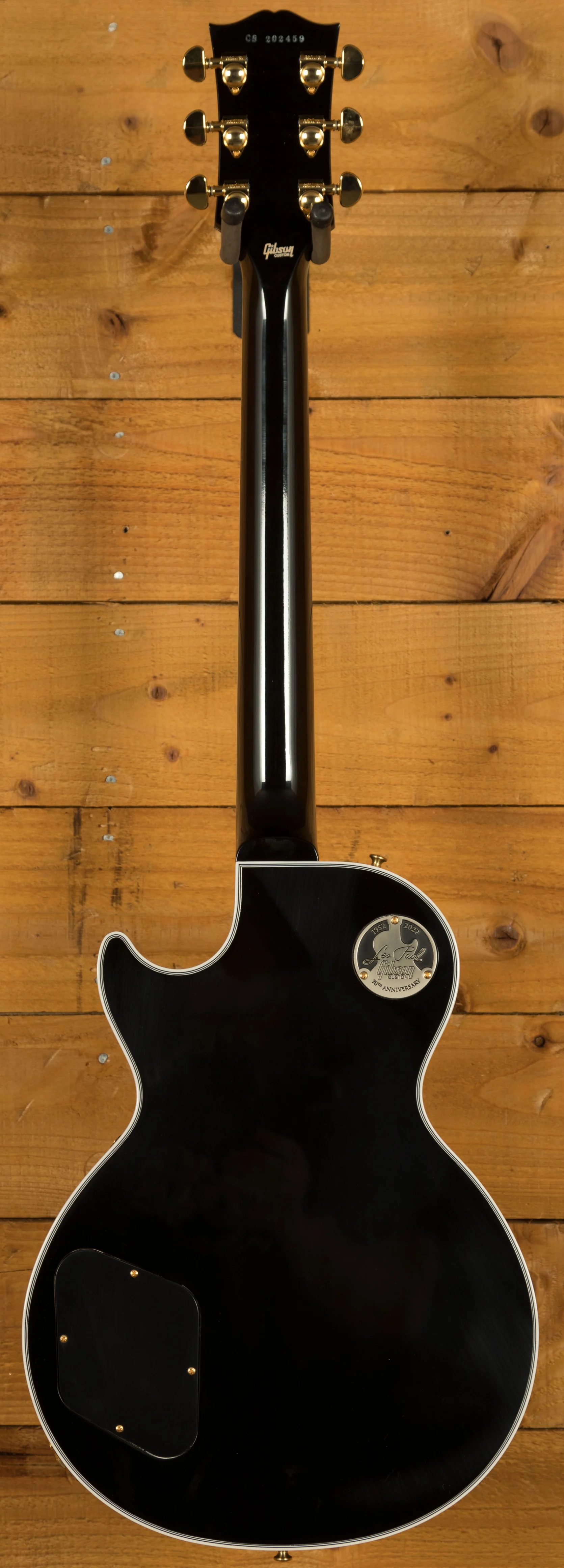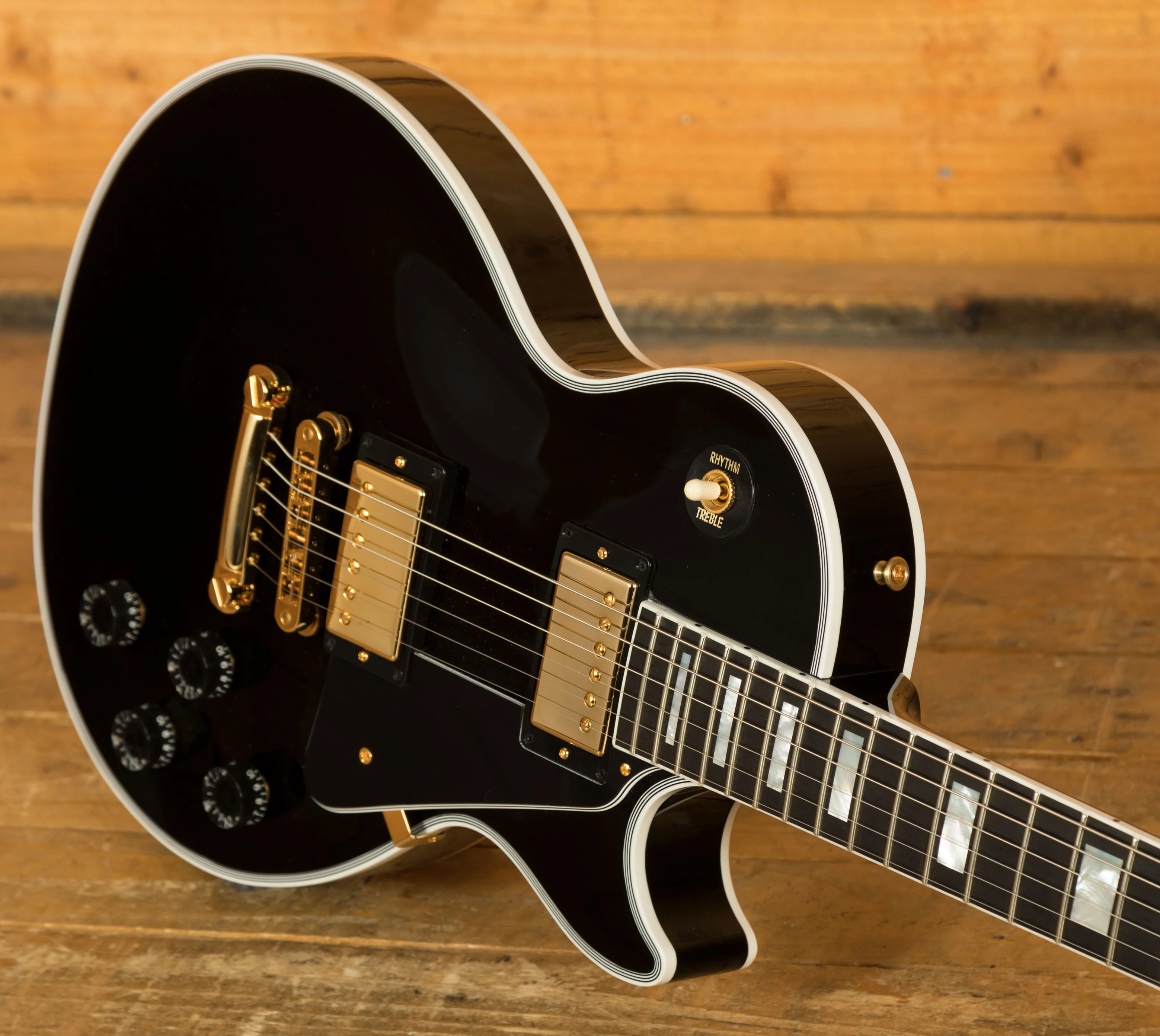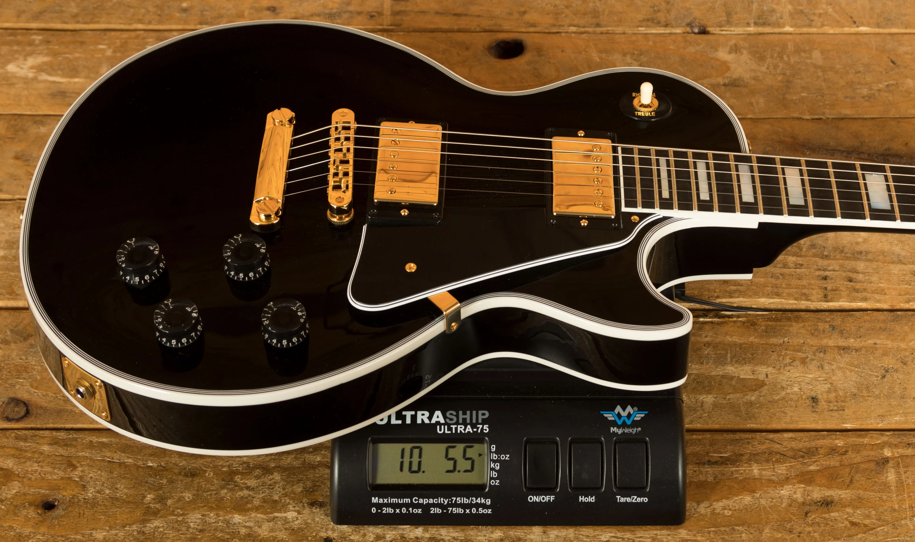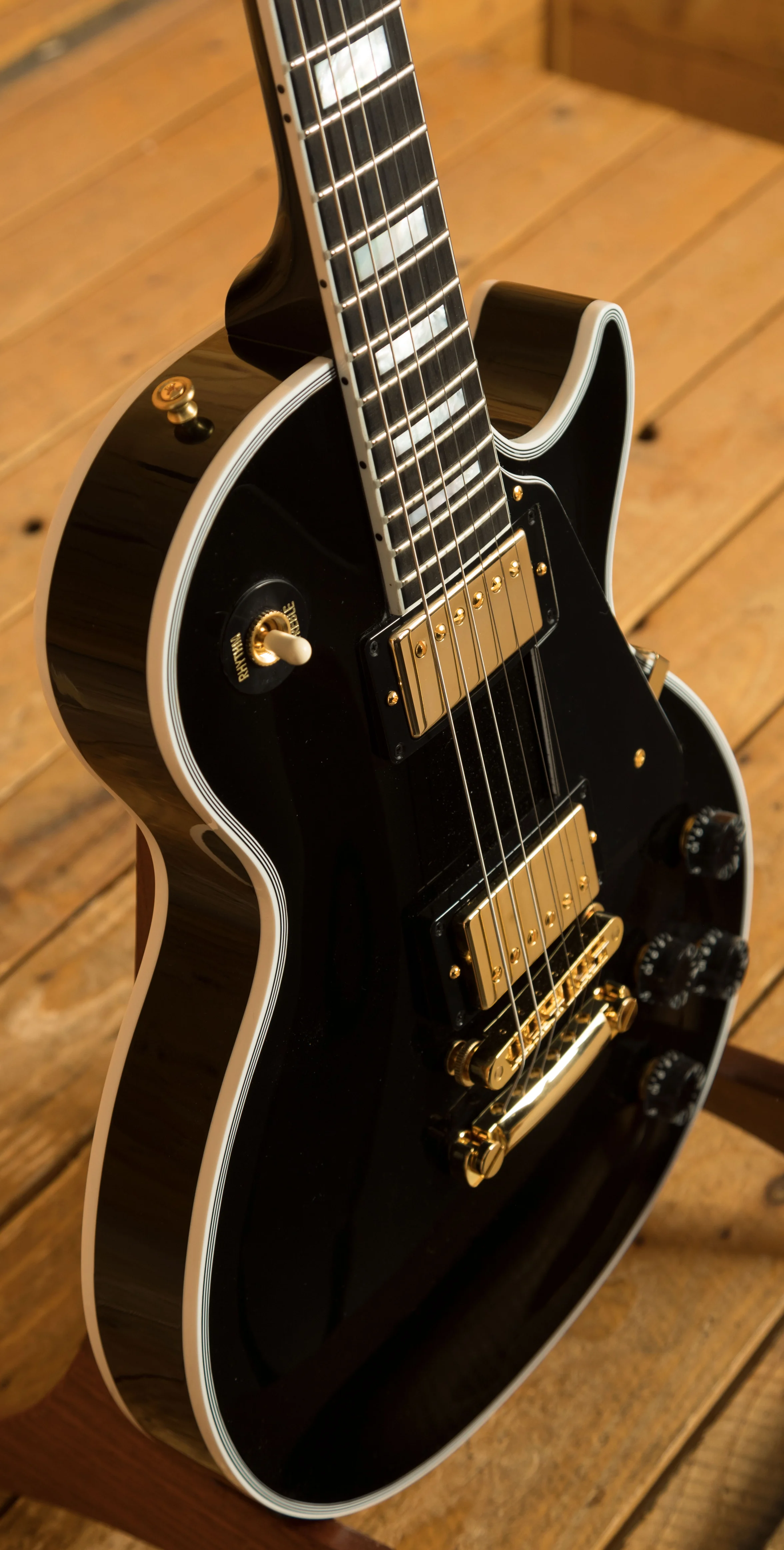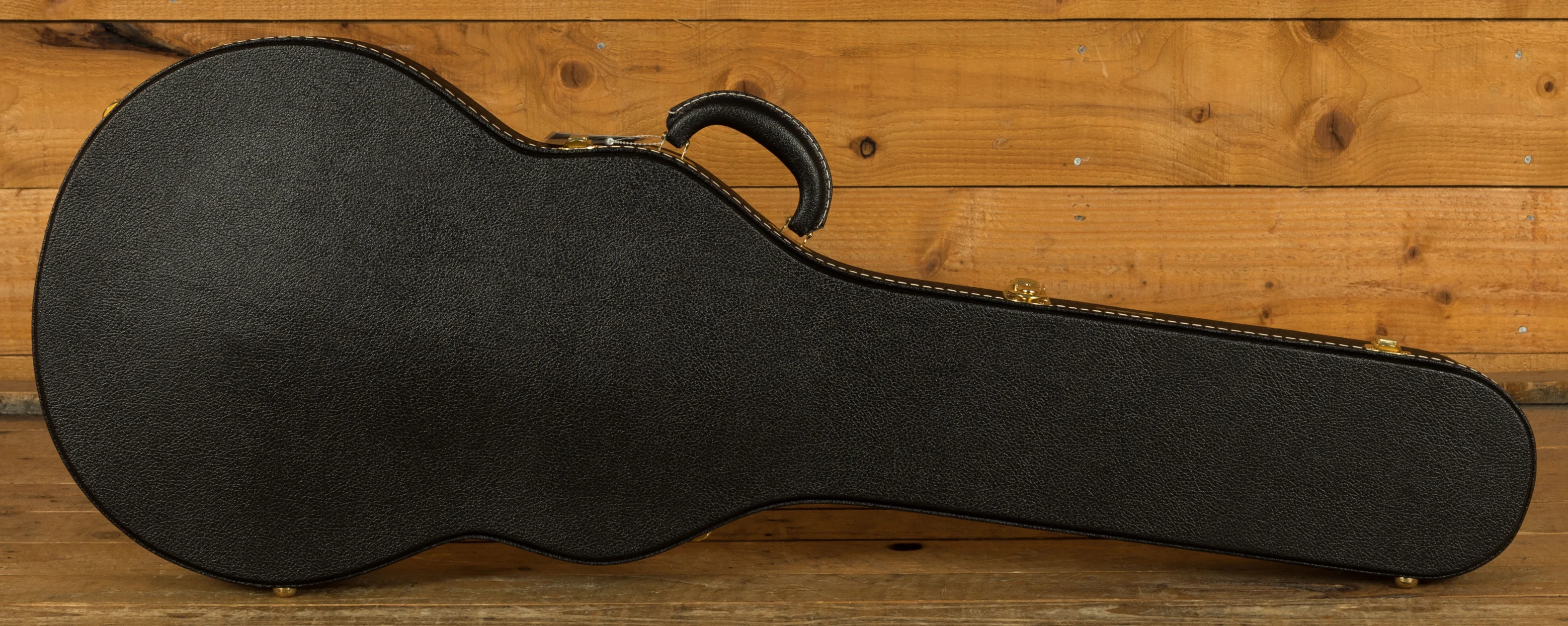 The Mahogany neck boasts a 24.75" scale length, an Ebony fingerboard with Pearloid block inlays; it feels perfectly balanced and poised, just as a Les Paul should. This is the long awaited return of the Ebony board, this is the ultimate powerhouse LP!