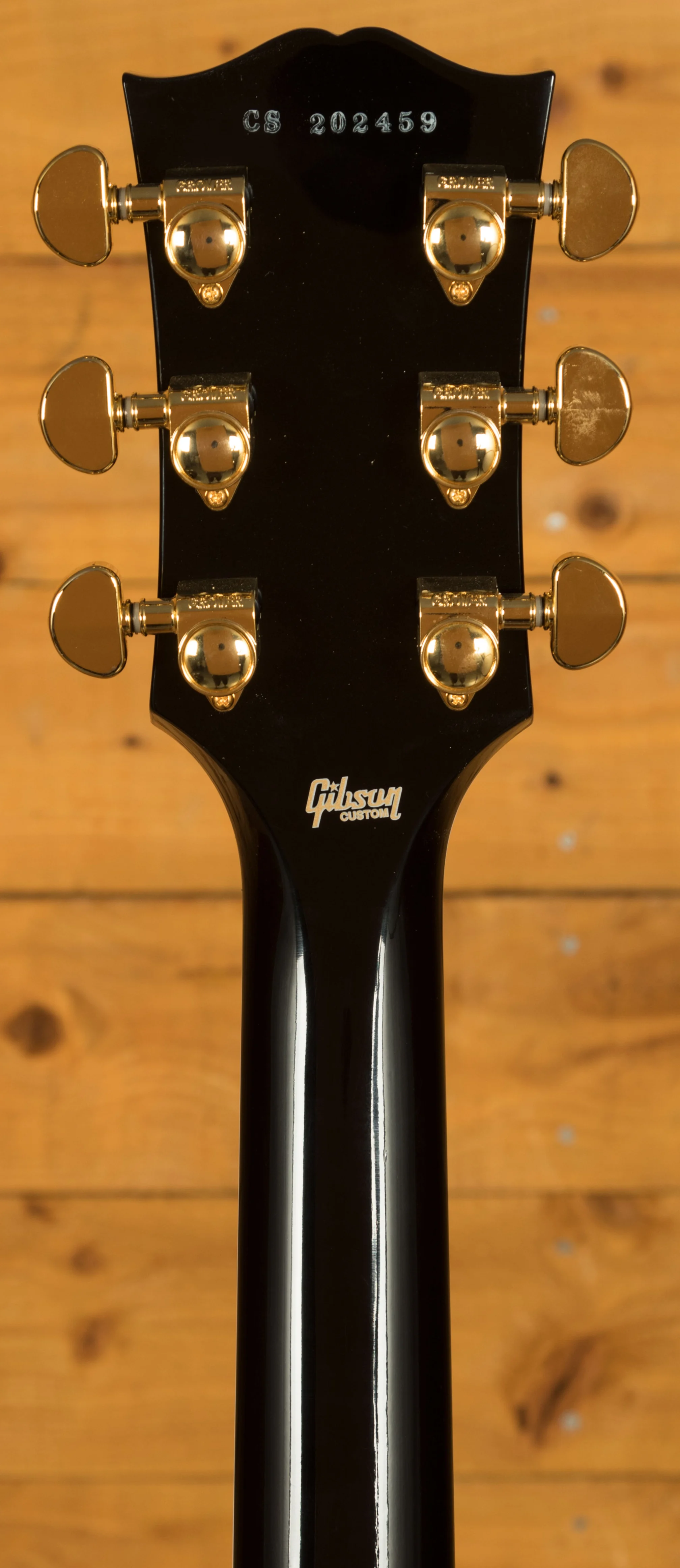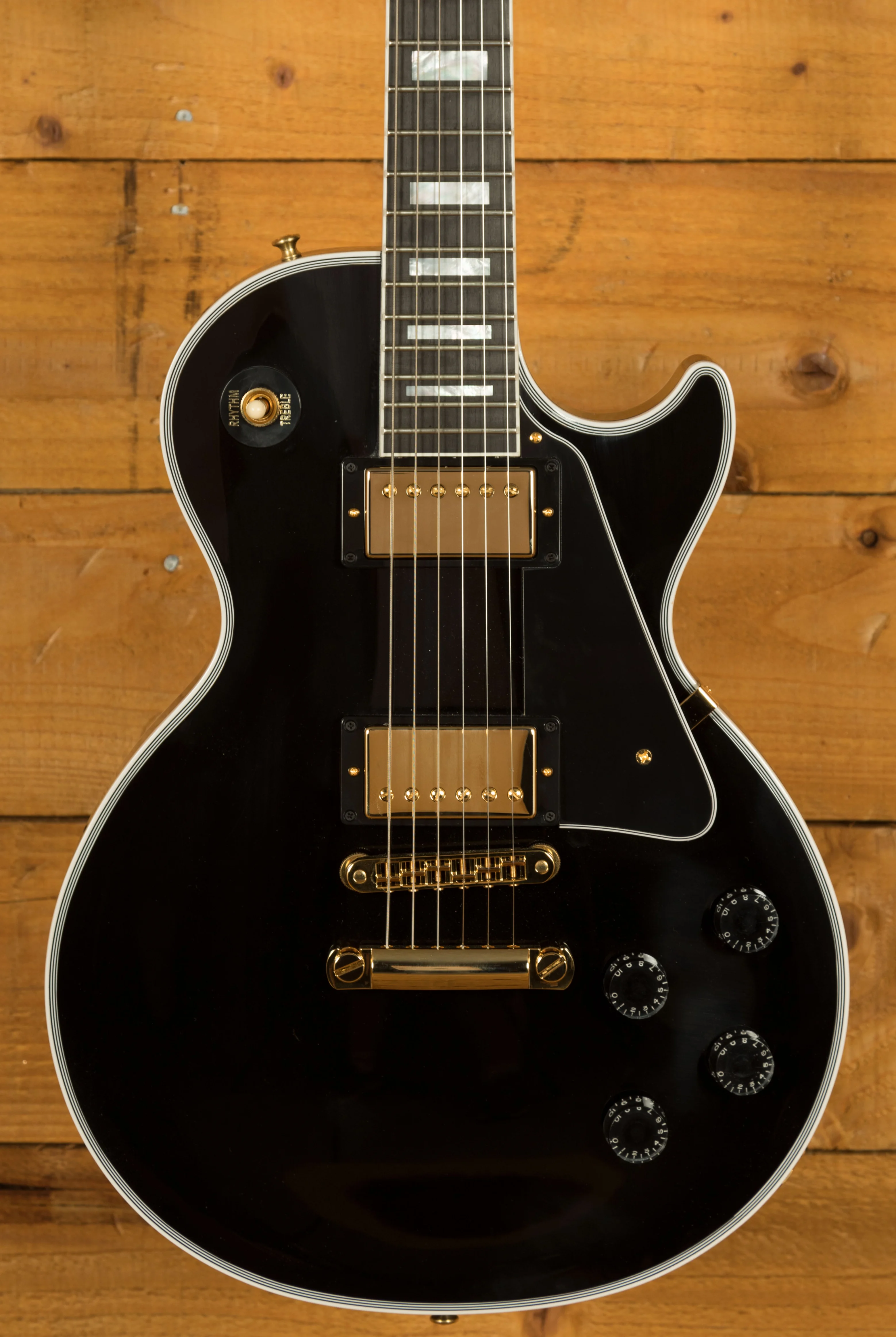 The Gibson Les Paul Custom is the ultimate way to experience what makes the Les Paul so special. With a solid Mahogany body and a carved Maple Top, the Custom is finished in stunning Ebony with Gold hardware. I think it's fair to say it's a real eye catcher.