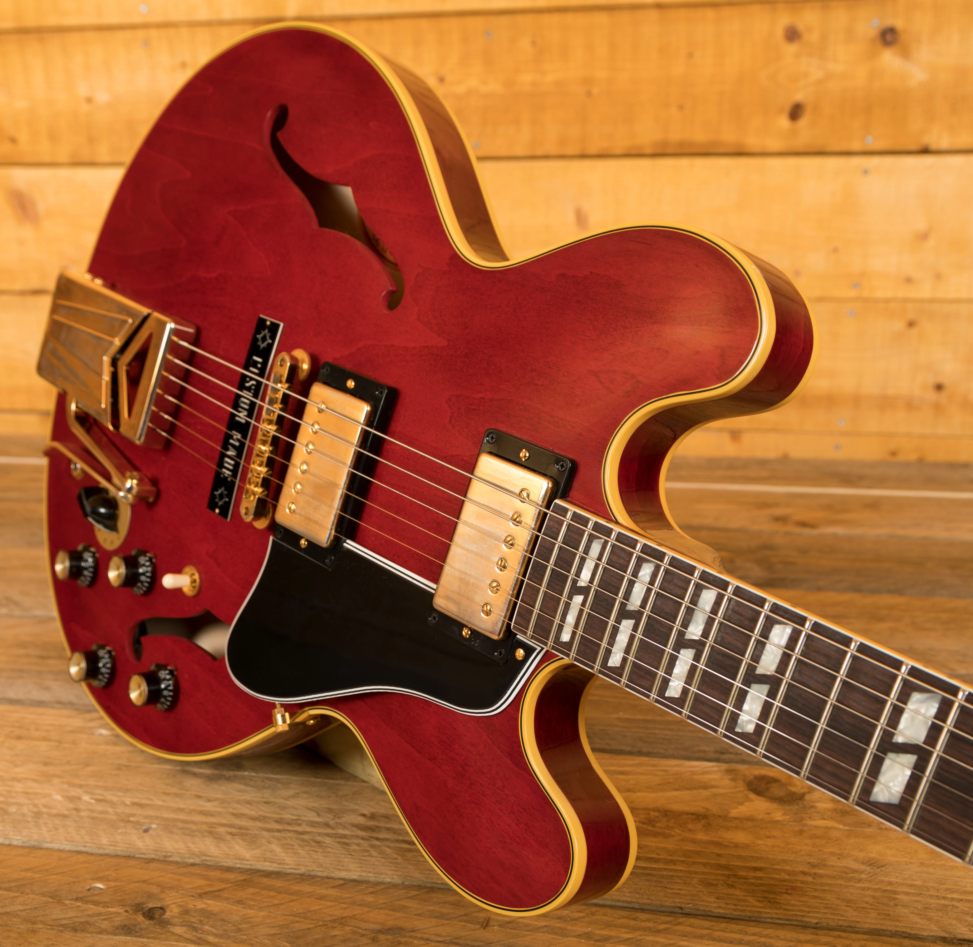 The Gibson Custom Shop Marcus King is a recreation of a super unique and rare vintage guitar, that is of course is the ES-345 with a rare sideways vibrola tailpiece. This is exactly how King's grandfather bought the guitar new, it's a super interesting and unique example of a vintage Gibson. The Gibson Custom Shop is committed to reflecting the historical accuracy and playing experience of Marcus King's original guitar including the tailpiece. As this tailpiece was designed for flat-topped SG models and not for archtops, it does have the potential to graze the finish if used, just like how it is on the original guitar.