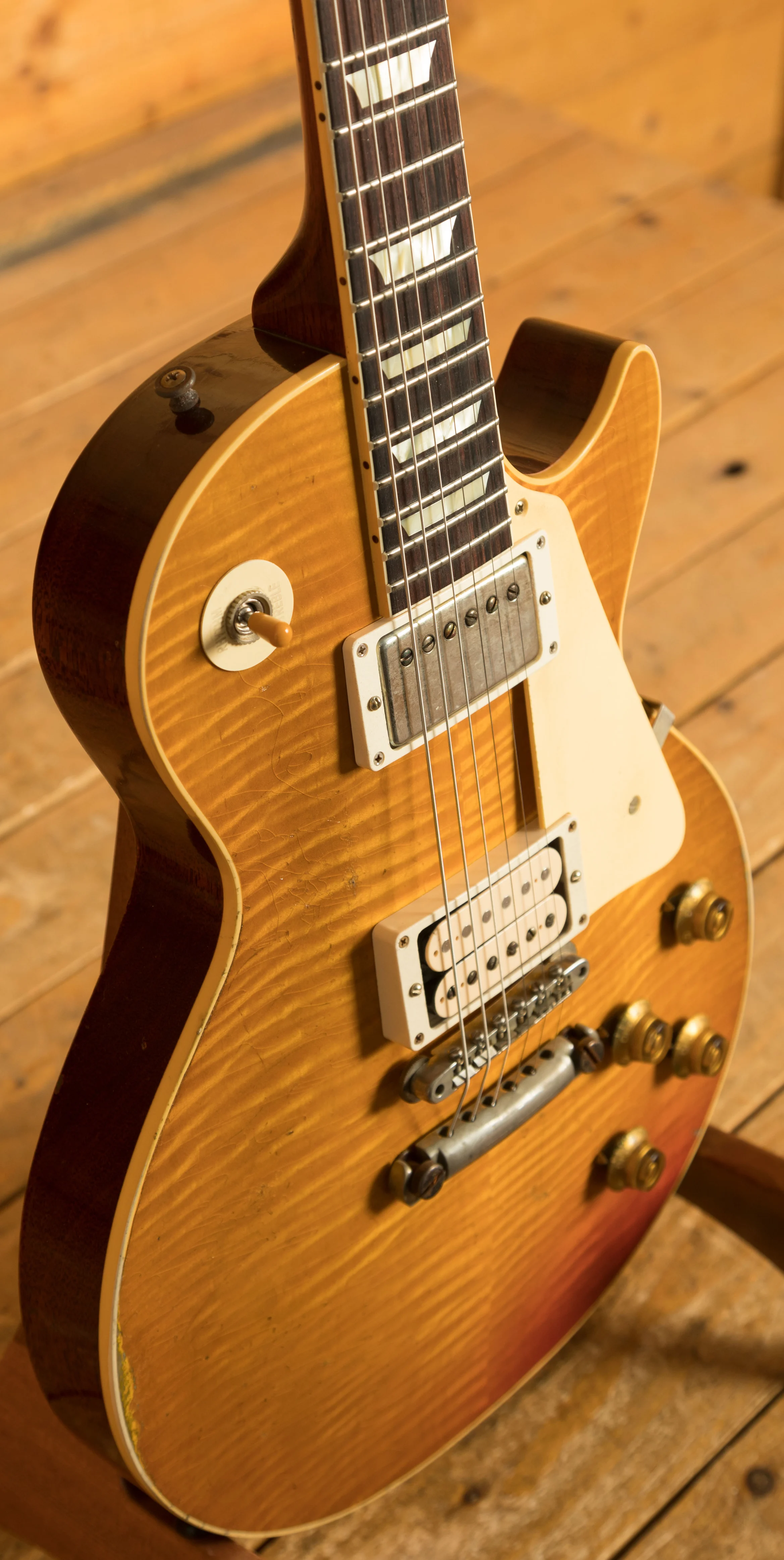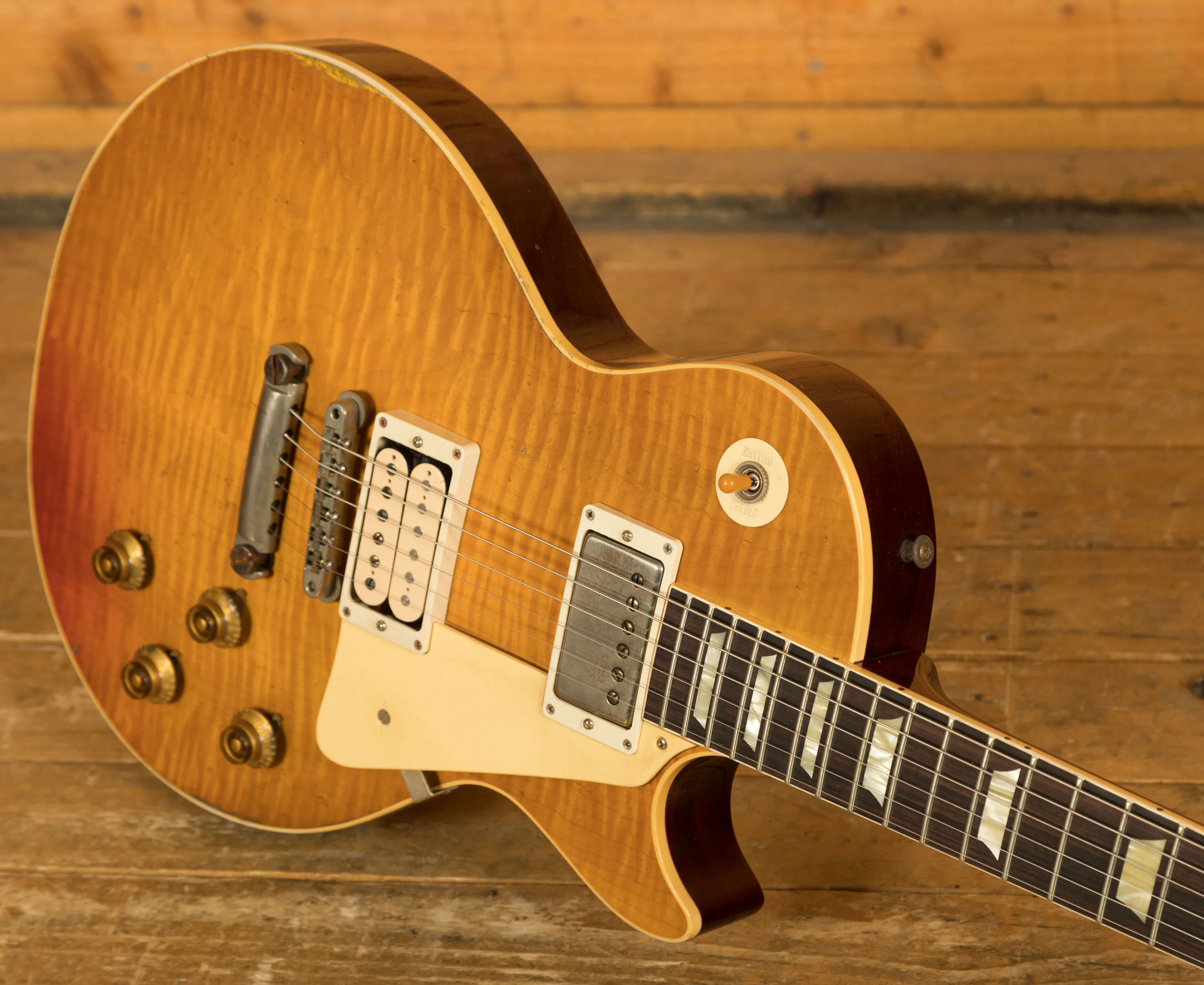 Discover the extraordinary craftsmanship of this Gibson Custom Murphy Lab 1959 Les Paul Standard, a meticulously crafted recreation of the iconic guitar owned by Gibsons Cesar Gueikian, affectionately dubbed "Gemini" and featured on page 116 of the revered "Beauty of the Burst" book. This Made 2 Measure model captures the essence of the original 1959 Les Paul Standard, with the Murphy Labs heavy ageing process artfully replicating decades of natural wear for an authentic vintage aesthetic. A fascinating piece of history, this guitars original counterpart is just one serial number away from the infamous Greeny Les Paul, previously owned by Peter Green and Gary Moore, and now in the hands of Metallicas Kirk Hammett, adding to its allure for collectors and enthusiasts.
