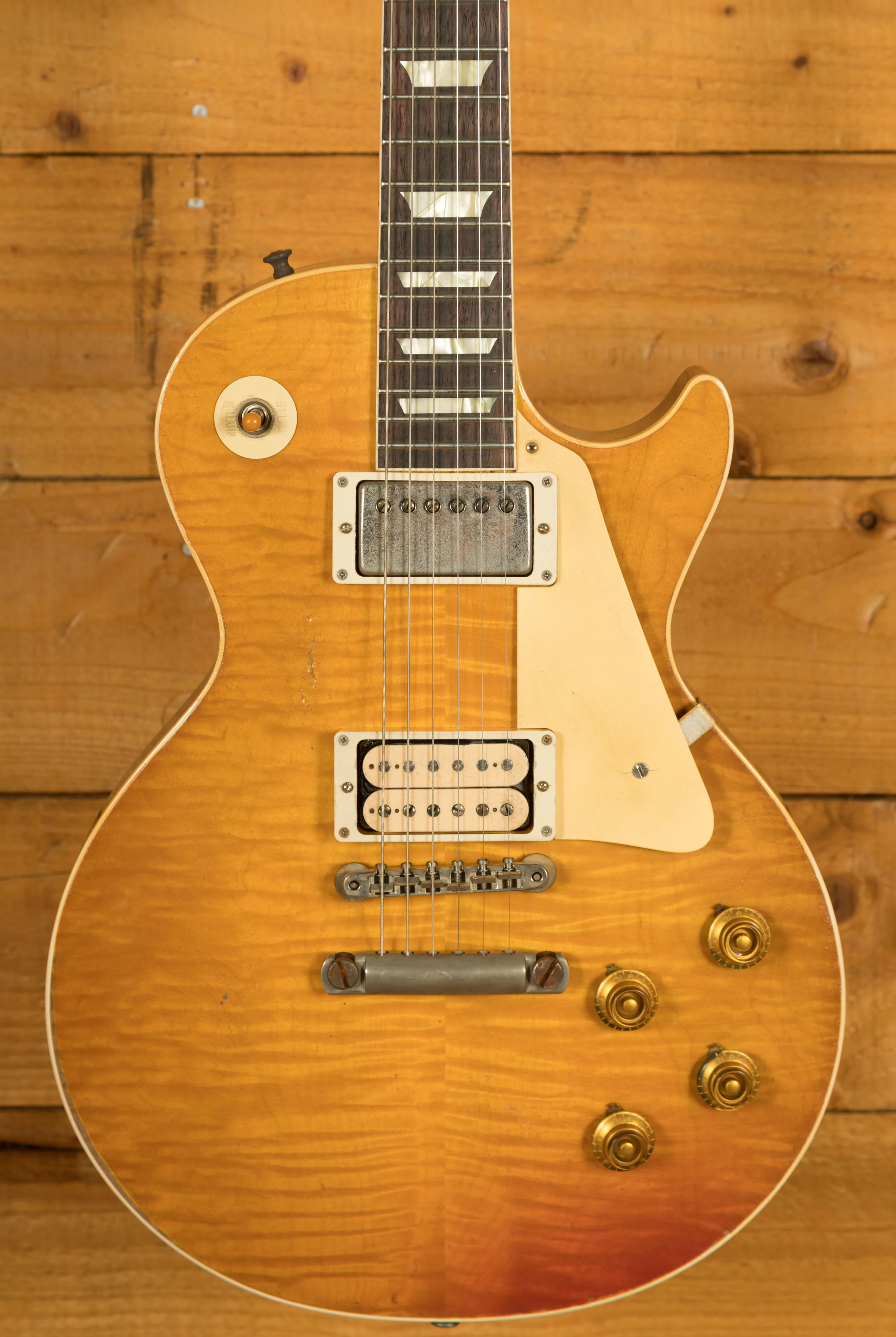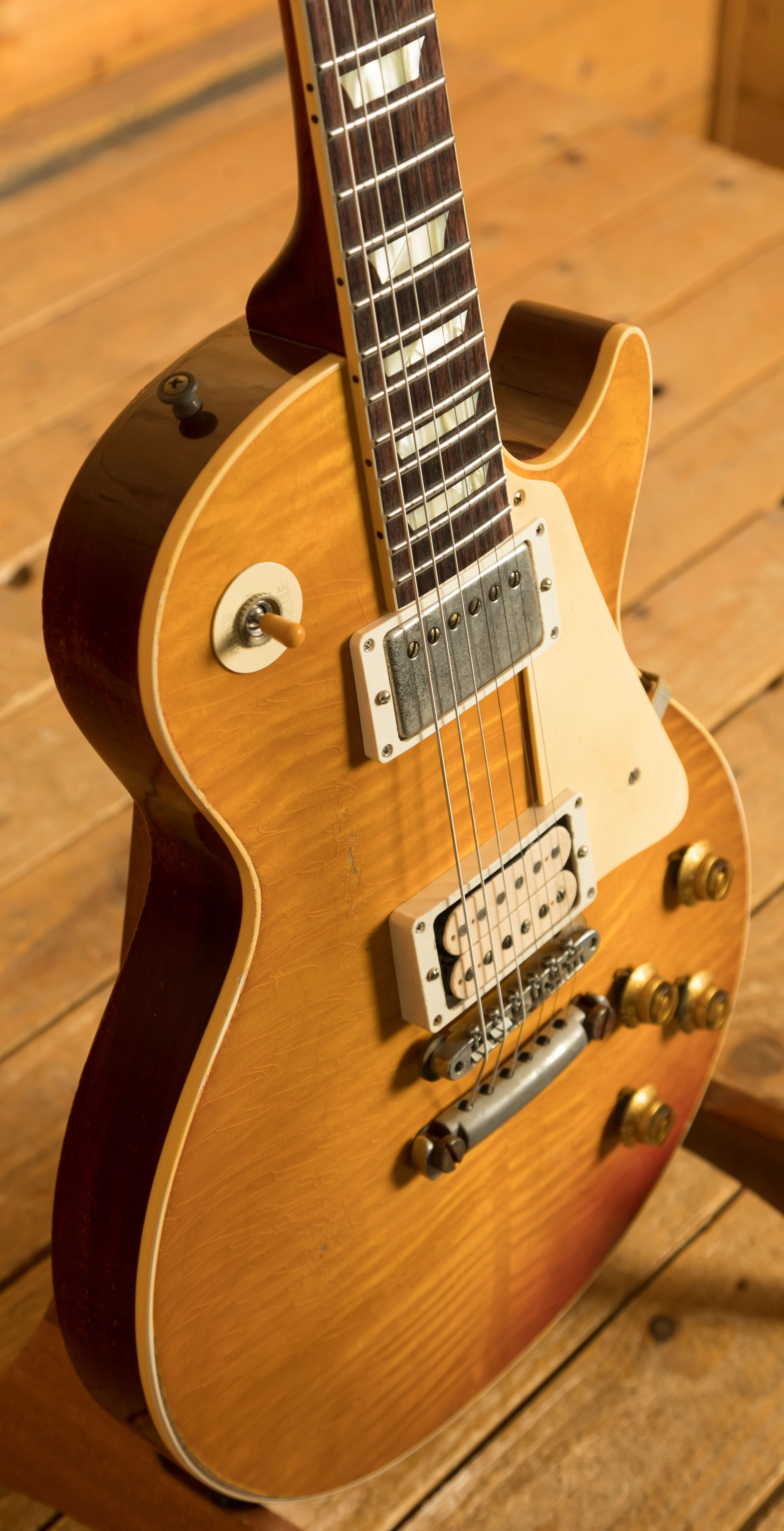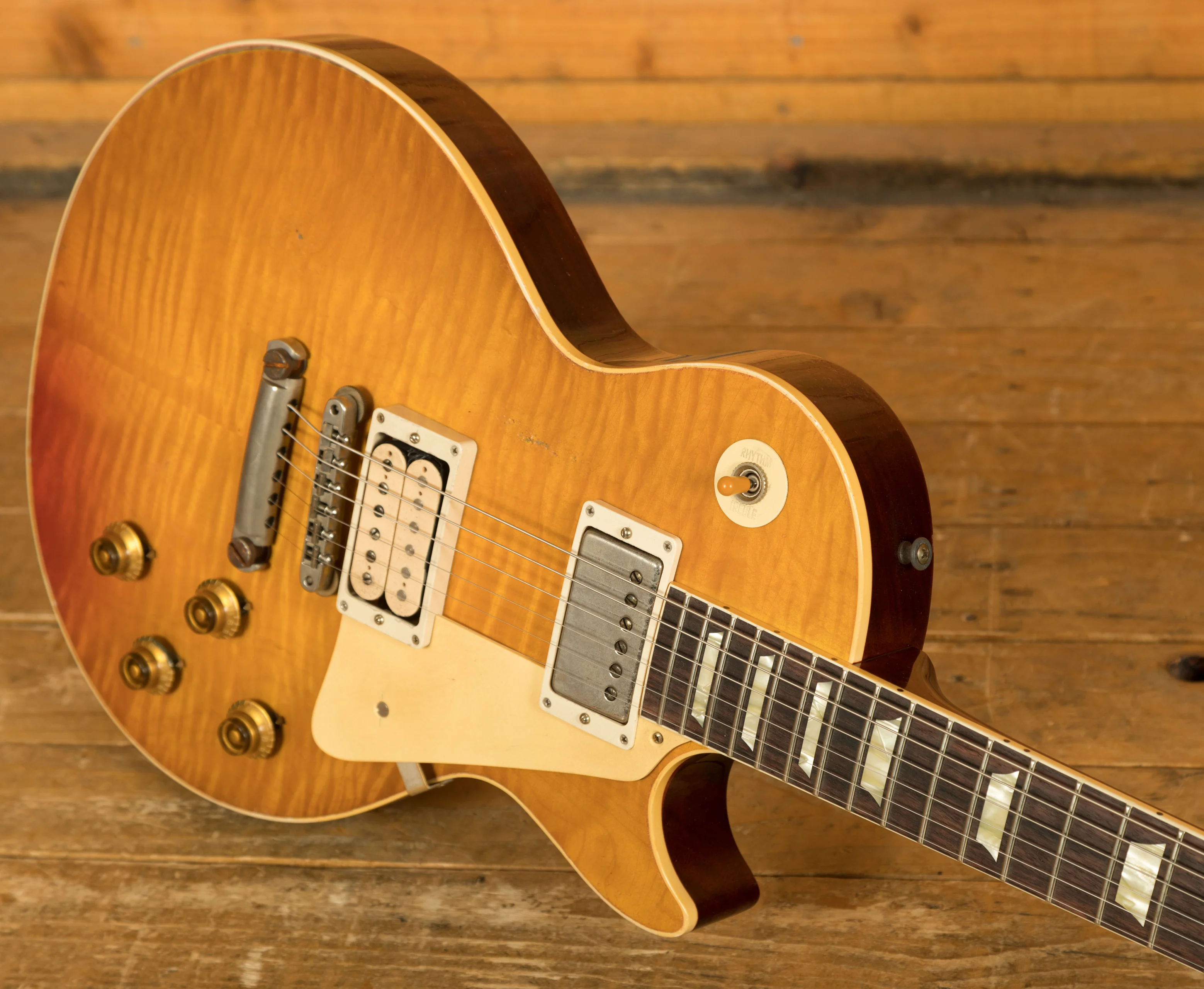 Discover the extraordinary craftsmanship of this Gibson Custom Murphy Lab 1959 Les Paul Standard, a meticulously crafted recreation of the iconic guitar owned by Gibsons Cesar Gueikian, affectionately dubbed "Gemini" and featured on page 116 of the revered "Beauty of the Burst" book. This Made 2 Measure model captures the essence of the original 1959 Les Paul Standard, with the Murphy Labs heavy ageing process artfully replicating decades of natural wear for an authentic vintage aesthetic. A fascinating piece of history, this guitars original counterpart is just one serial number away from the infamous Greeny Les Paul, previously owned by Peter Green and Gary Moore, and now in the hands of Metallicas Kirk Hammett, adding to its allure for collectors and enthusiasts.