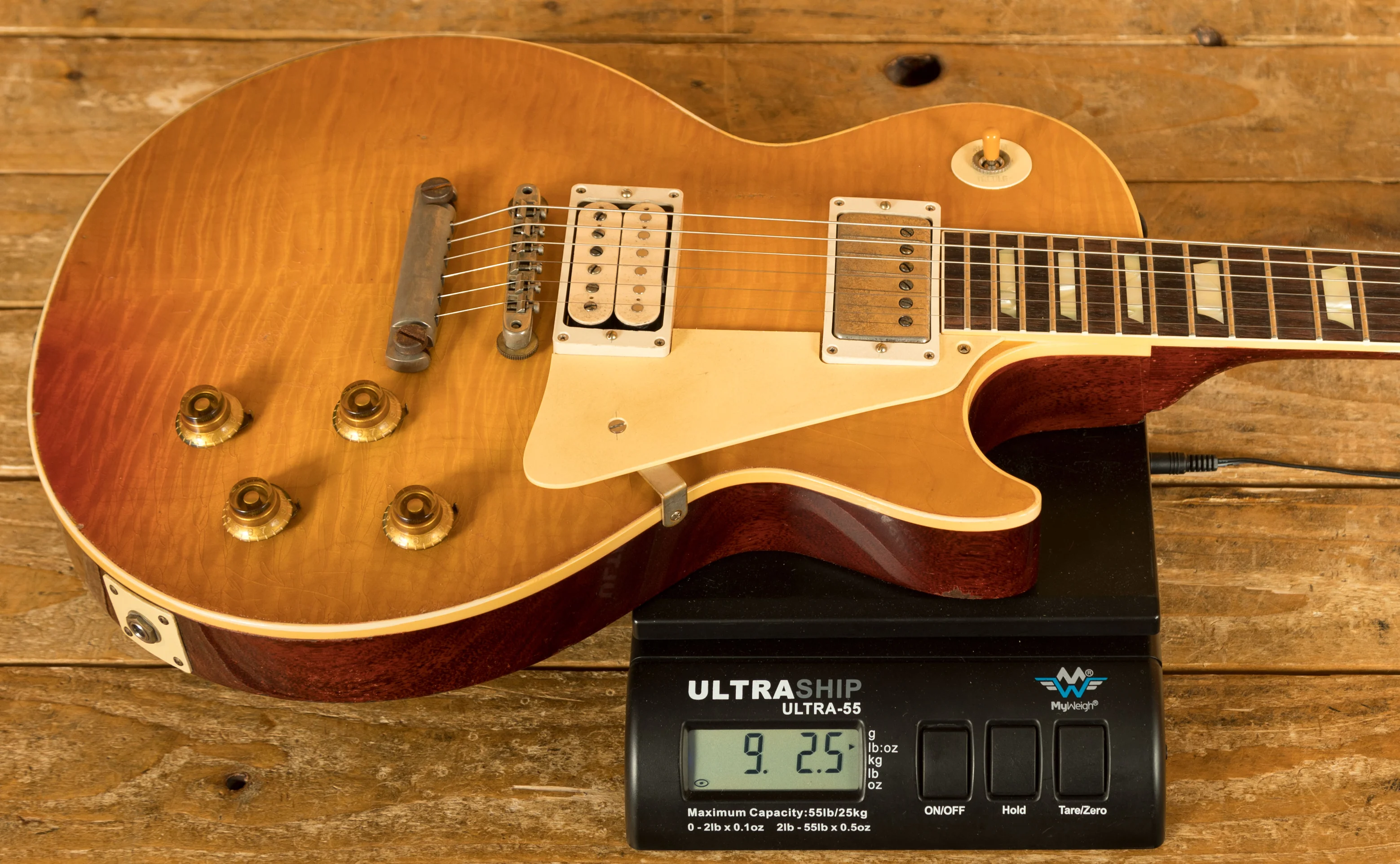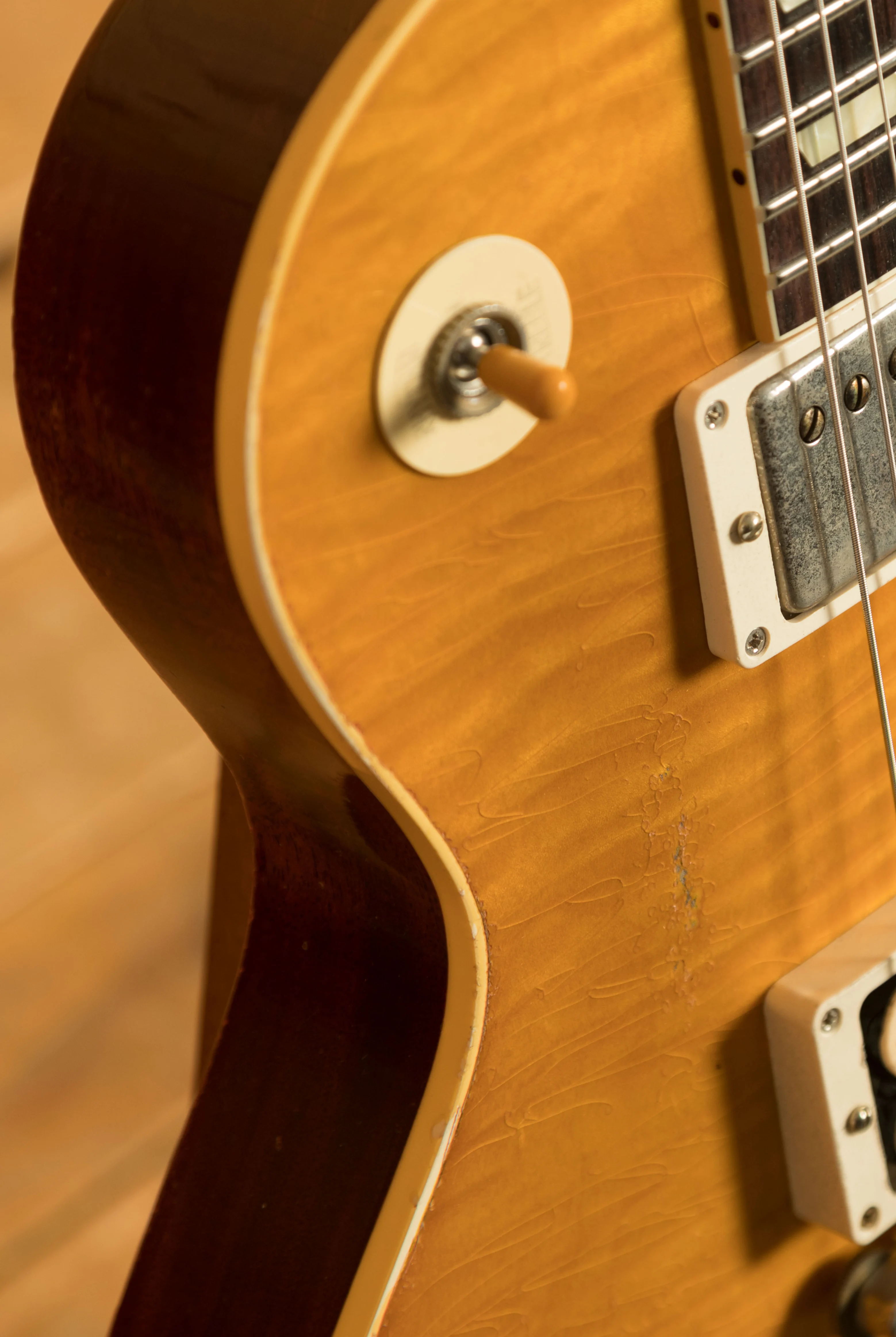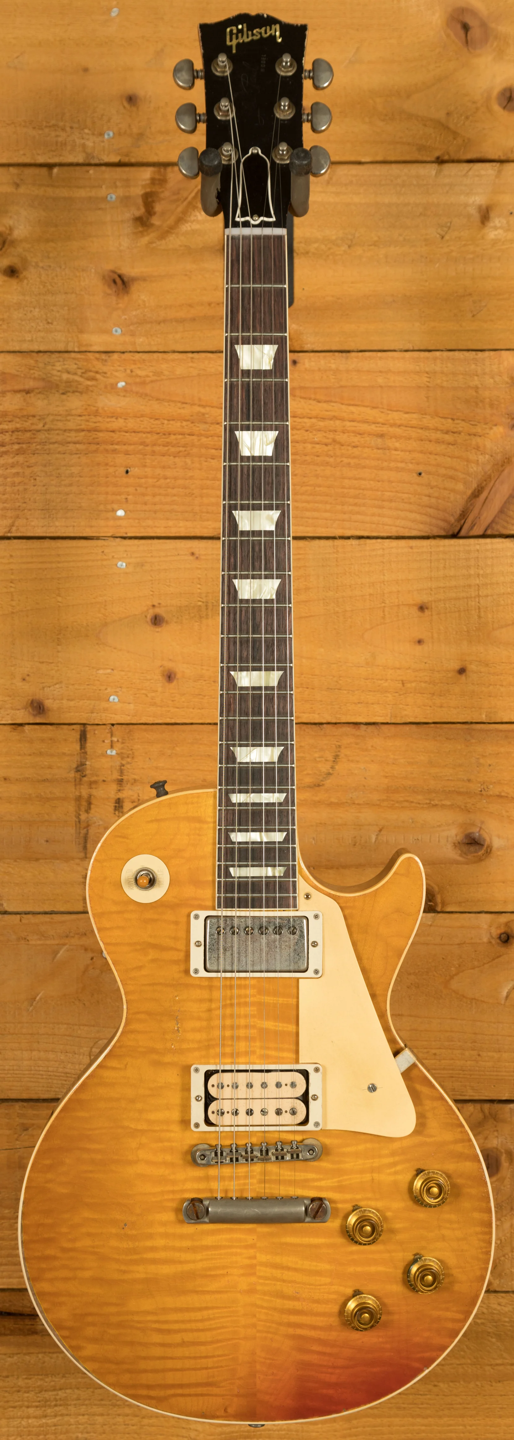 Discover the extraordinary craftsmanship of this Gibson Custom Murphy Lab 1959 Les Paul Standard, a meticulously crafted recreation of the iconic guitar owned by Gibsons Cesar Gueikian, affectionately dubbed "Gemini" and featured on page 116 of the revered "Beauty of the Burst" book. This Made 2 Measure model captures the essence of the original 1959 Les Paul Standard, with the Murphy Labs heavy ageing process artfully replicating decades of natural wear for an authentic vintage aesthetic. A fascinating piece of history, this guitars original counterpart is just one serial number away from the infamous Greeny Les Paul, previously owned by Peter Green and Gary Moore, and now in the hands of Metallicas Kirk Hammett, adding to its allure for collectors and enthusiasts.