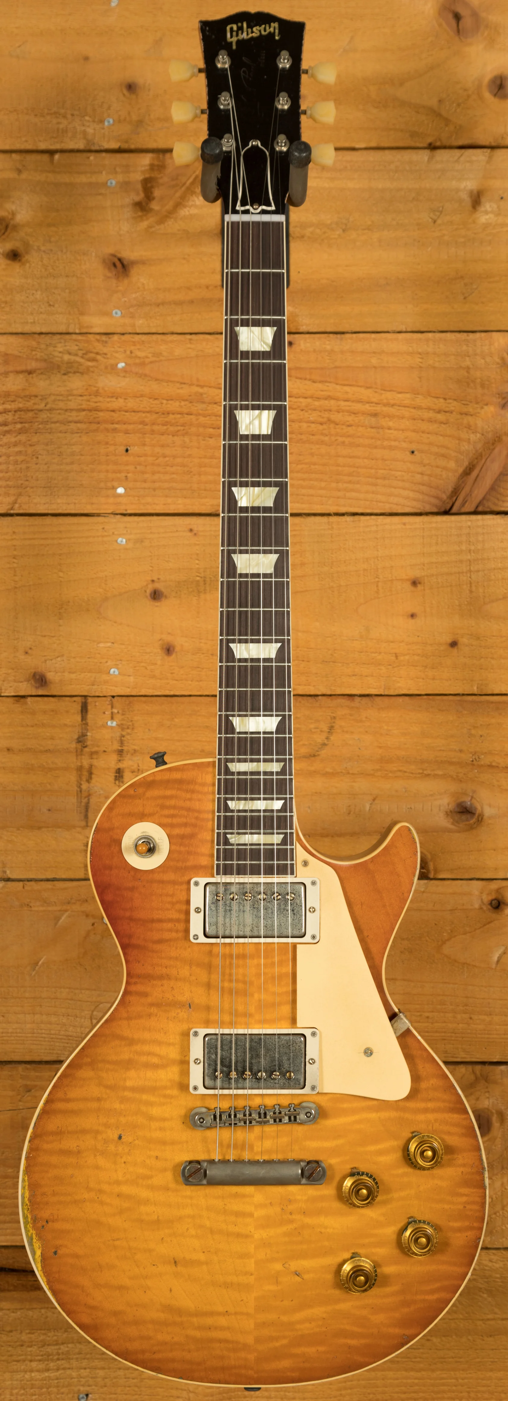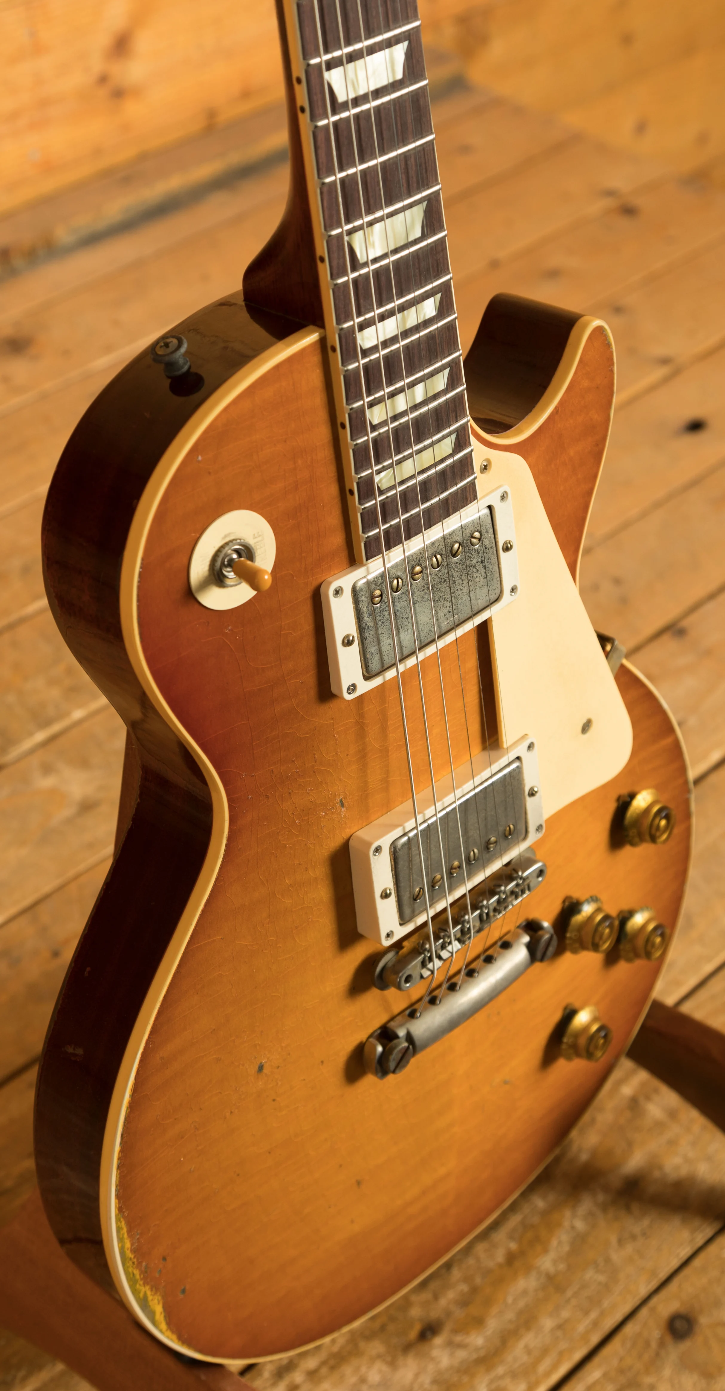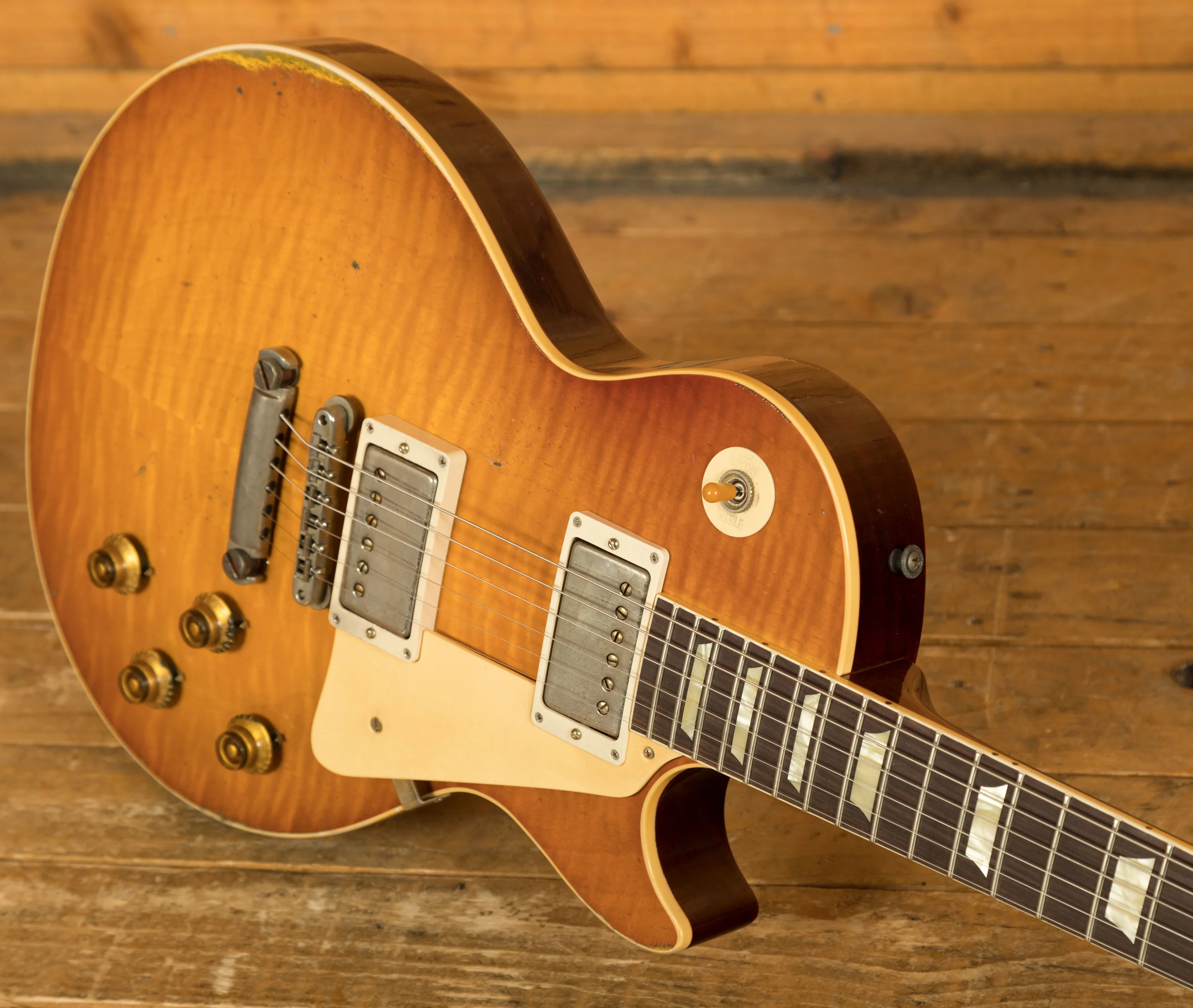 This 1959 Les Paul Standard features a solid mahogany body with a long-tenon neck joint using hide glue, ensuring optimal resonance and sustain. The mahogany neck, with an authentic 1959 profile, is paired with an Indian rosewood fingerboard featuring aged cellulose nitrate trapezoid inlays, a 12" radius, and 22 medium jumbo frets (Jescar nickel-silver) for smooth, vintage-inspired playability. Equipped with a pair of Custombucker Alnico 3 pickups (unpotted, with cream mounting rings), this guitar delivers the dynamic, harmonically rich PAF tone that defined the era - warm, articulate cleans and powerful overdrive - perfect for blues, rock, and beyond. Vintage-style hardware, including an ABR-1 bridge, lightweight stopbar tailpiece, and Kluson Deluxe reissue tuners, all in aged nickel, ensures historical accuracy. This guitar has been professionally set up by our skilled luthiers to ensure it performs flawlessly right out of the box, complete with its Gibson Custom Shop hardshell case and certificate of authenticity.