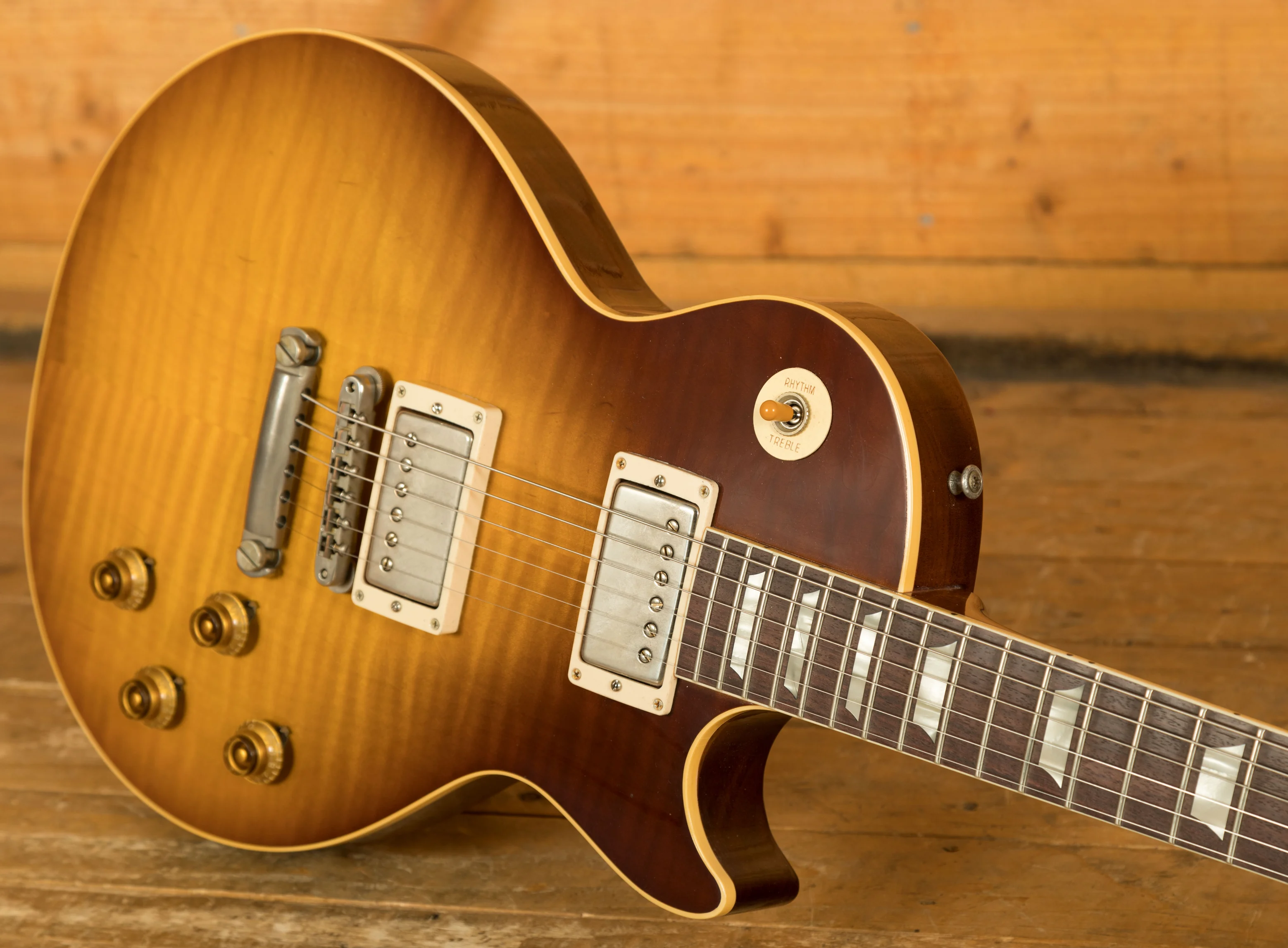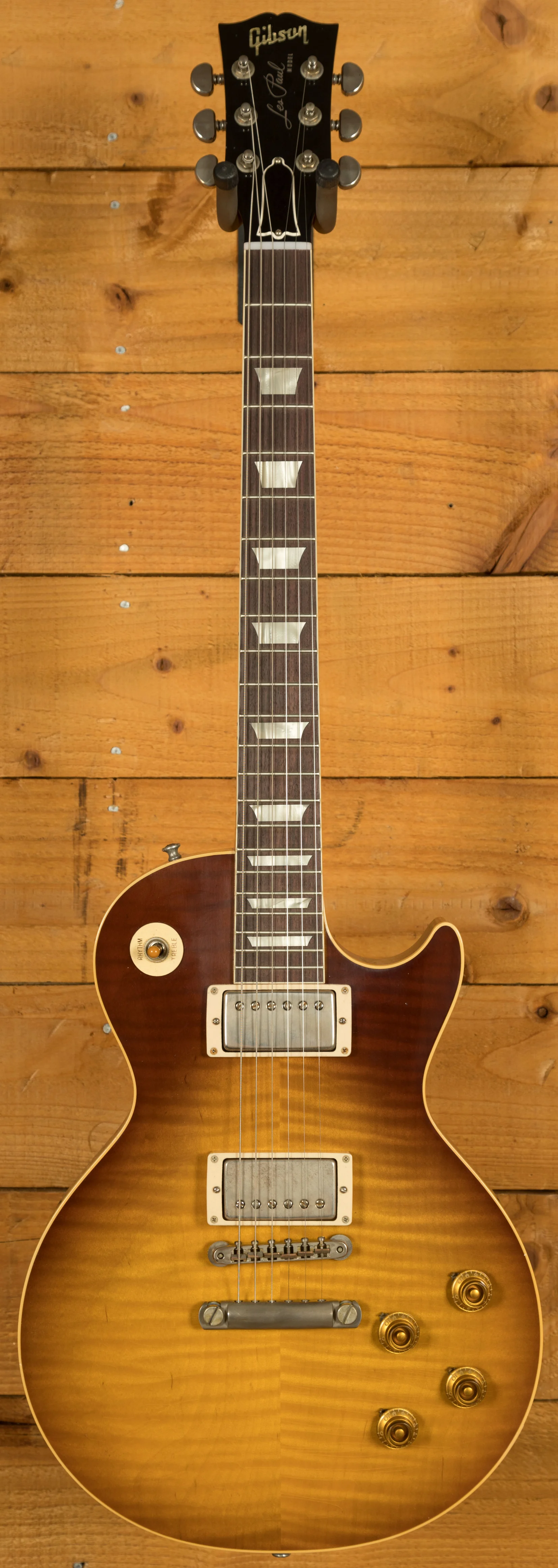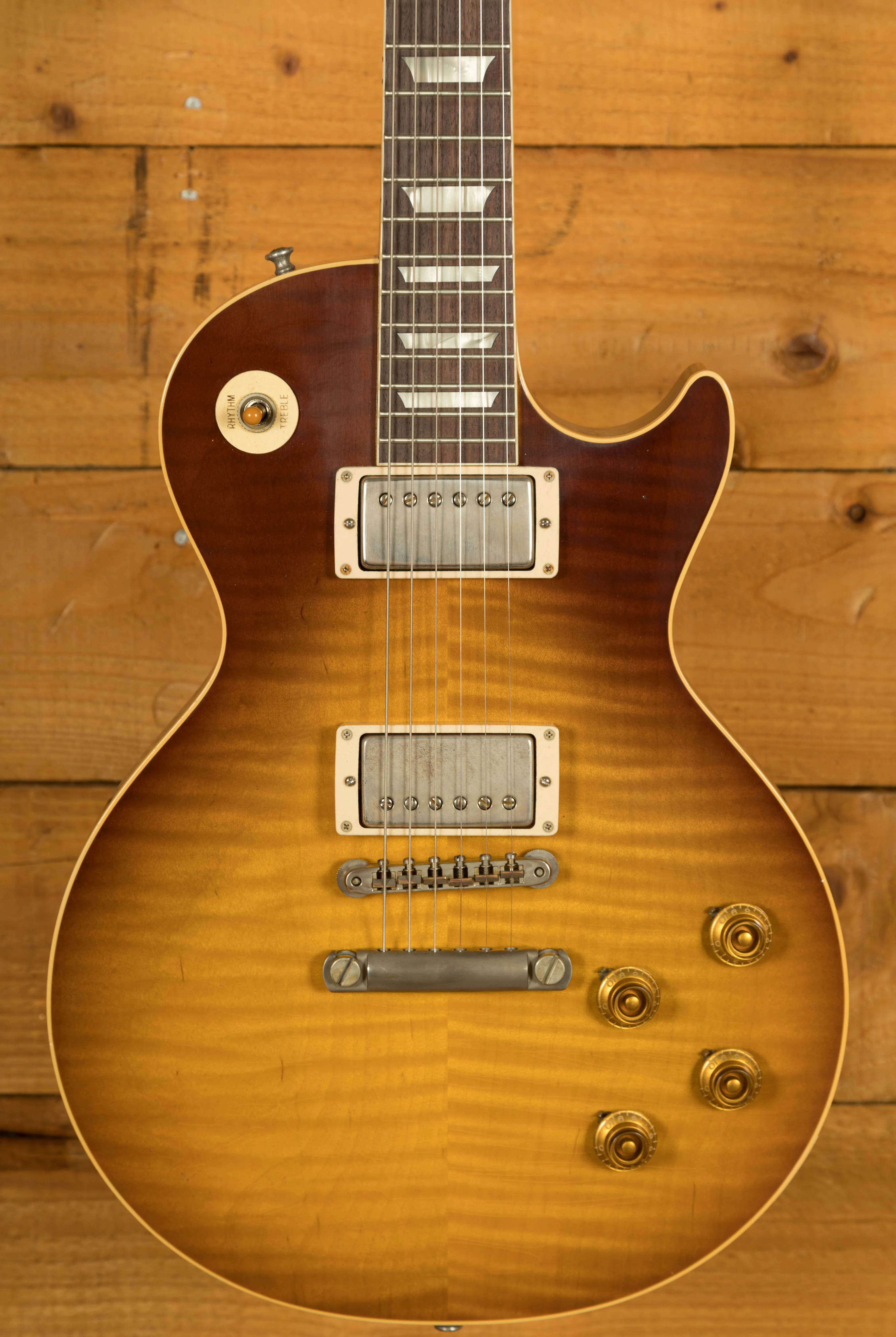 With a Mahogany body, this Les Paul benefits from a figured Maple top for the ultimate tonewood partnership. Rich and super resonant it offers premium tone and timeless aesthetics, while the Dark Ice Tea Fade Ultra Light Aged Nitro finish looks super unique and really allows the wood to breathe and the natural tone to sing through. The Murphy Lab do an incredible job of capturing the feel of a vintage instrument. With hide glue construction, this Les Paul offers true vintage tonality.