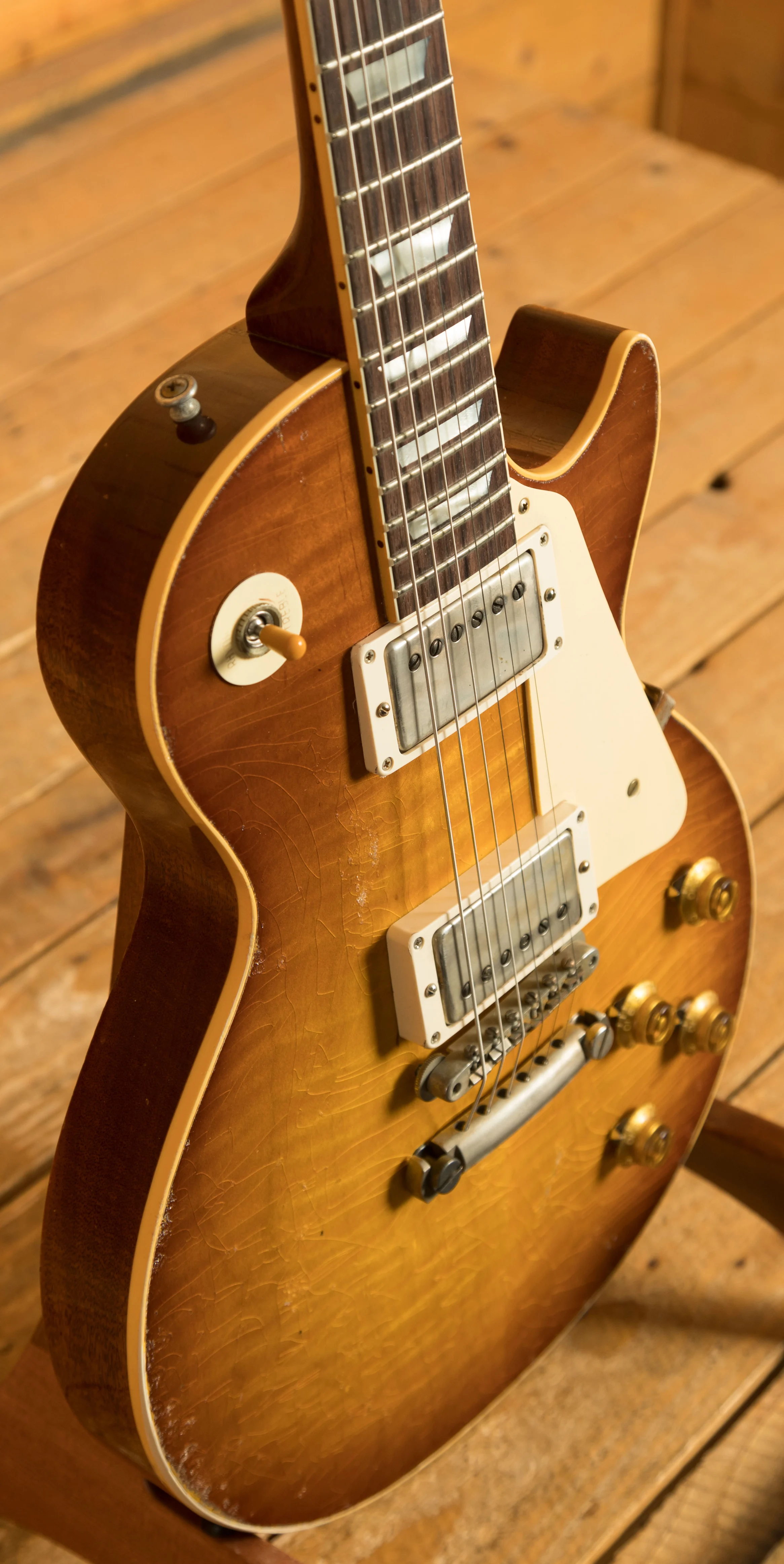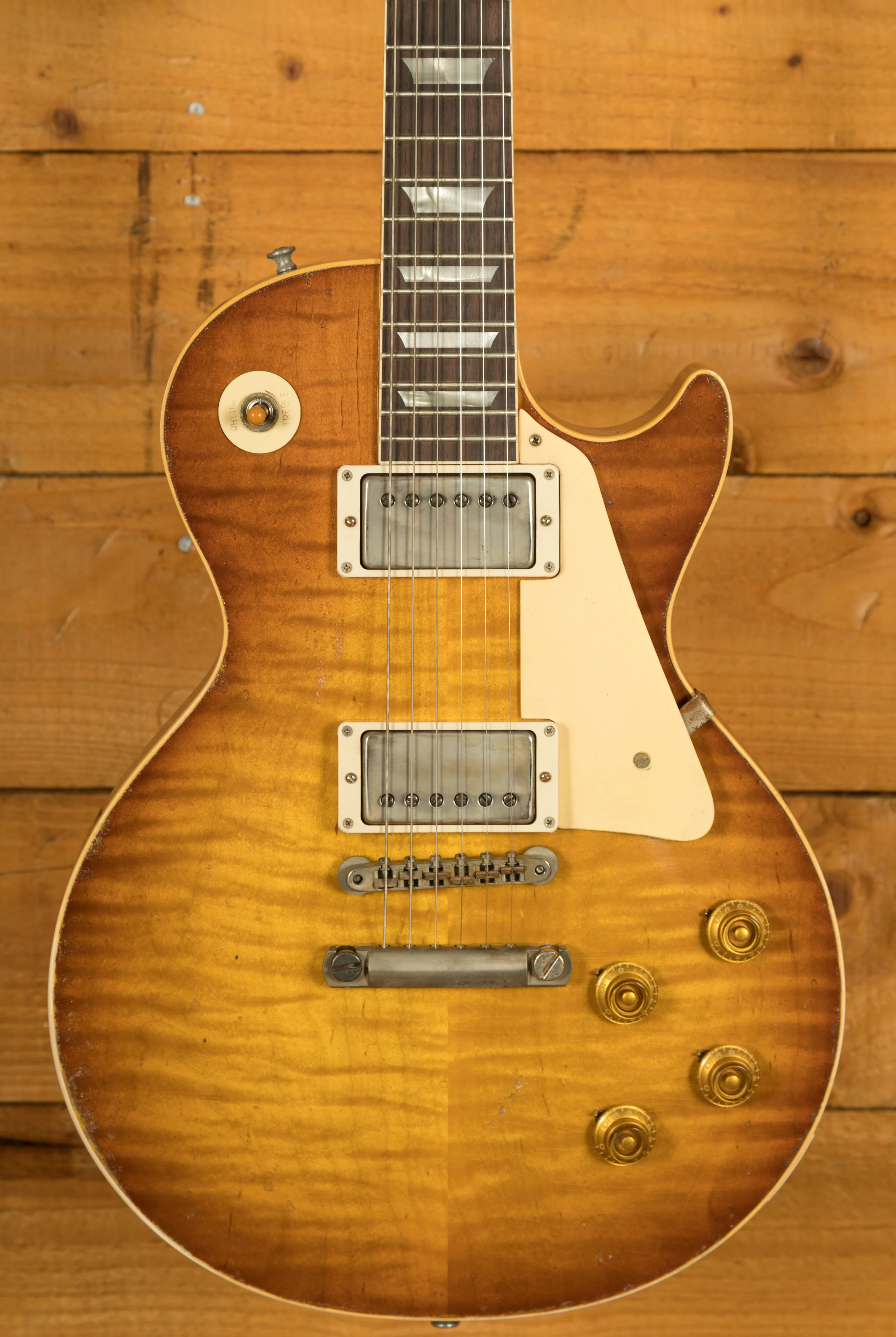 With a Mahogany body, this Les Paul benefits from a figured Maple top for the ultimate tonewood partnership.The figuring on this beauty is incredible. Rich and super resonant it offers premium tone and timeless aesthetics, while the Slow Iced Tea Fade Heavy Aged Nitro finish looks a million dollars and really allows the wood to breathe and the natural tone to sing through. The Murphy Lab do an incredible job of capturing the feel of a vintage instrument. With hide glue construction, this Les Paul offers true vintage tonality.