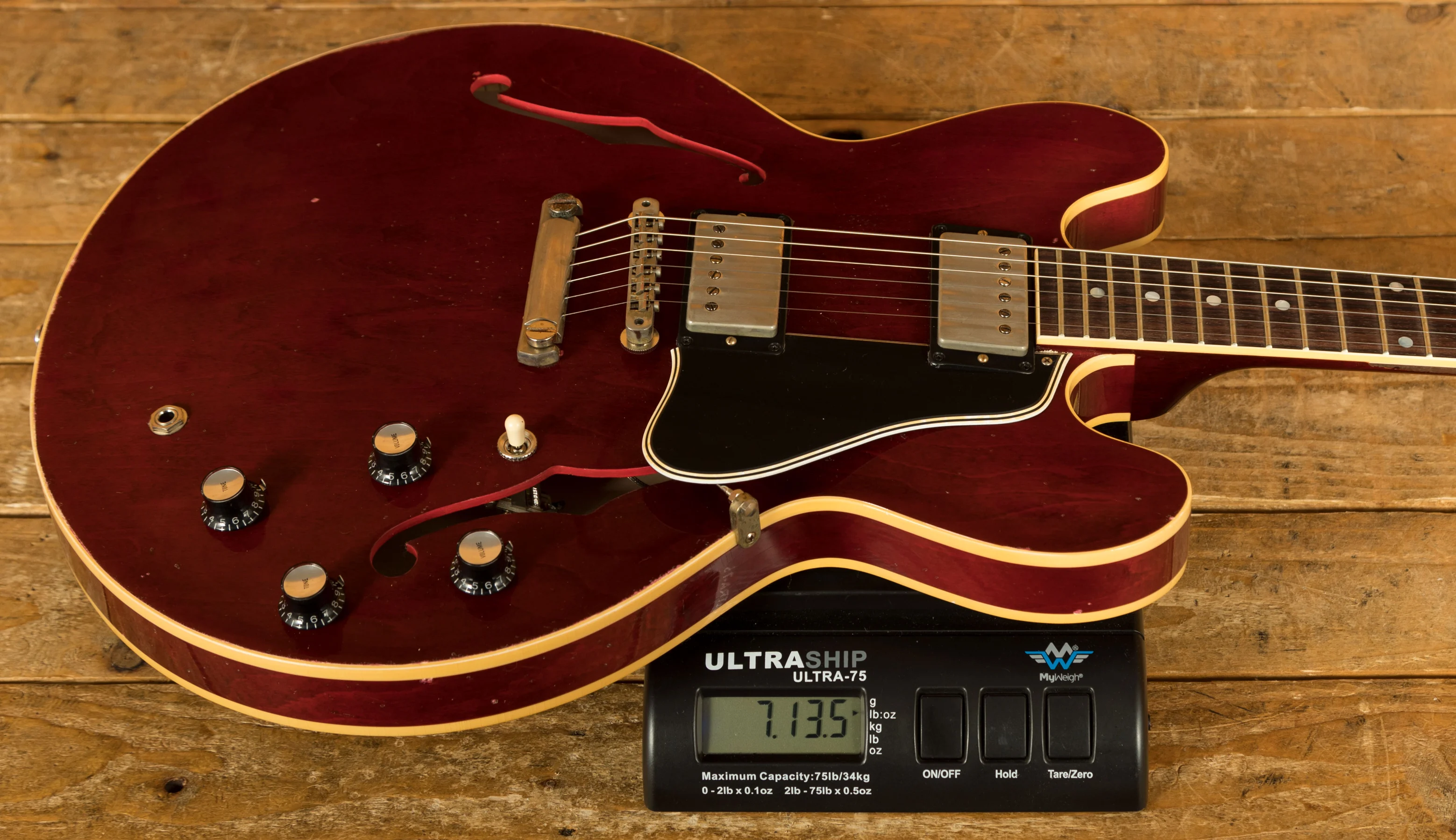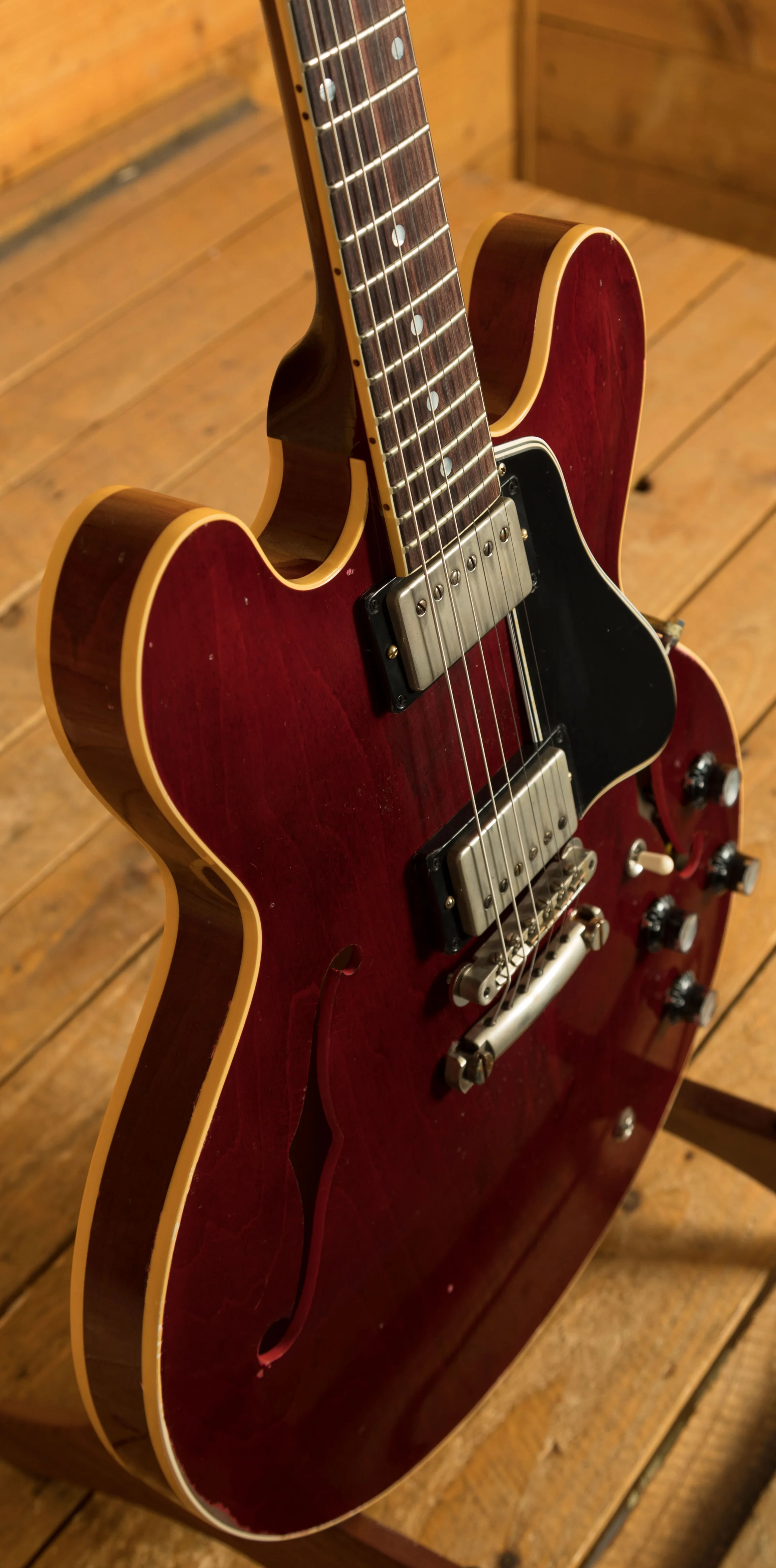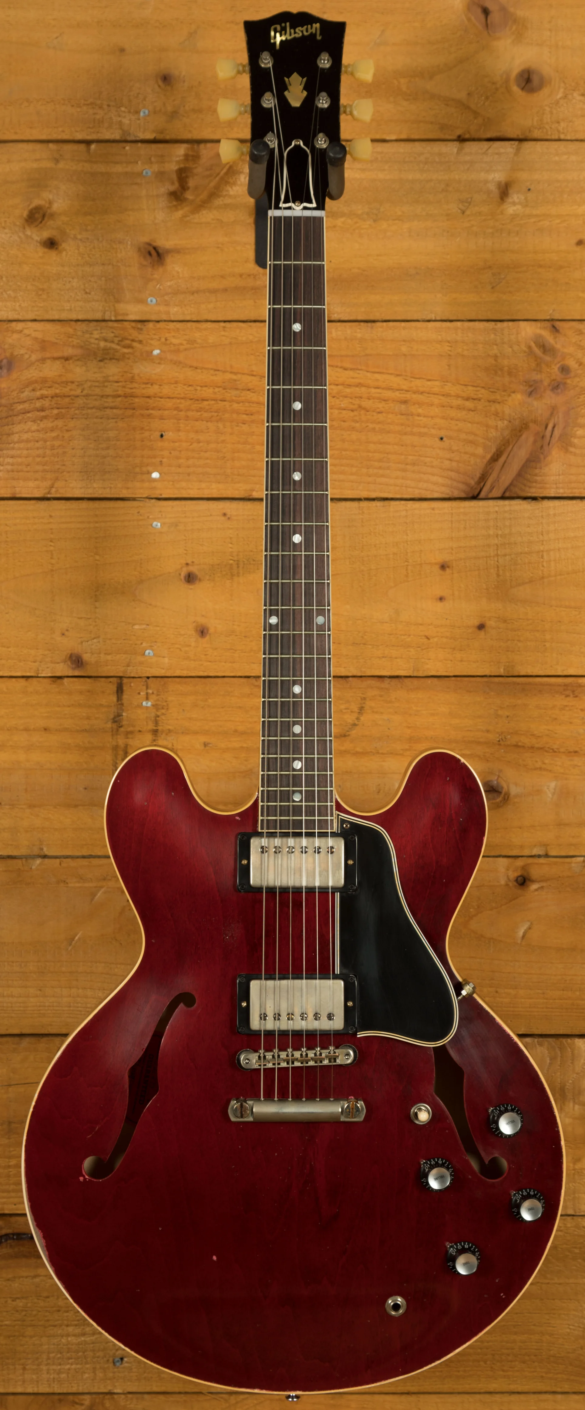 The neck is something special, crafted from Mahogany; it features a gorgeous Indian Rosewood fingerboard, embellished with Pearloid inlays. With 22 frets, 12" radius, 1.687" nut width and a 24.75" scale length it feels smooth and comfortable, equally at home playing slick lead work or heavy chord strumming thanks to the authentic '61 Skinny "C" profile. With hide glue construction, this 335 offers true vintage tonality.