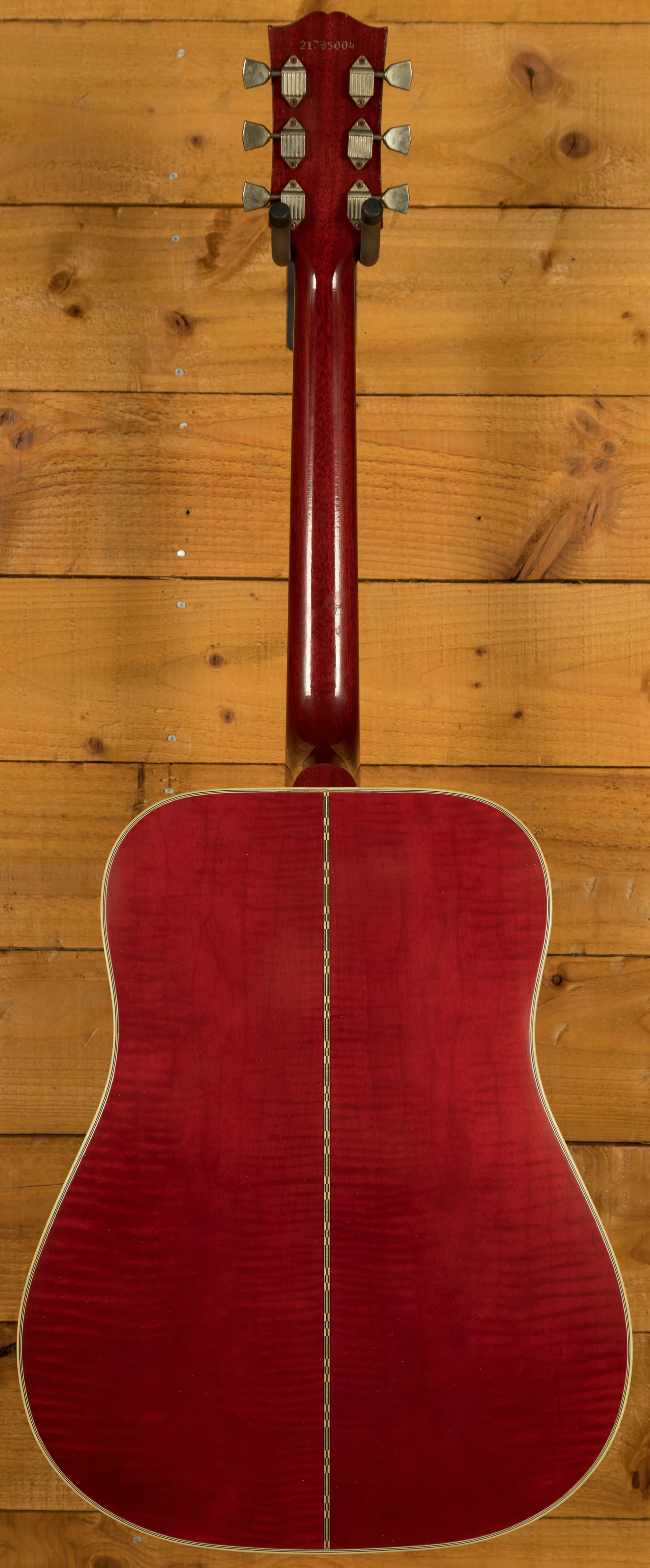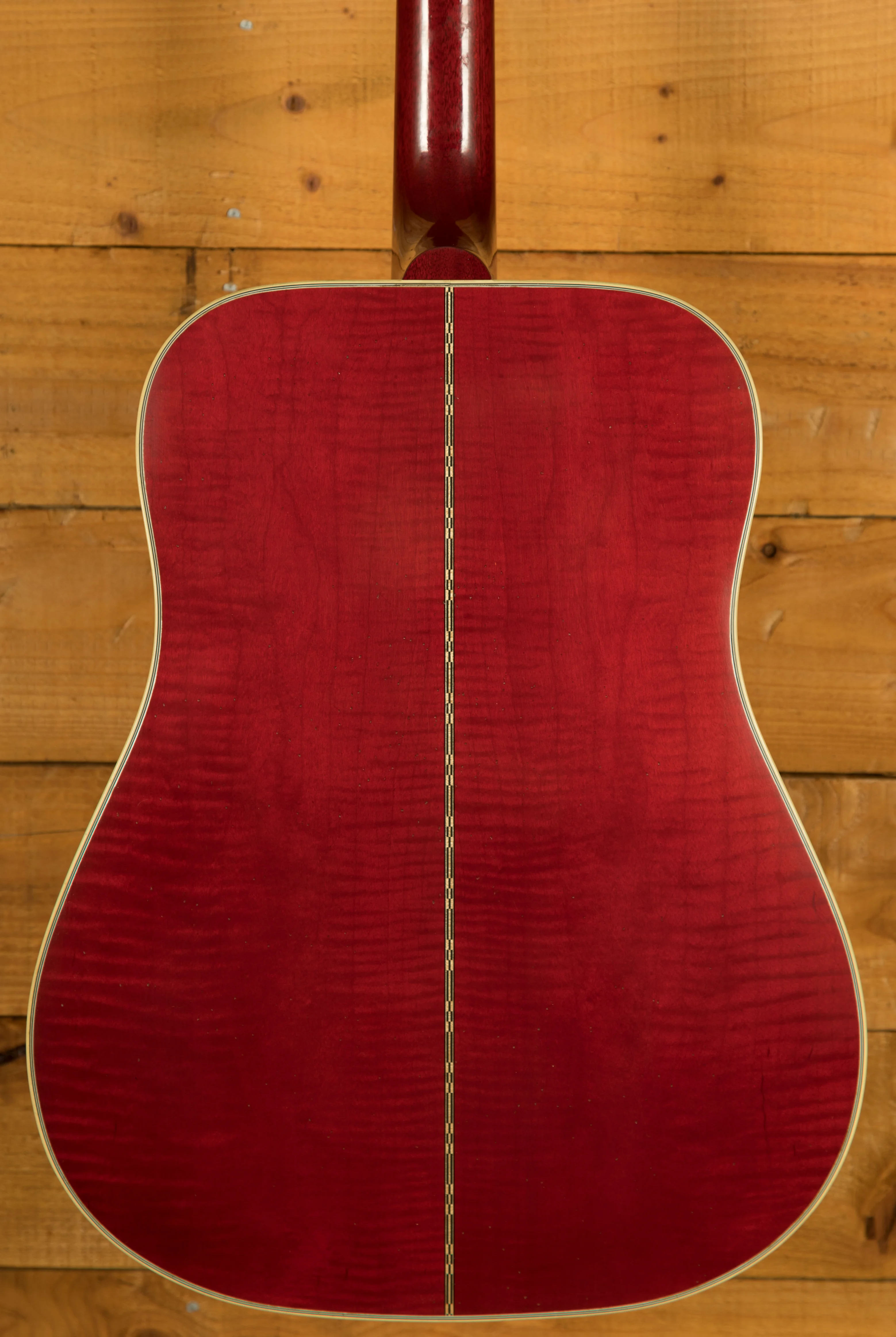 The 1963 Dove features a Thermally Aged Sitka Spruce top, alongside Flame Maple back & sides. Together, they create a bright, lively tone with loads of character and punchy! These tonal characteristics are further enhanced by the traditional x-bracing, which allows the top to vibrate and resonate effectively. The Dark Natural top and Cherry back and sides looks awesome and nail that early 60s vibe. The nitrocellulose finish has been beautifully aged by the highly skilled Murphy Lab team. They have done an incredible job at making this guitar both look, and sound old right out the case. The instantly identifiable Dove pickguard is decorated with stamped vines and flowers and a mother-of-pearl dove.