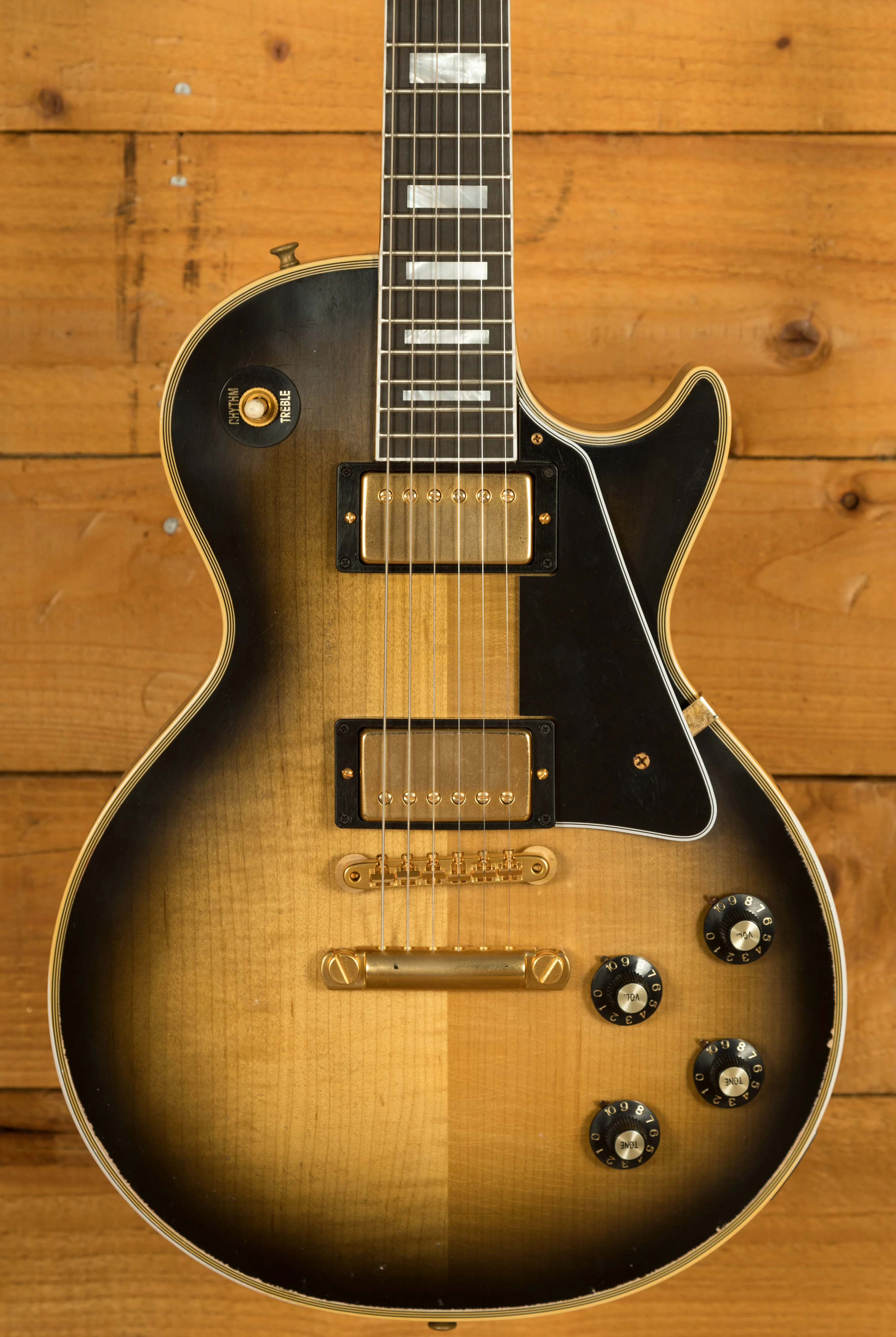 This guitar features a traditional tone wood pairing of a Mahogany body, and a Maple top. As Les Paul Customs traditionally feature all solid finishes this guitar features a plain grain Maple top, which can also be found on ’58 Bursts and Gold top models. One of the most exciting features of this model is the Argetine Grey finish. It’s a really unique take on the classic sunburst, it looks great in our pictures, but even better in person. It’s the sort of finish which still looks traditional, but also eye-catching. The Murphy Lab team have done an incredible job with the ageing on this model. The nitrocellulose finish features some prominent lacquer checking across the whole guitar, some minor dings, and tarnished hardware.