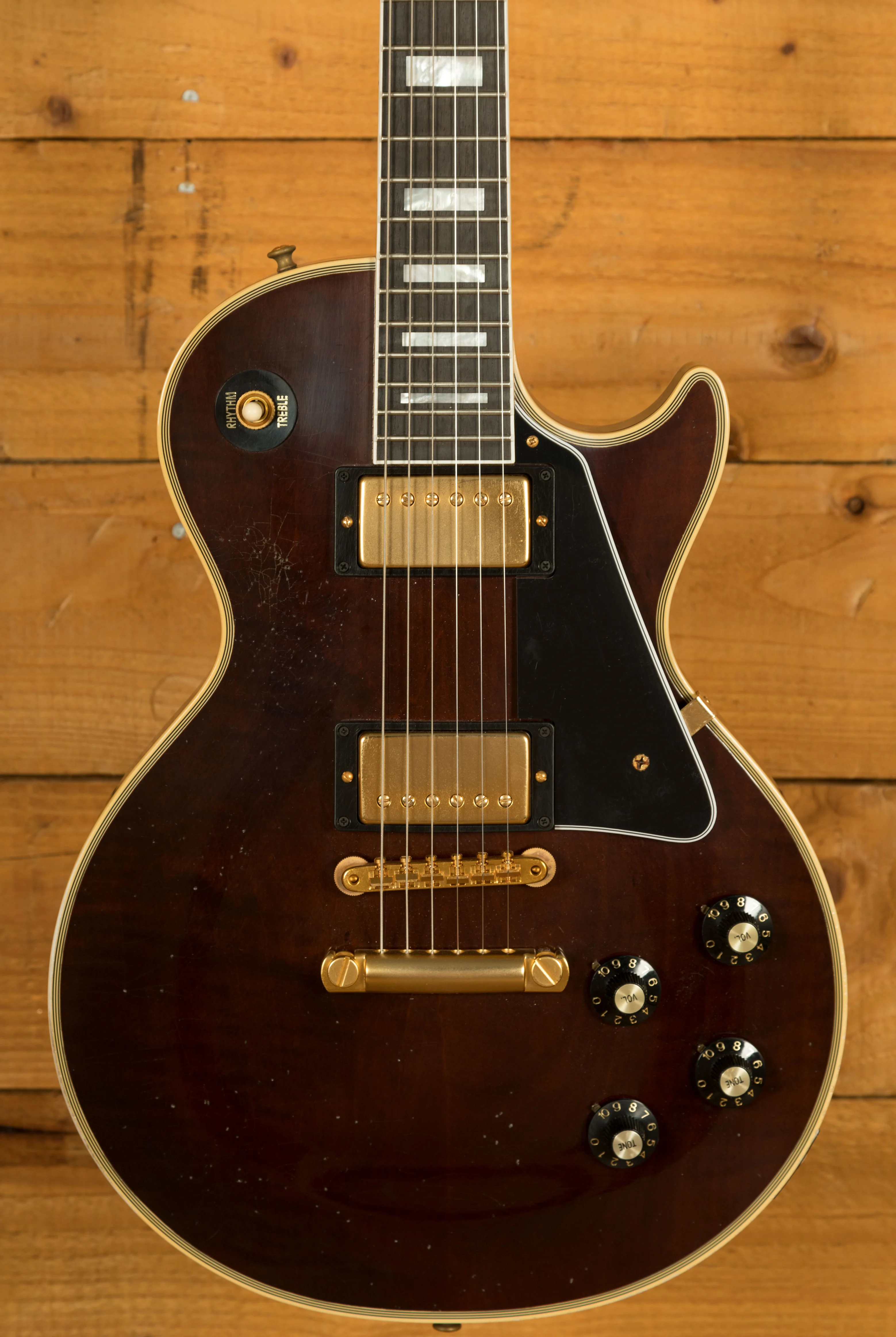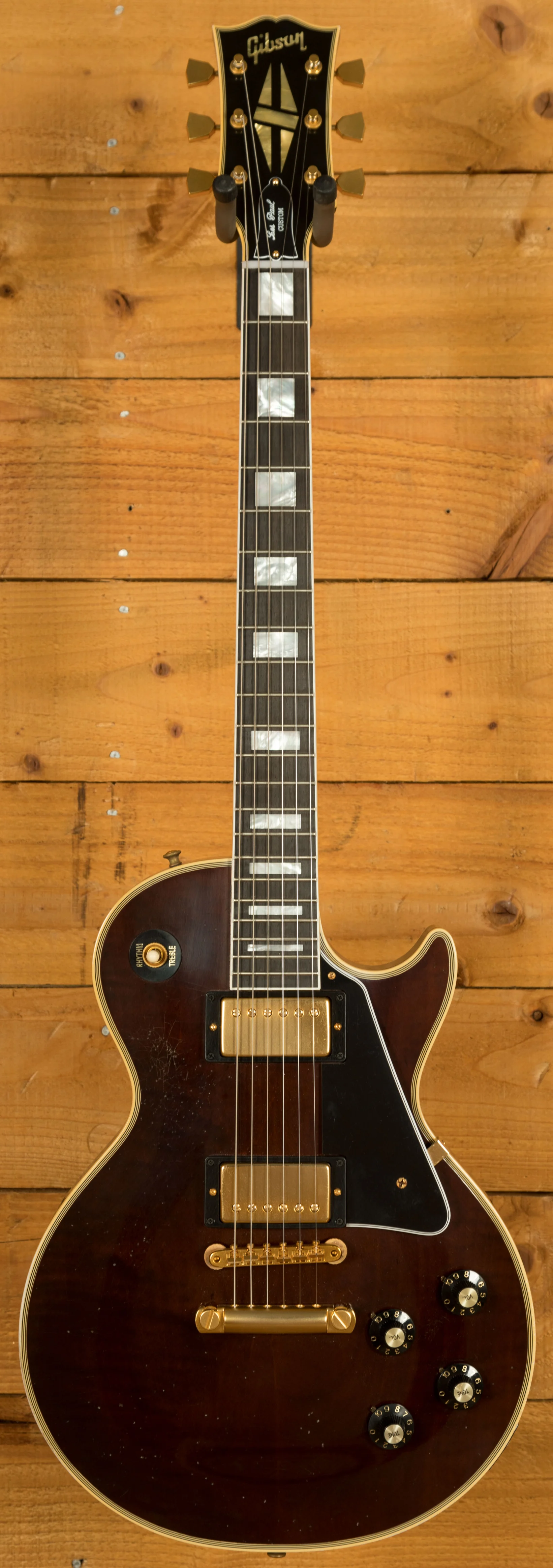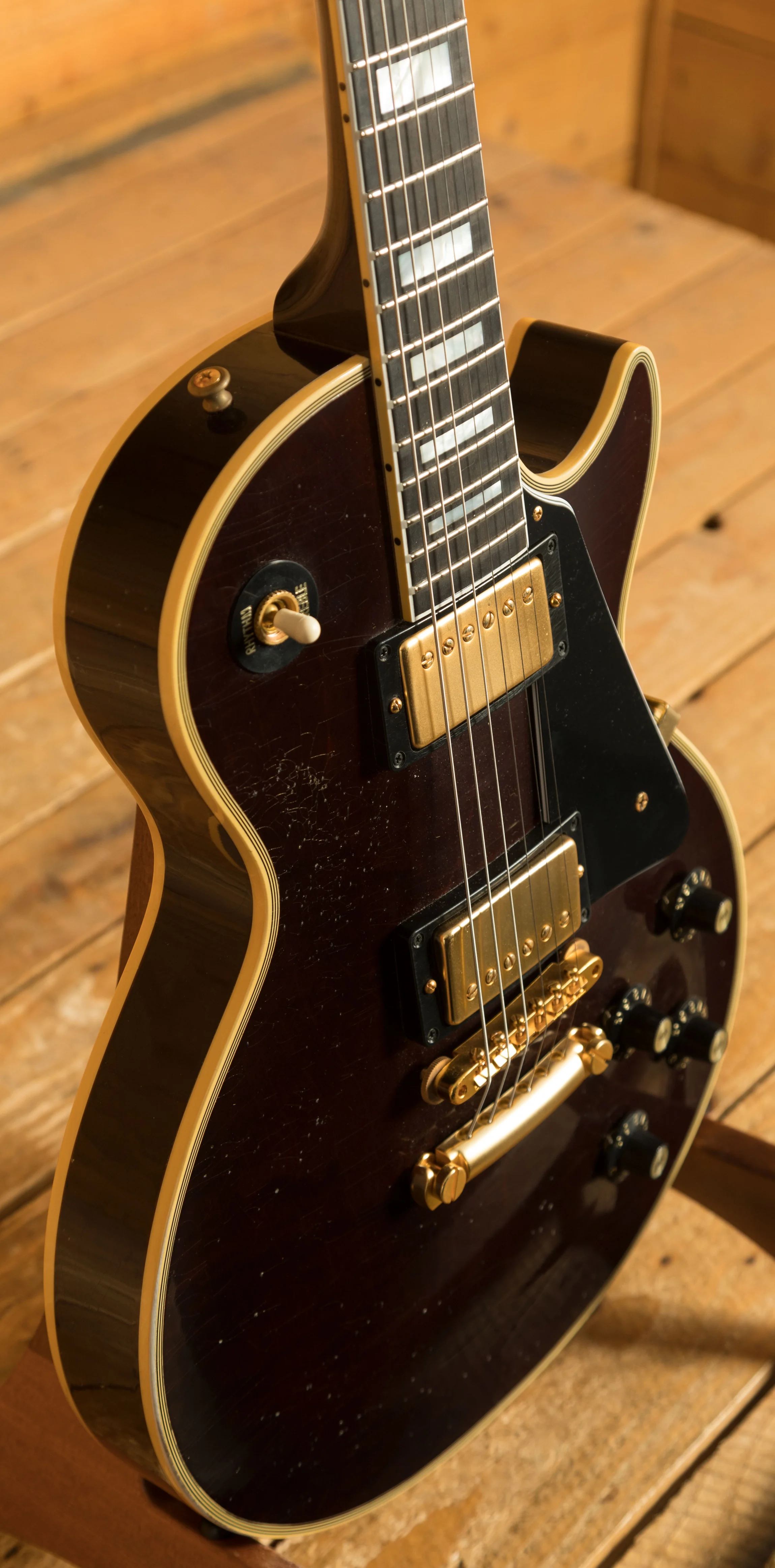 This guitar features a traditional tone wood pairing of a Mahogany body, and a Maple top. As Les Paul Customs traditionally feature all solid finishes this guitar features a plain grain Maple top, which can also be found on ’58 Bursts and Gold top models. One of the most exciting features of this model is the Dark Walnut finish. It’s a really deep, rich colour which looks awesome in the flesh. It’s the sort of finish which still looks traditional, but also eye-catching. The Murphy Lab team have done an incredible job with the ageing on this model. The nitrocellulose finish features some prominent lacquer checking across the whole guitar, some minor dings, and tarnished hardware.