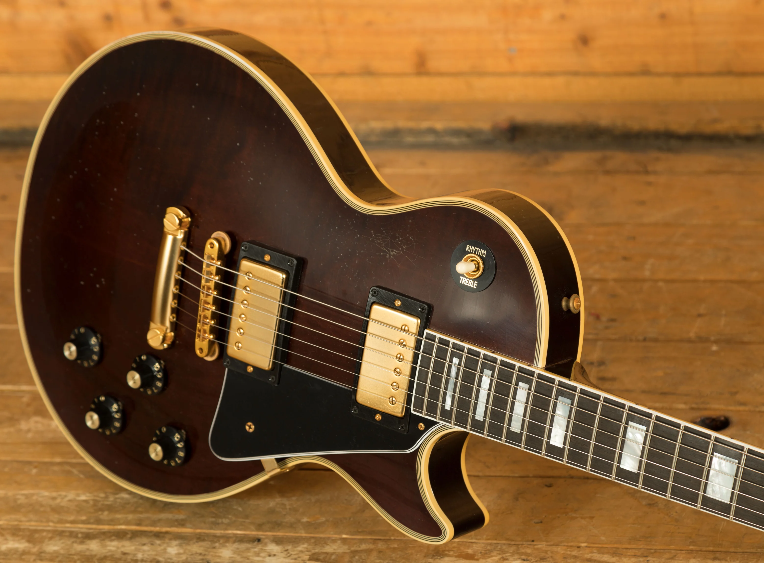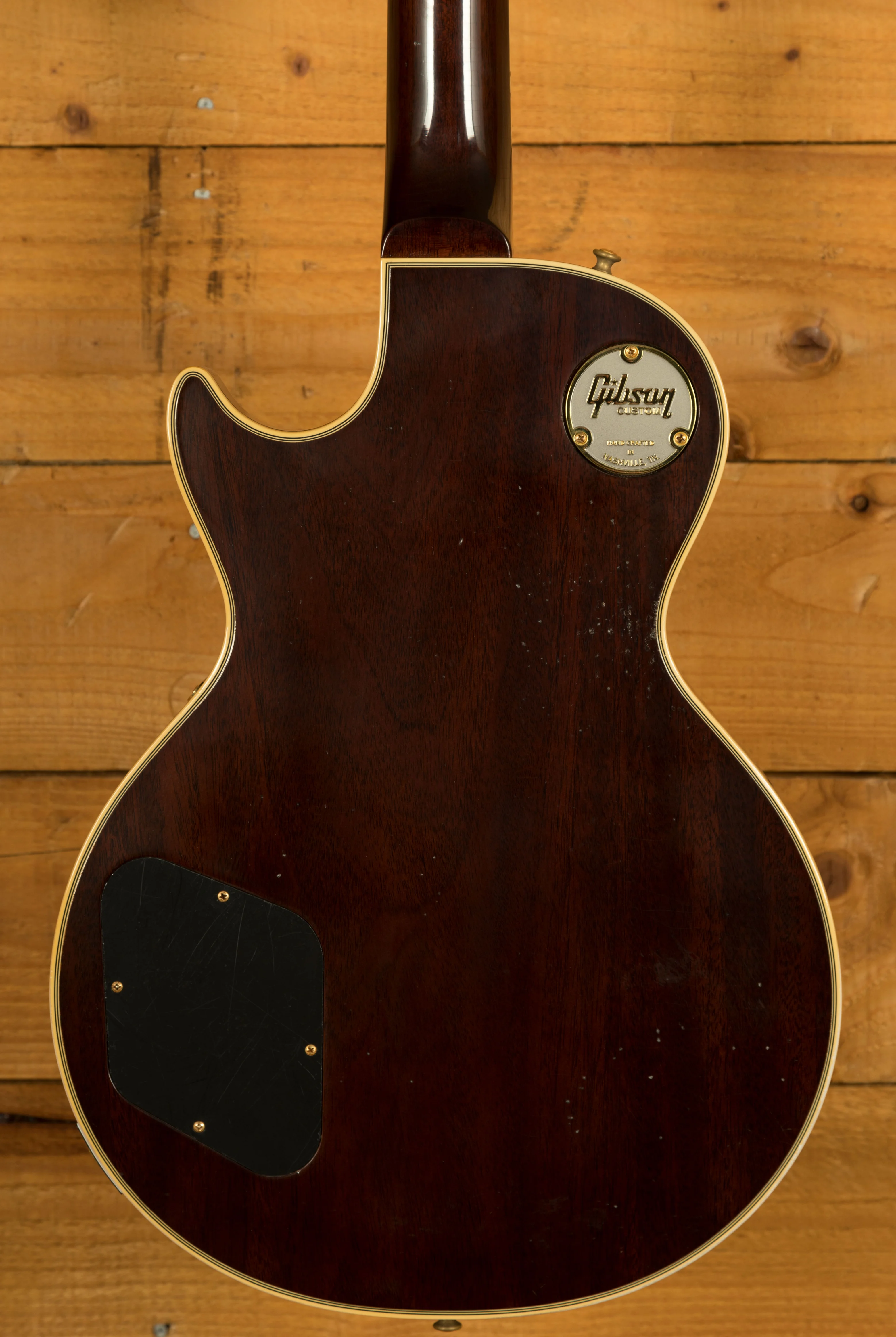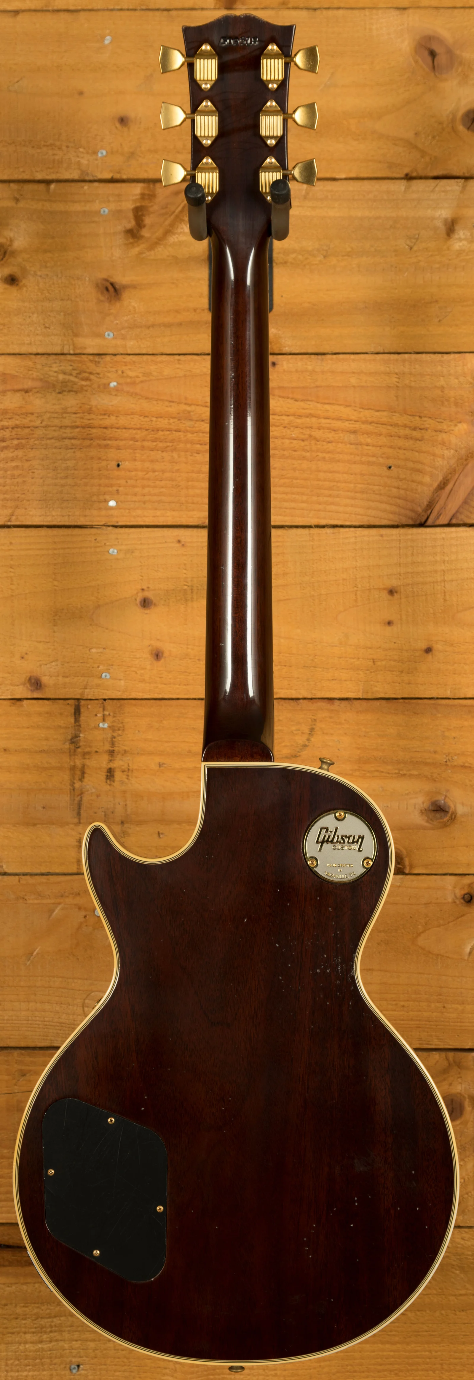 This guitar features a traditional tone wood pairing of a Mahogany body, and a Maple top. As Les Paul Customs traditionally feature all solid finishes this guitar features a plain grain Maple top, which can also be found on ’58 Bursts and Gold top models. One of the most exciting features of this model is the Dark Walnut finish. It’s a really deep, rich colour which looks awesome in the flesh. It’s the sort of finish which still looks traditional, but also eye-catching. The Murphy Lab team have done an incredible job with the ageing on this model. The nitrocellulose finish features some prominent lacquer checking across the whole guitar, some minor dings, and tarnished hardware.