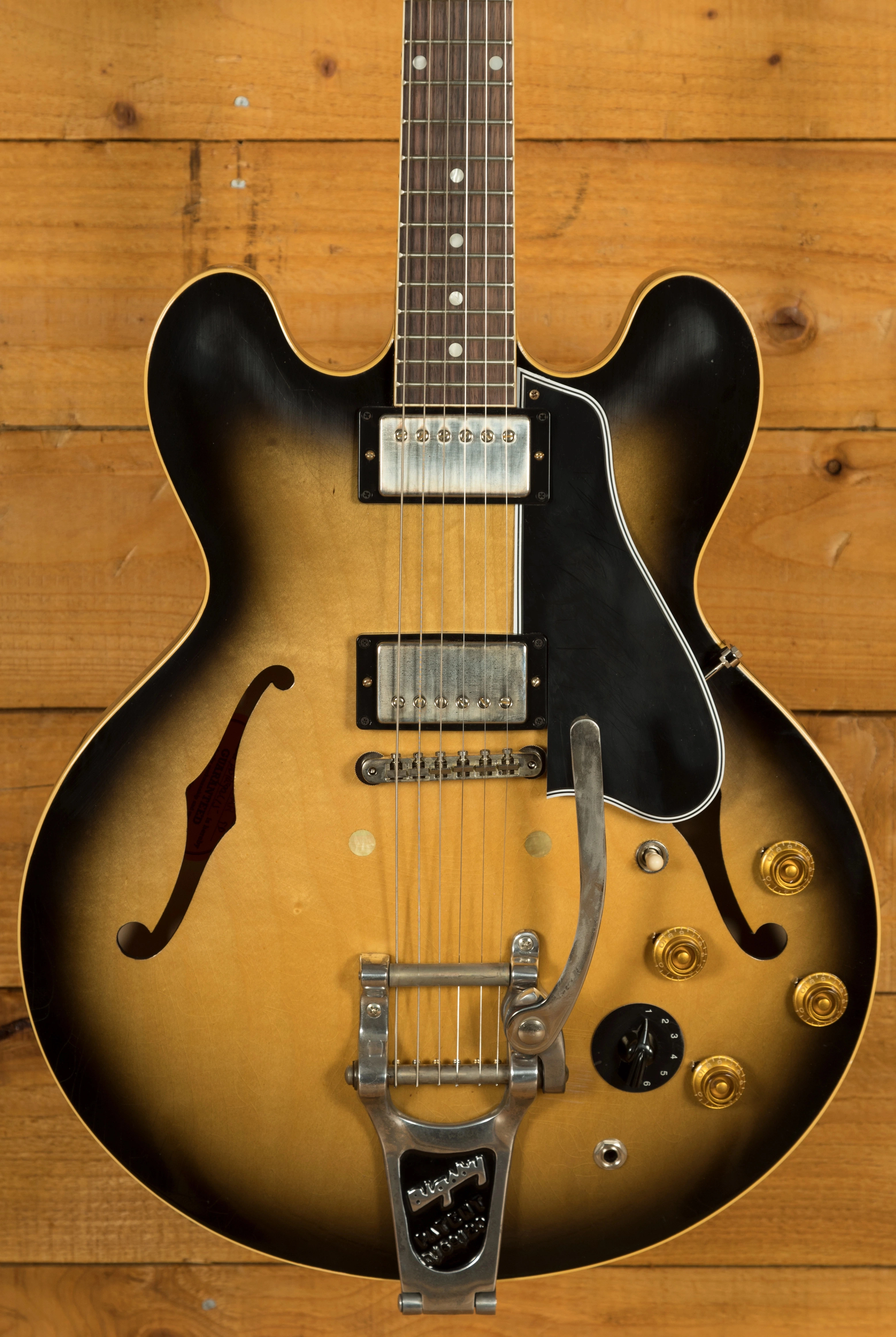 With a 3-ply Maple/Poplar/Maple construction finished in Argentine Grey it looks super slick. The original guitar used at Live at the Regal was a custom order 59 ES-335 which featured a few features not usually found on production guitars at the time such as the factory fitted Bigsby and Varitone switch.